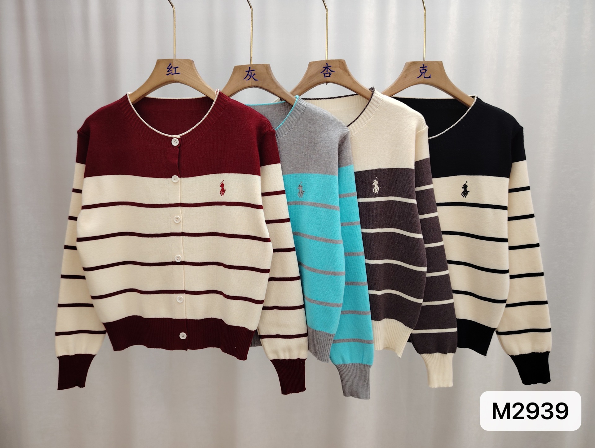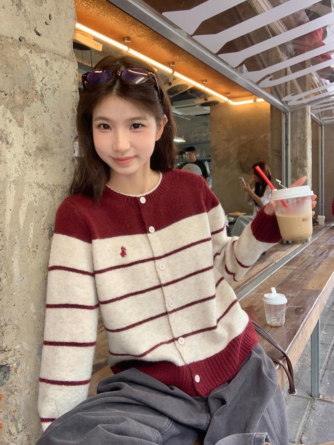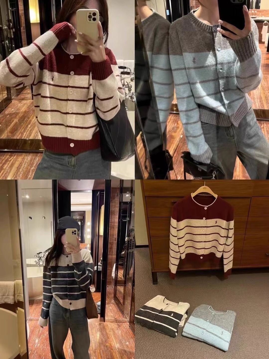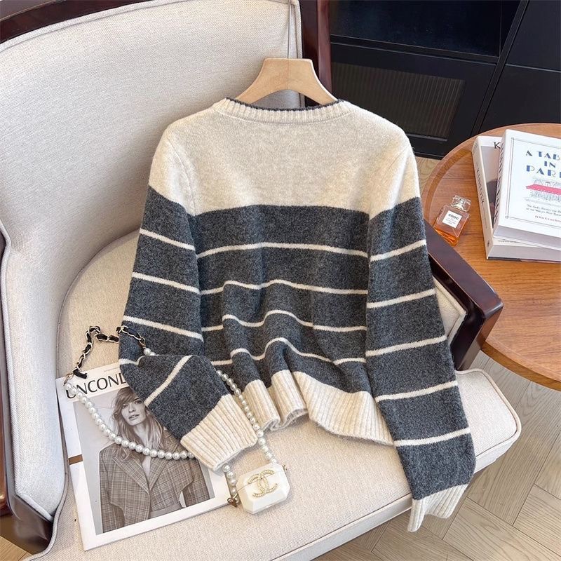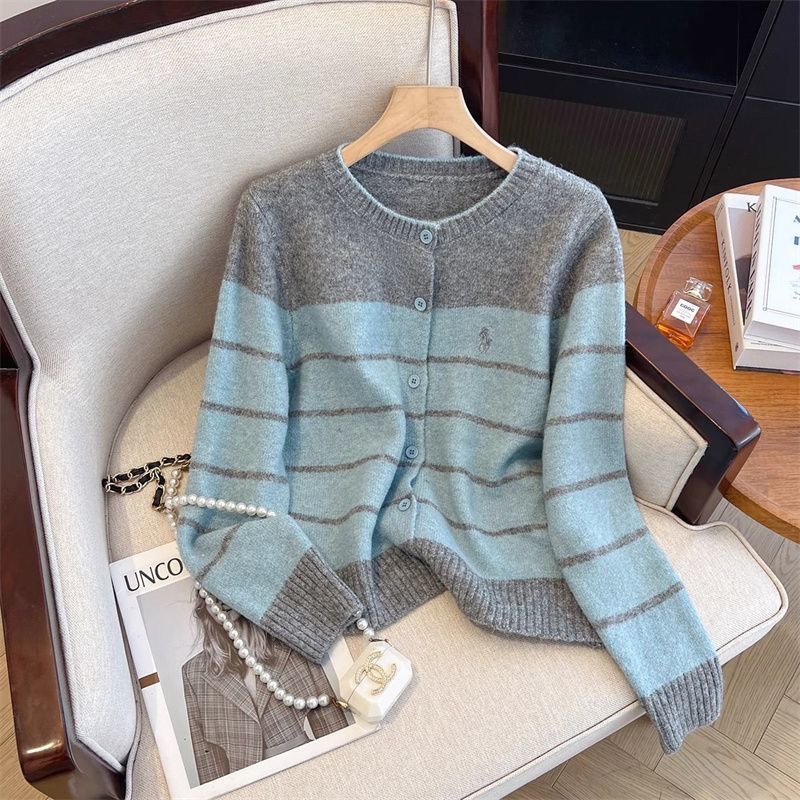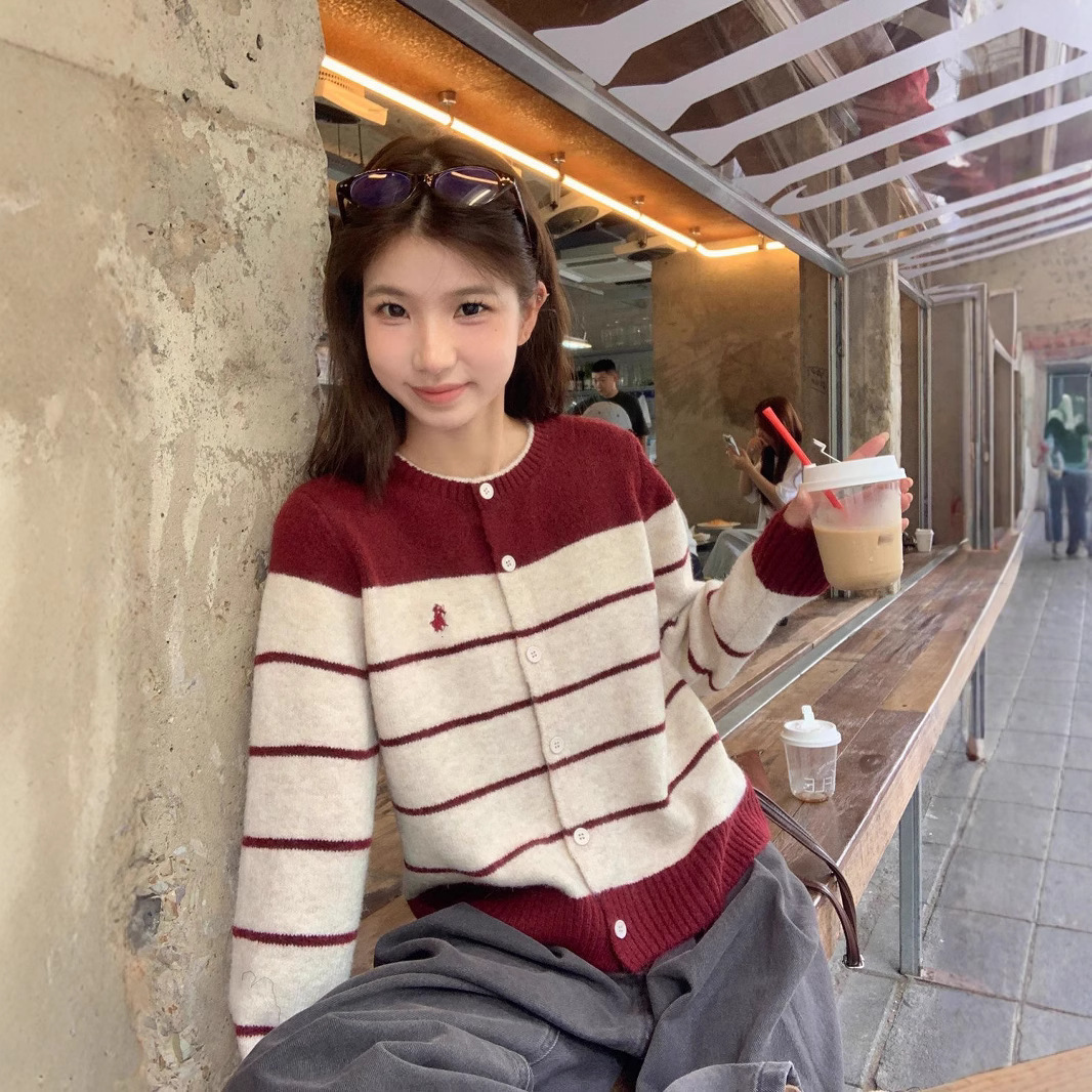 레트로 스타일 스웨터 자수 새 스웨터 카디건 라운드 넥 스트라이프 코트 스트라이프 루즈 한국 스타일 다용도 탑