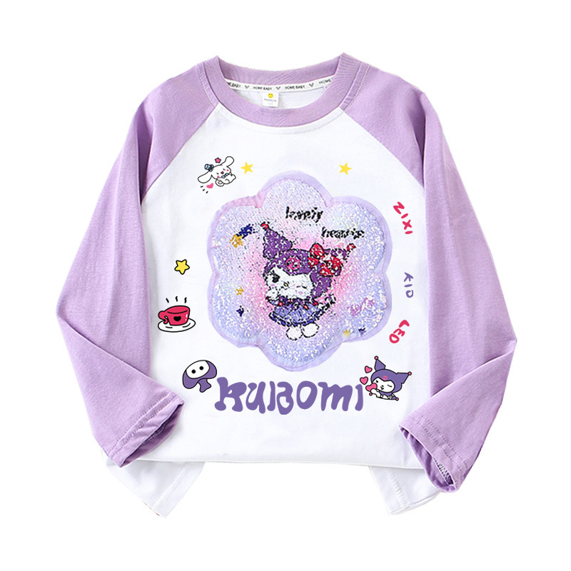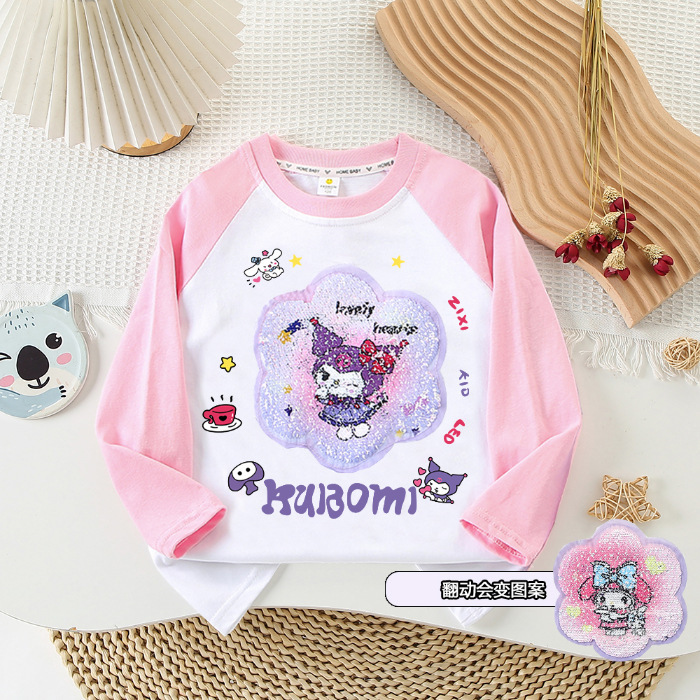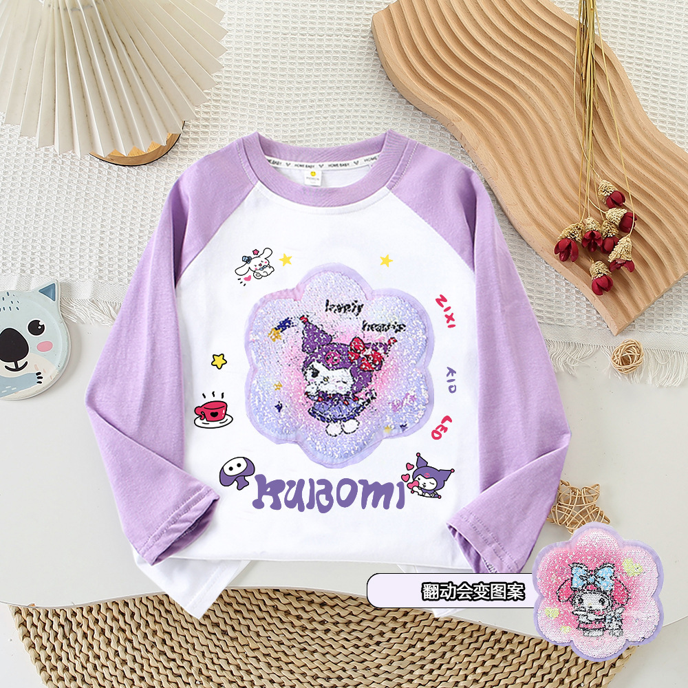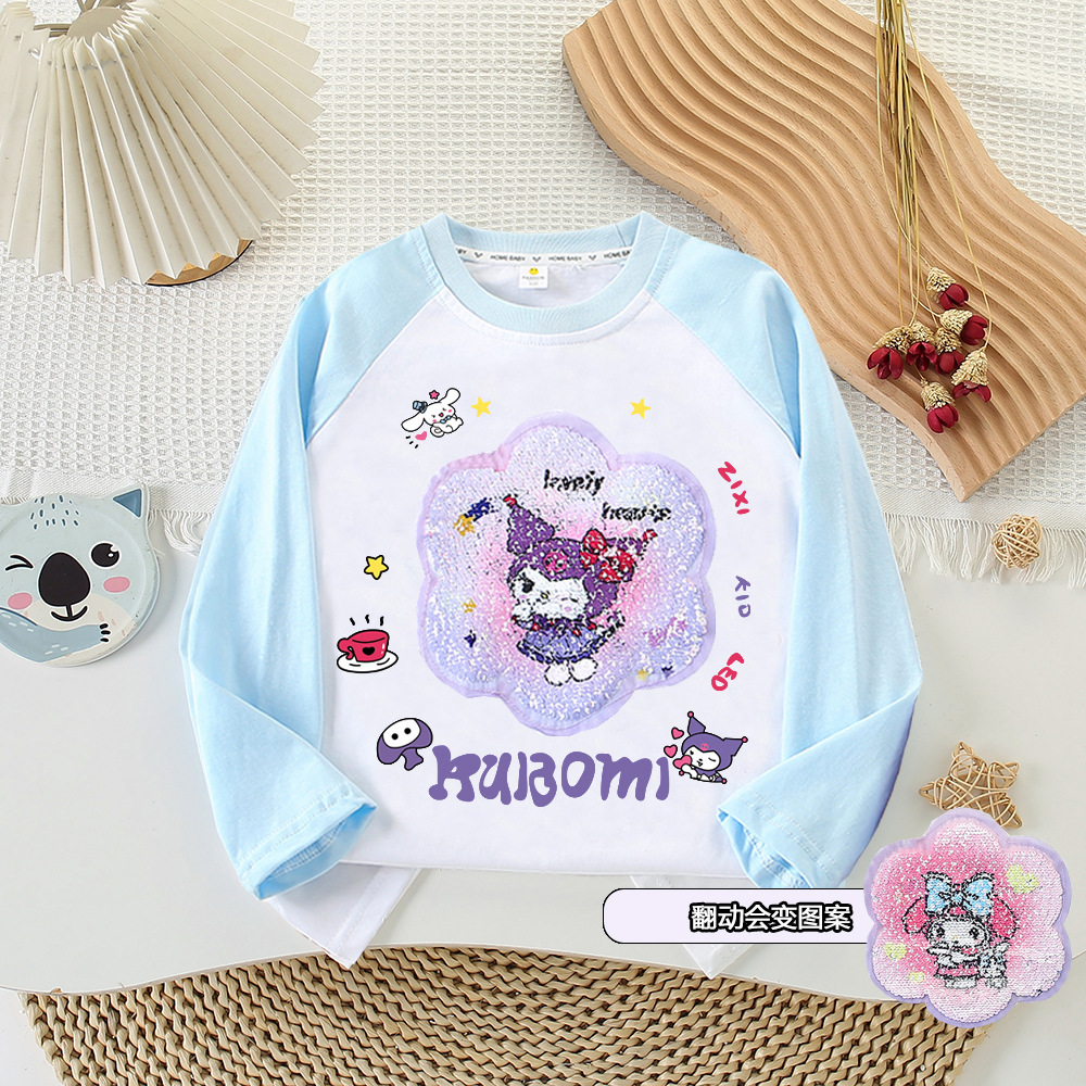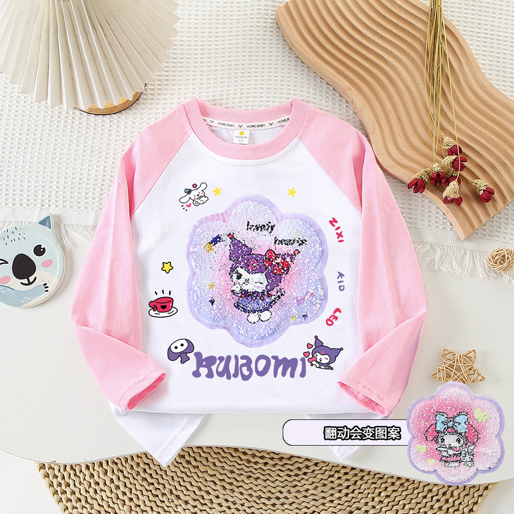 여아 초가을 쿠로미 100면 컬러 스플라이싱 긴팔 봄, 가을 프린트 쿨 스팽글 플립 바텀 탑
