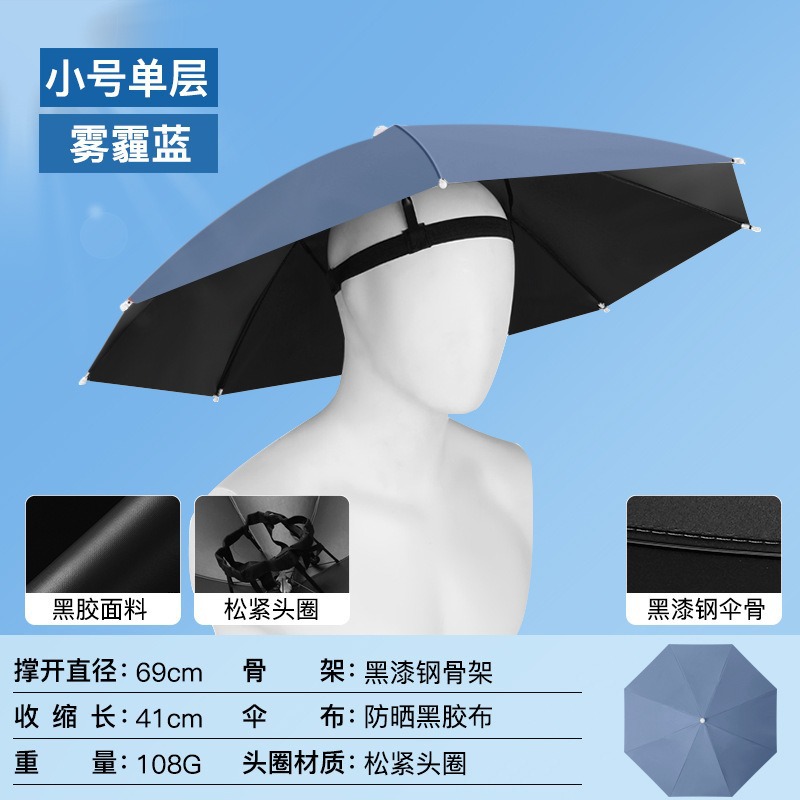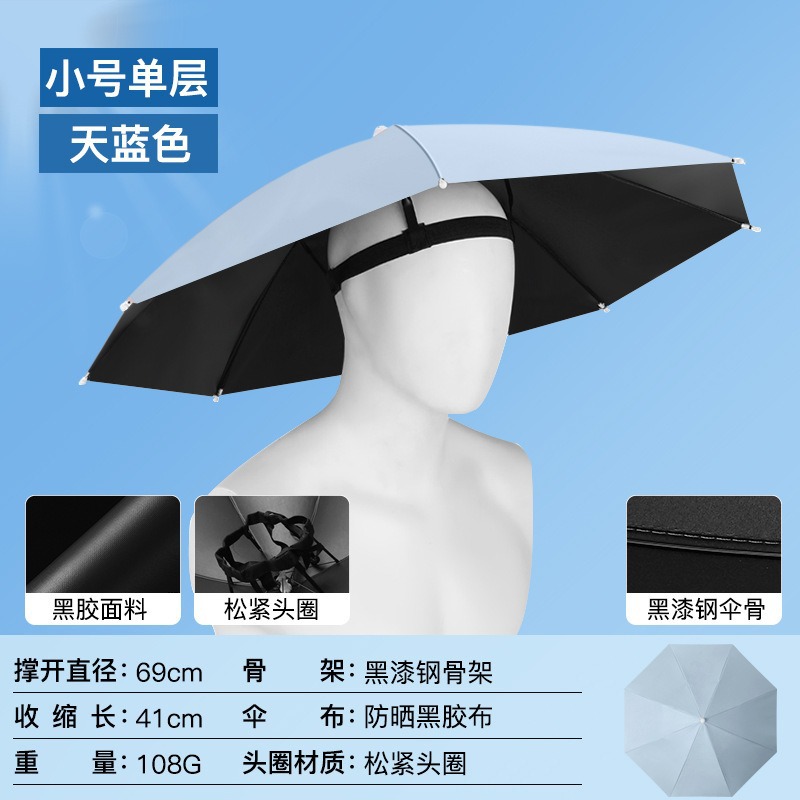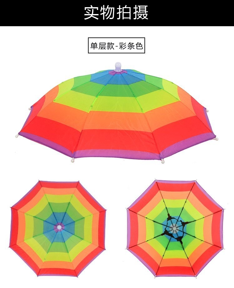 产品介绍:本产品适合于外出旅游,户外活动。伞面撑开儿童可用于挡雨。晴天可以遮阳。不用手扶,方便实用。戴头上舒服,不勒,不咯!是居家旅游,户外活动,钓鱼消遣,必备产品!!欢迎选购。