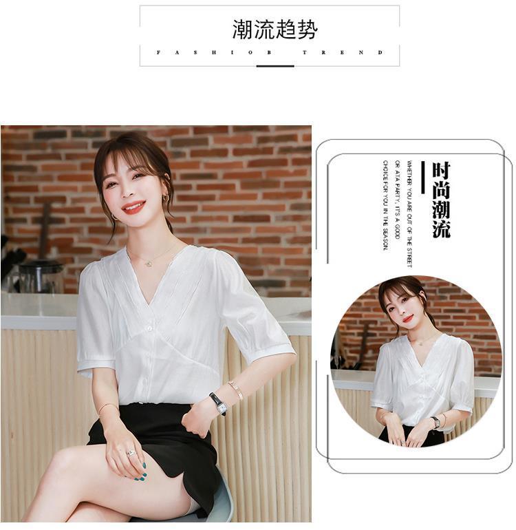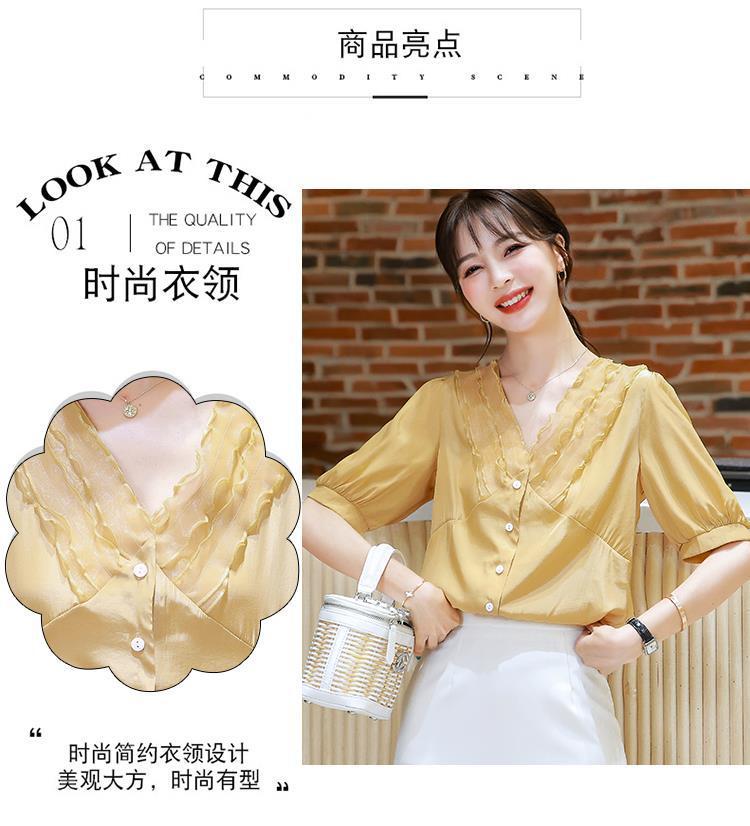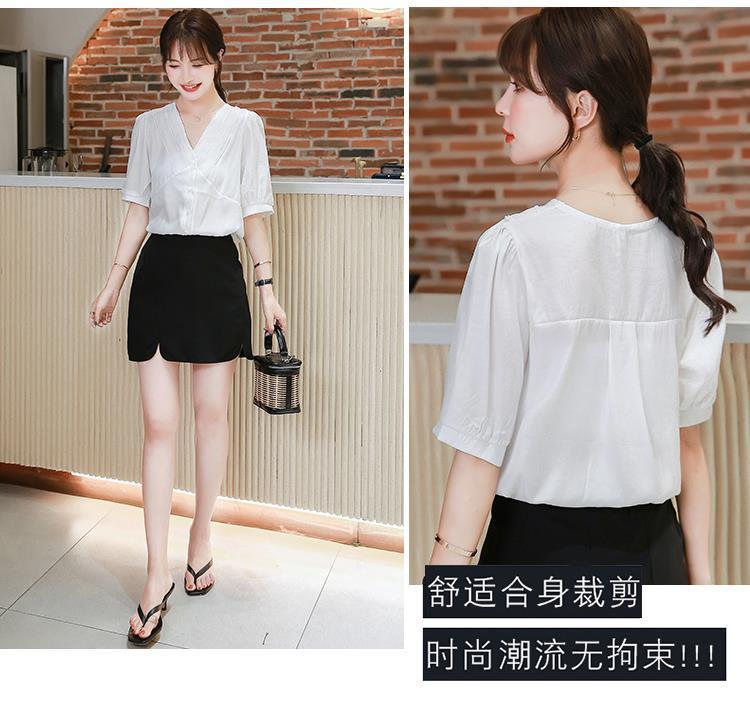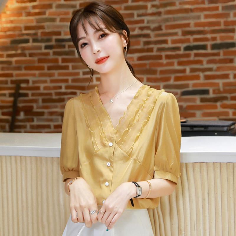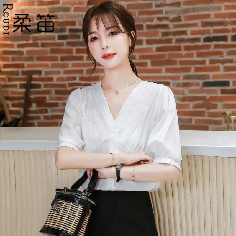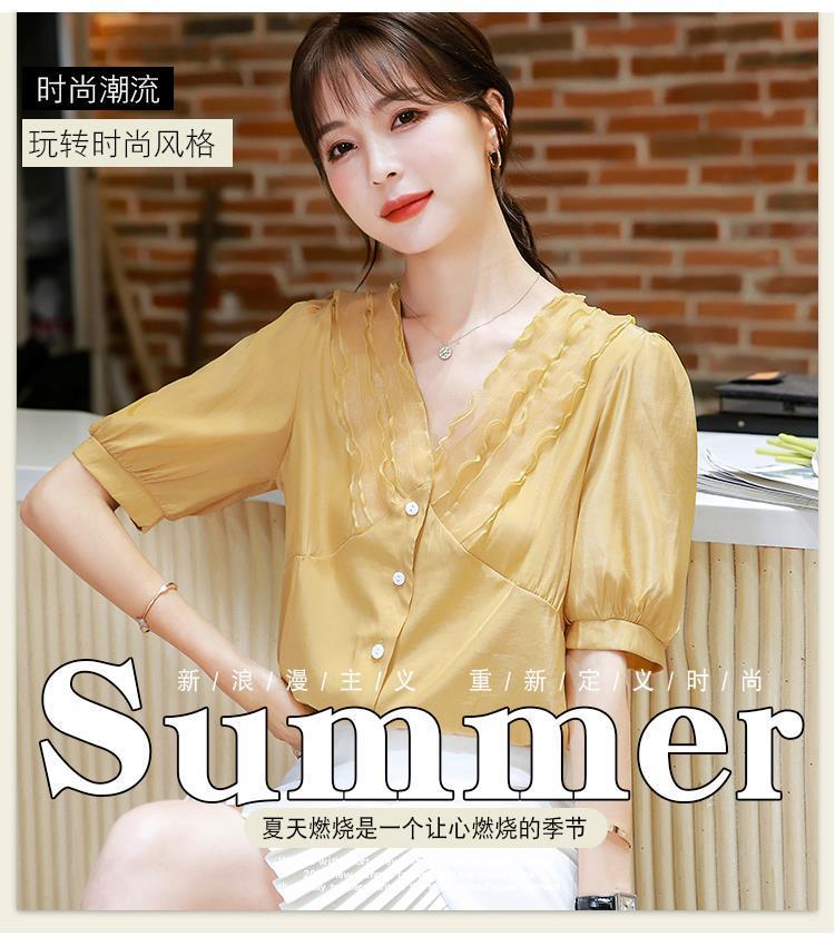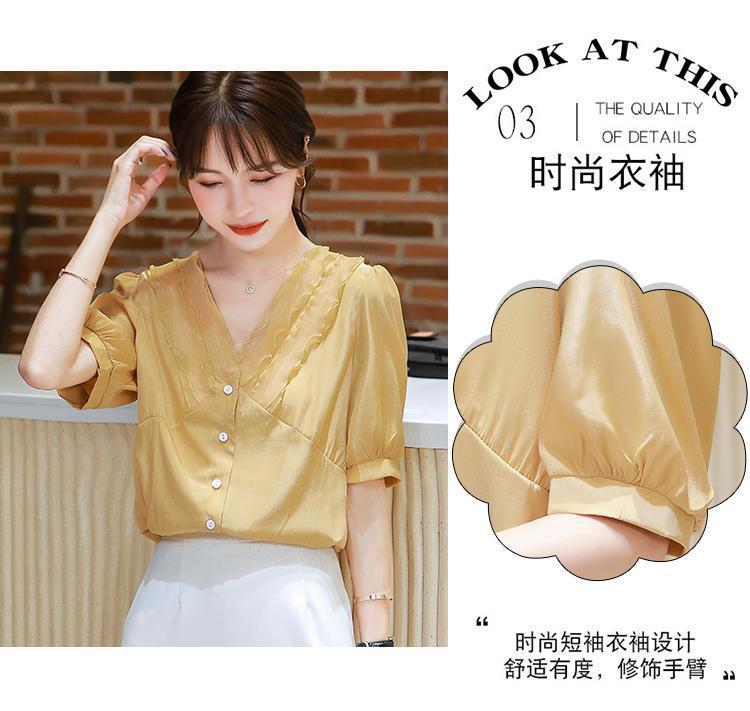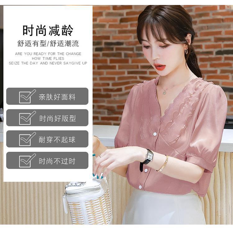 여성용 쉬폰 셔츠 여름 2024 새로운 여름 슈퍼 요정 스위트 탑 아름다운 V 넥 셔츠 서양식 연령 감소스토어 가기
