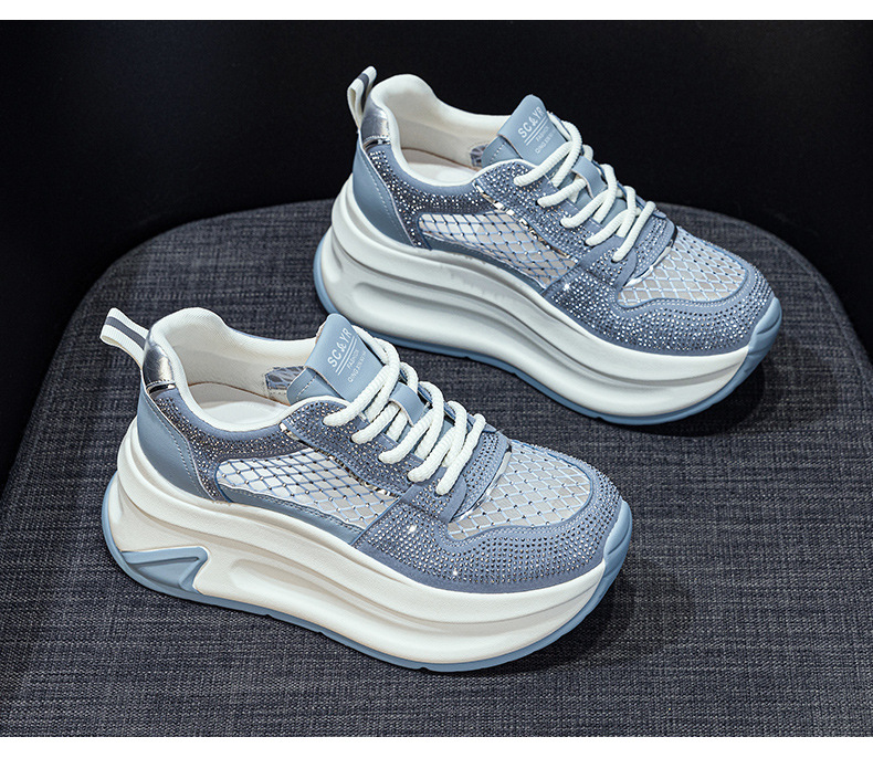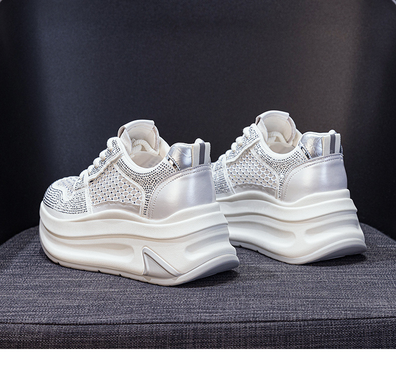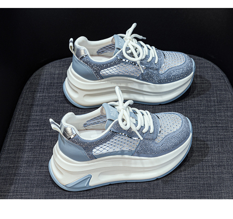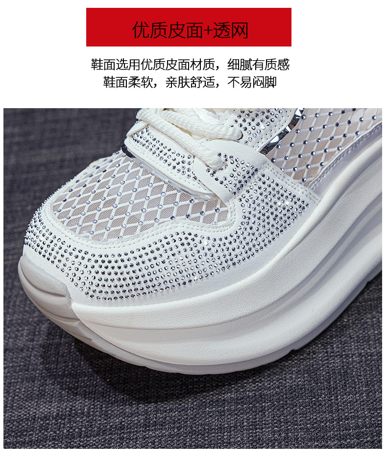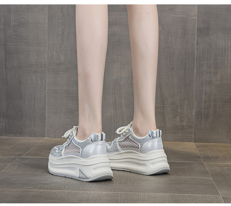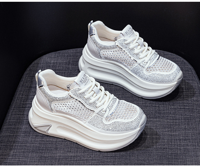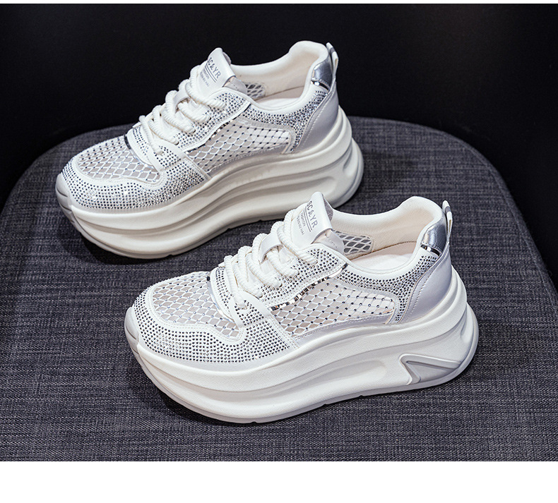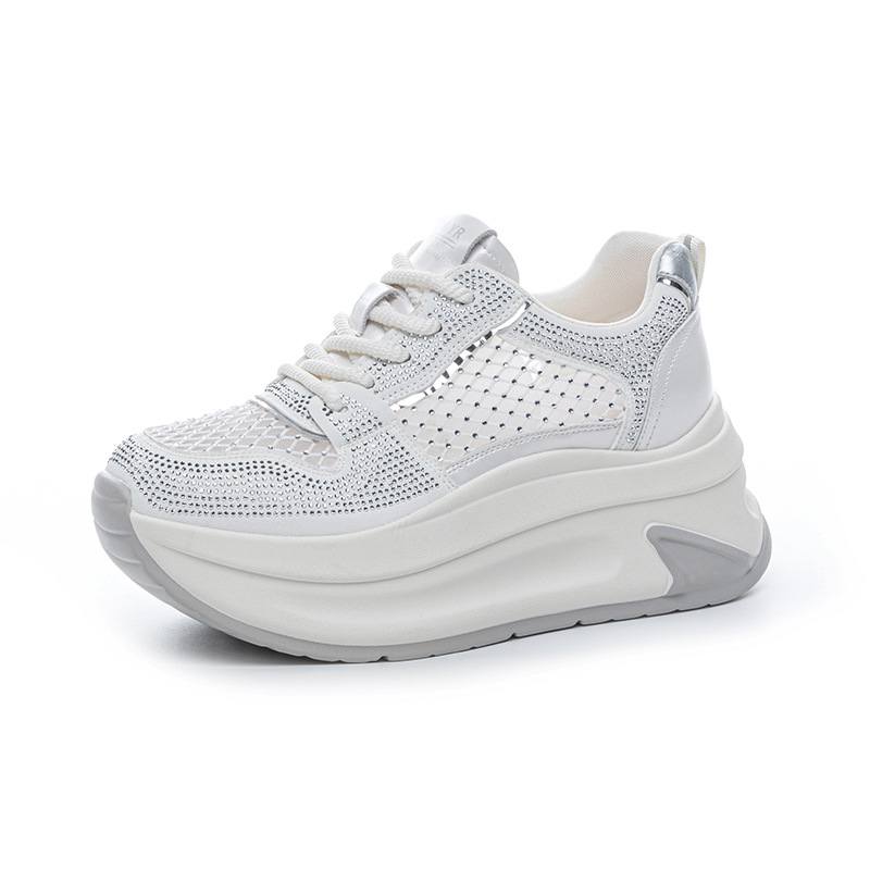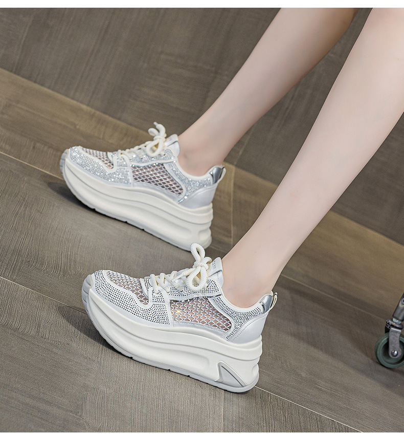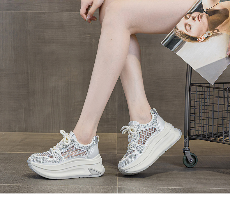 2025년 신상 여름 흰색 신발, 두꺼운 밑창, 레이스업, 컬러 매칭, 라인스톤, 캐주얼, 키가 큰 여성 신발, 키가 크고 슬림하며 통기성이 좋습니다.
