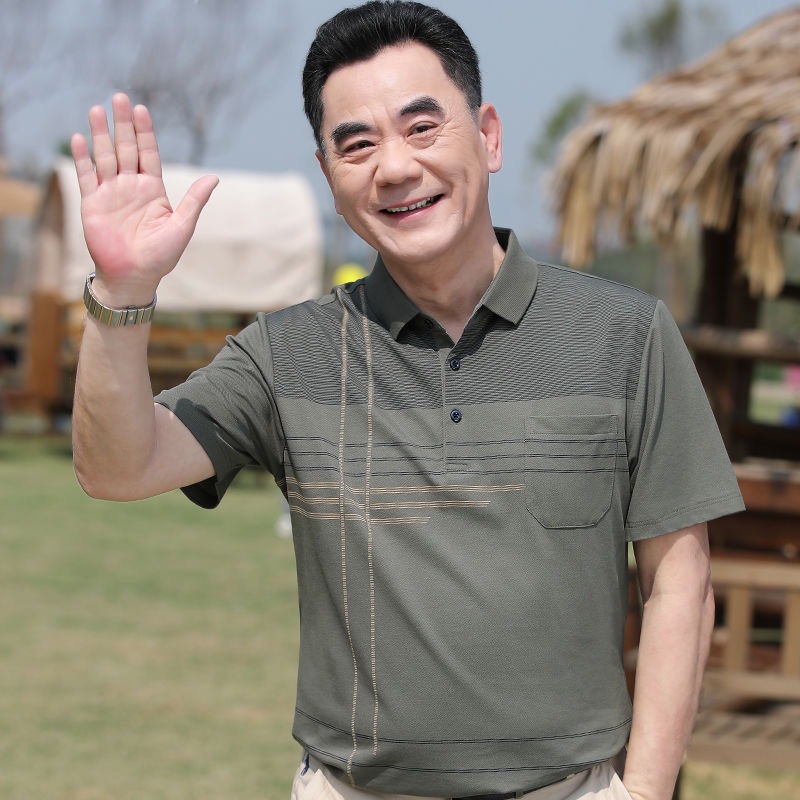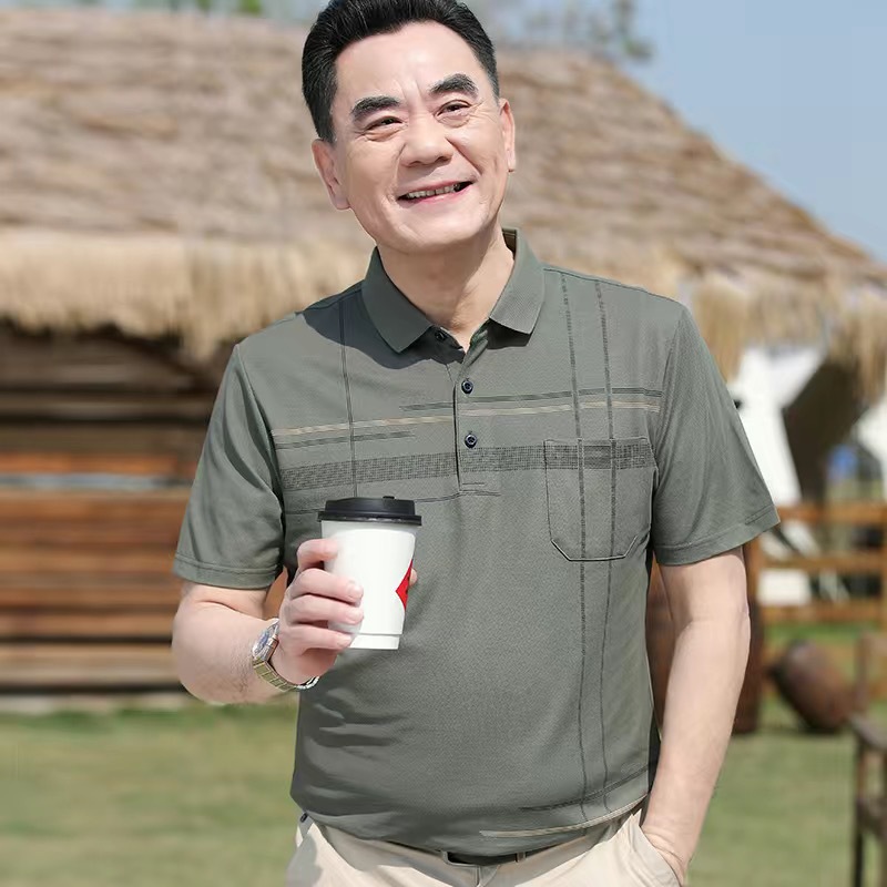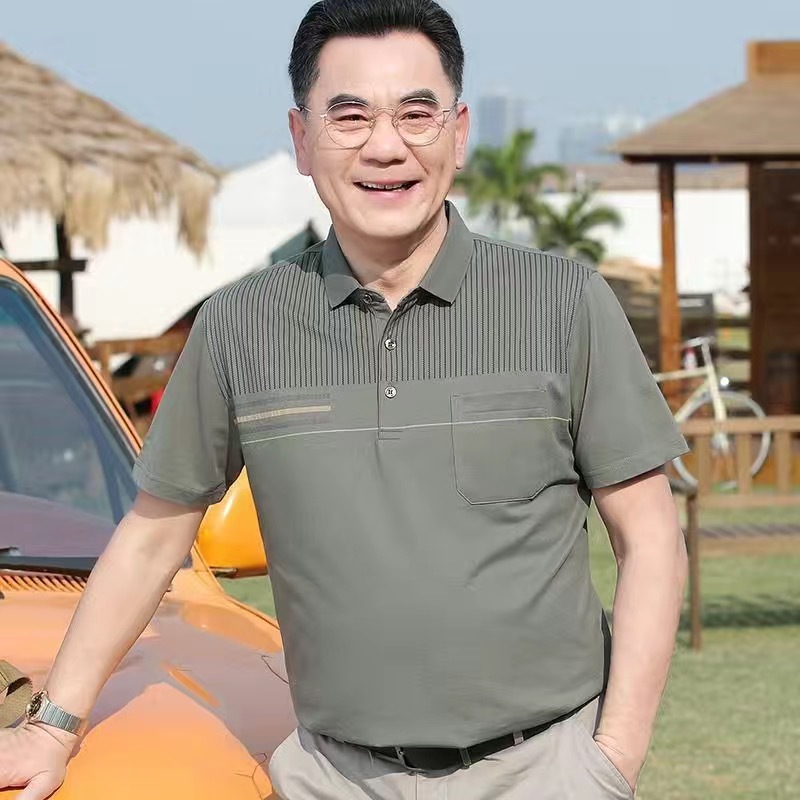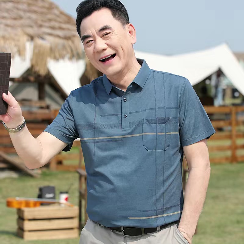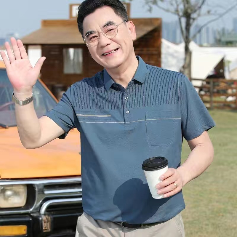 아빠의 여름 티셔츠 중년 남성 반팔 티셔츠 실크면 옷깃 최고 중년 및 노인 옷 할아버지 남성 의류스토어 가기