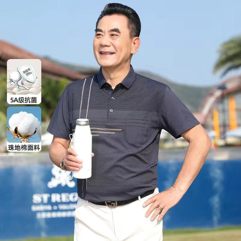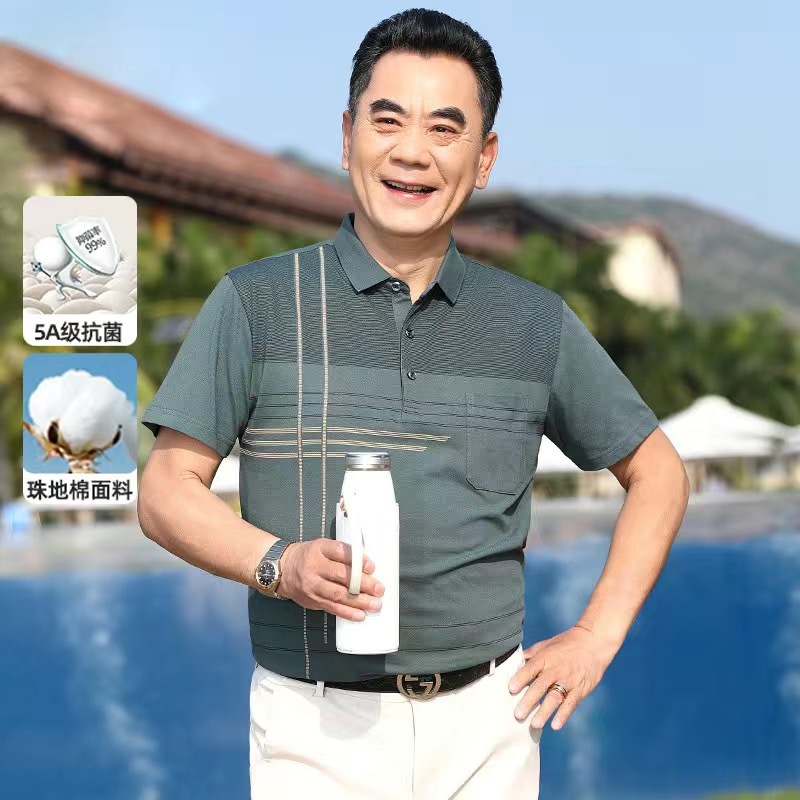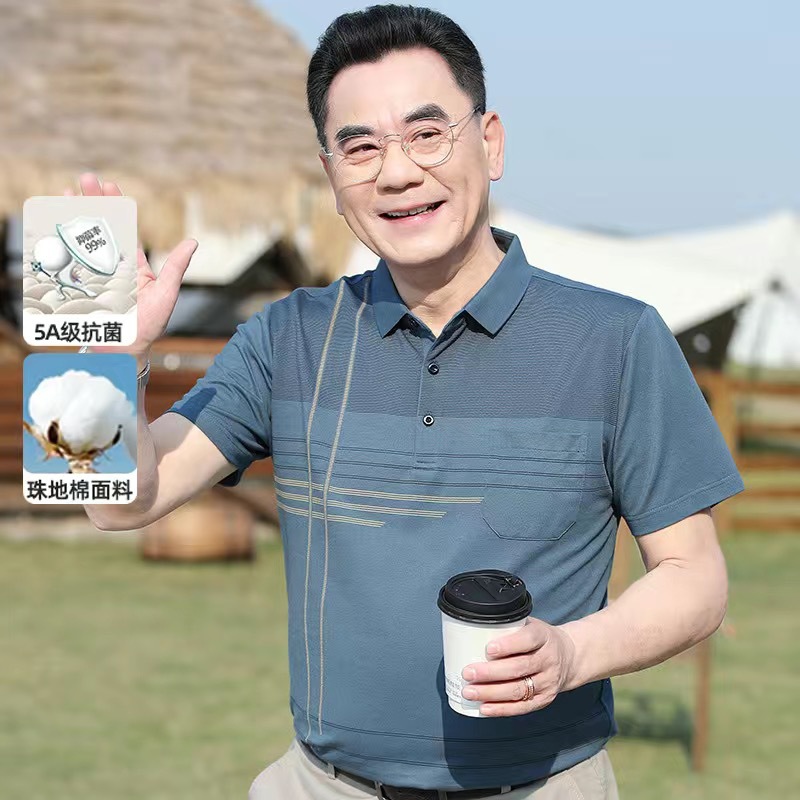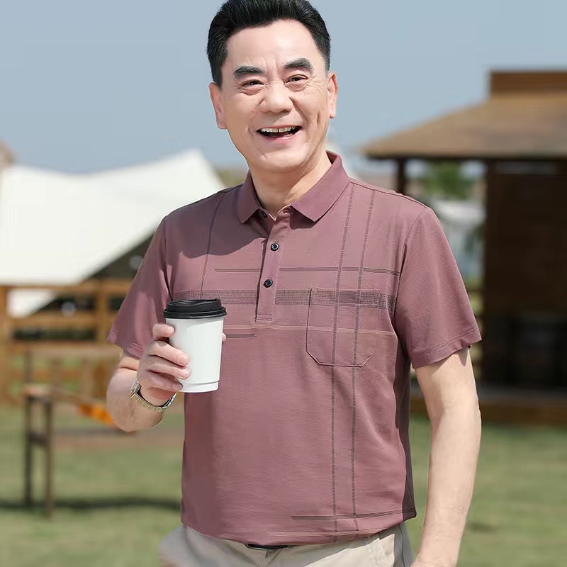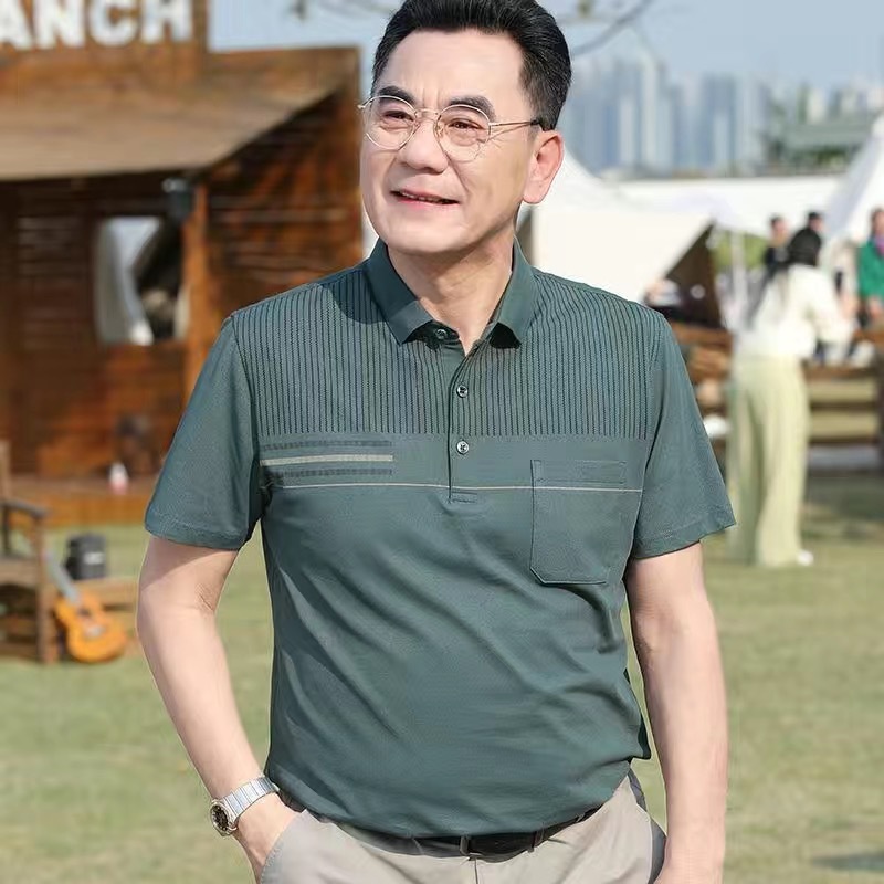 아빠의 여름 티셔츠 중년 남성 반팔 티셔츠 실크면 옷깃 최고 중년 및 노인 옷 할아버지 남성 의류스토어 가기