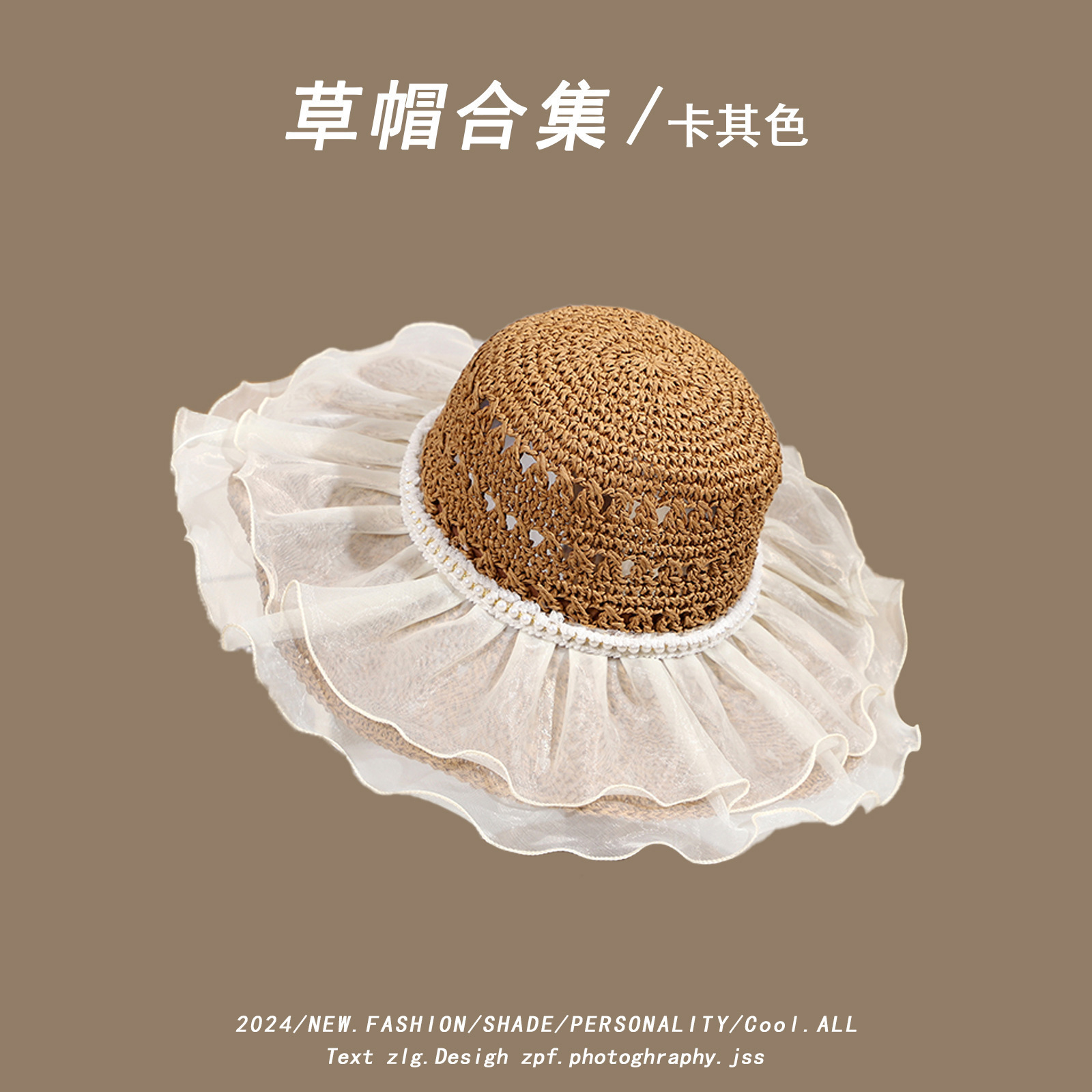 해변 휴가 스타일 모자, 인터넷 연예인 모자, 밀짚모자, 레이스 빅 챙 모자, 얼굴 전체를 덮는 자외선 차단 모자스토어 가기