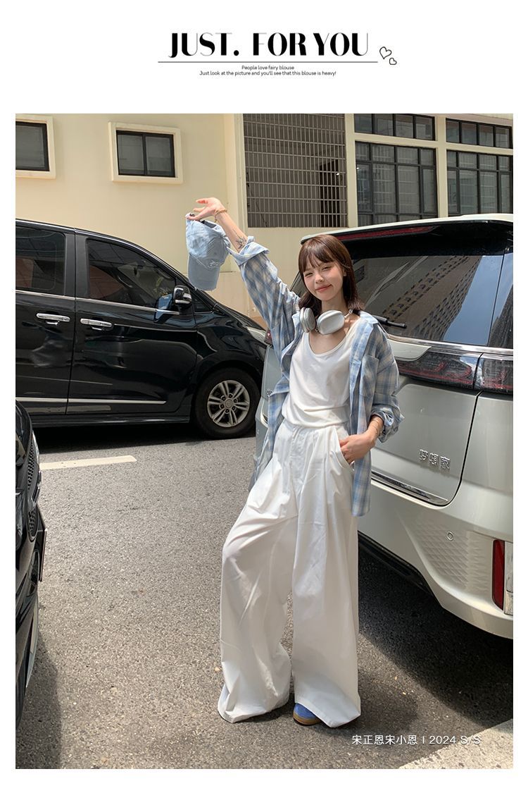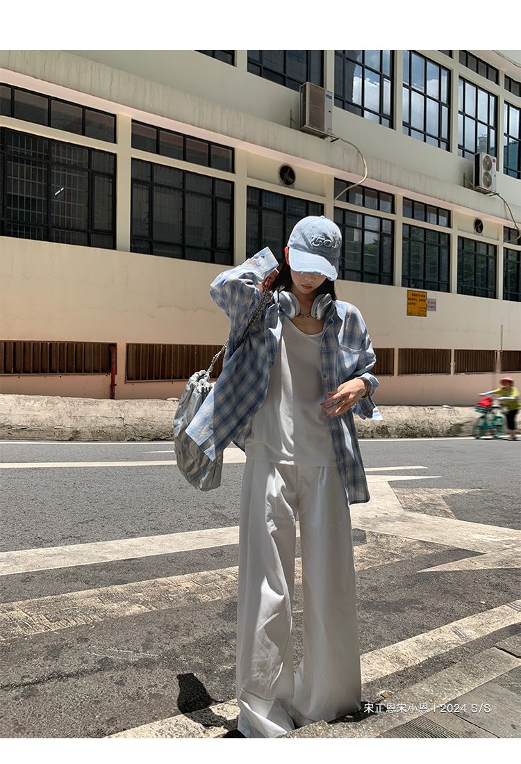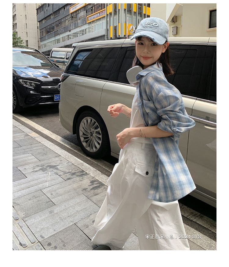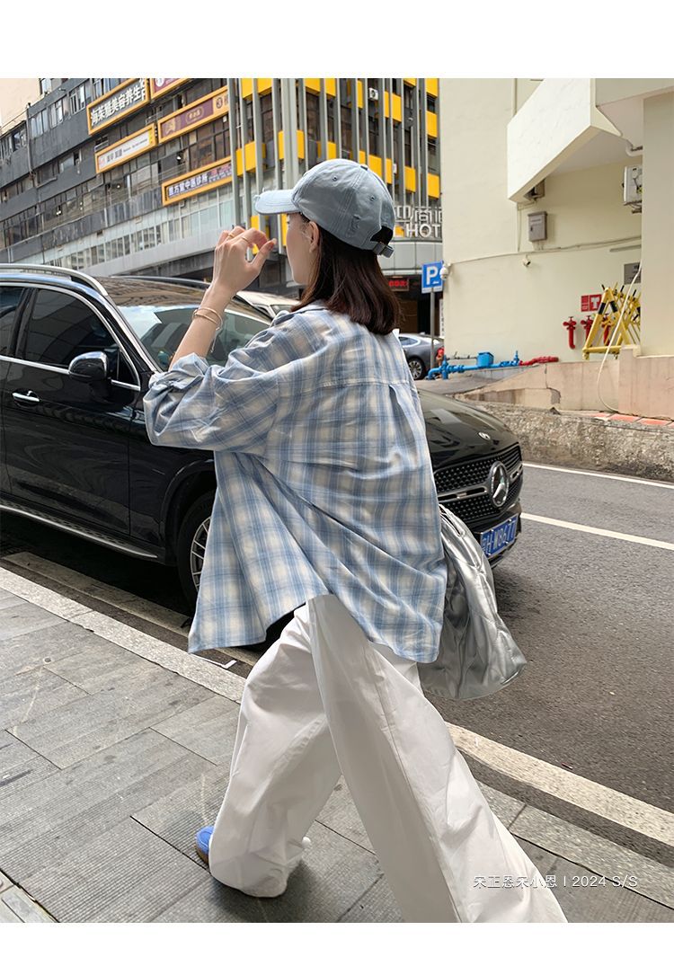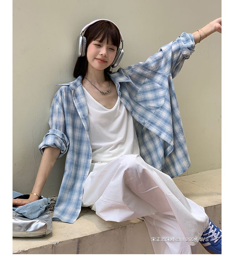 달콤한 쿨 스타일 그레이 블루 명암 컬러 격자 무늬 셔츠 여성용 긴팔 올매치 귀여운 캐주얼 니치 선스크린 솔트 코트 블랙스토어 가기
