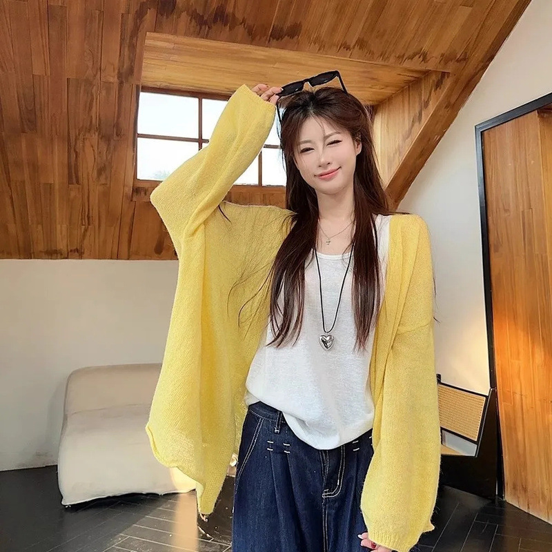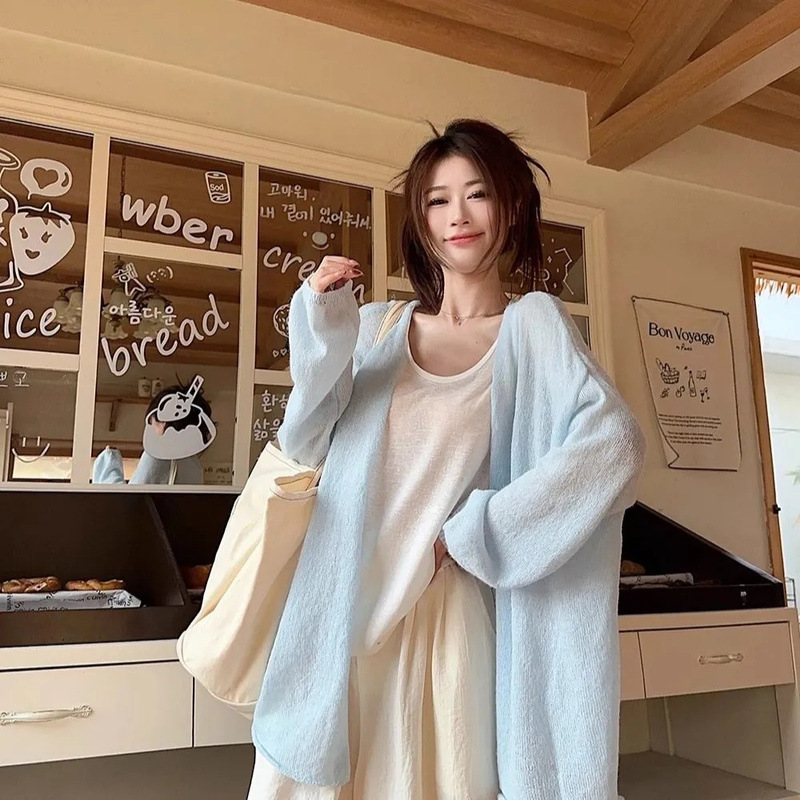 부드러운 스타일 솔리드 컬러 다목적 캐주얼 니트 카디건 여성 여름 게으른 느슨한 얇은 외부 에어컨 블라우스 탑
