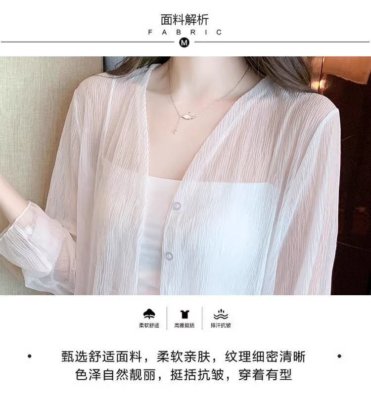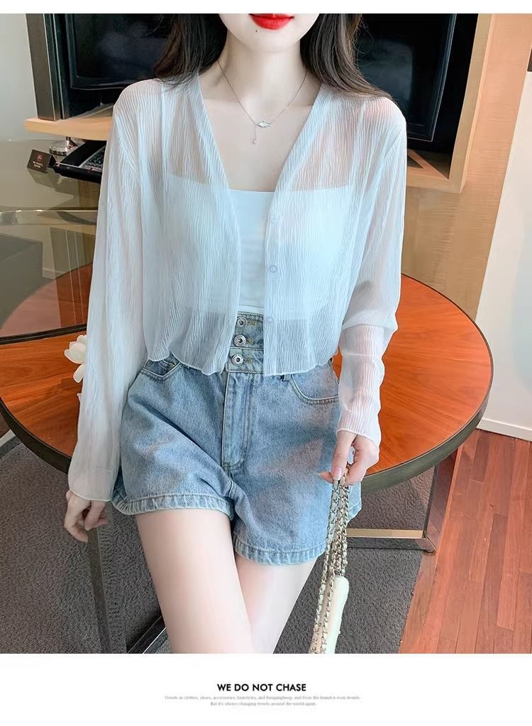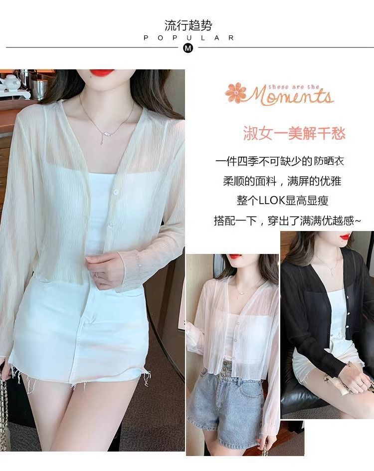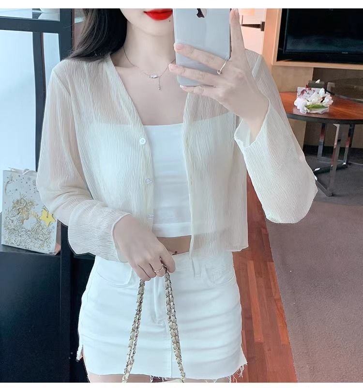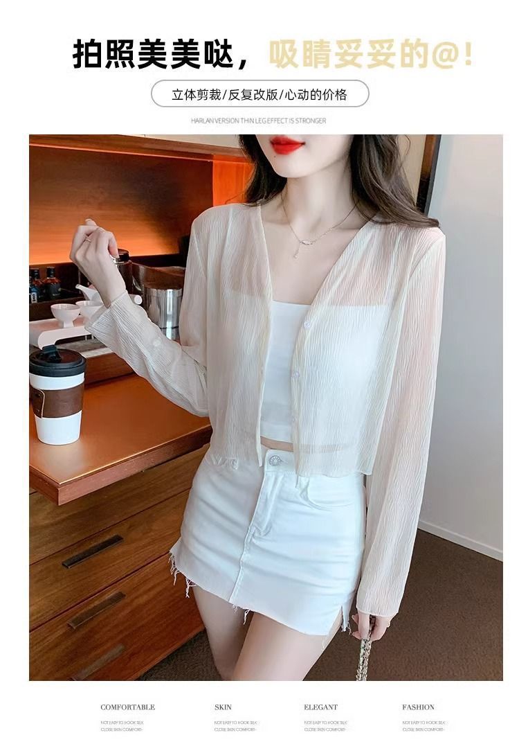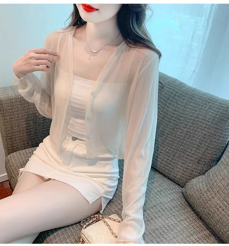 여름 얇은 화이트 쉬폰 가디건 여성용 아이스 실크 탑 블라우스 자외선 차단 의류와 서스펜더 스커트 숄 재킷스토어 가기