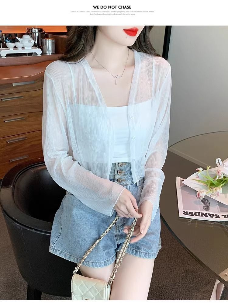 여름 얇은 화이트 쉬폰 가디건 여성용 아이스 실크 탑 블라우스 자외선 차단 의류와 서스펜더 스커트 숄 재킷