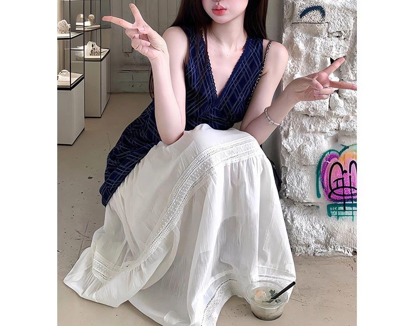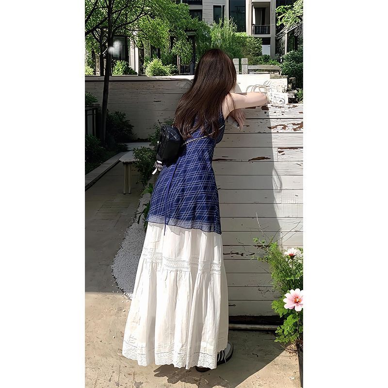 여성을위한 대학 달콤한 스타일 민소매 v 넥 격자 무늬 조끼 탑 흰색 스커트 정장 다목적 스커트 투피스 세트