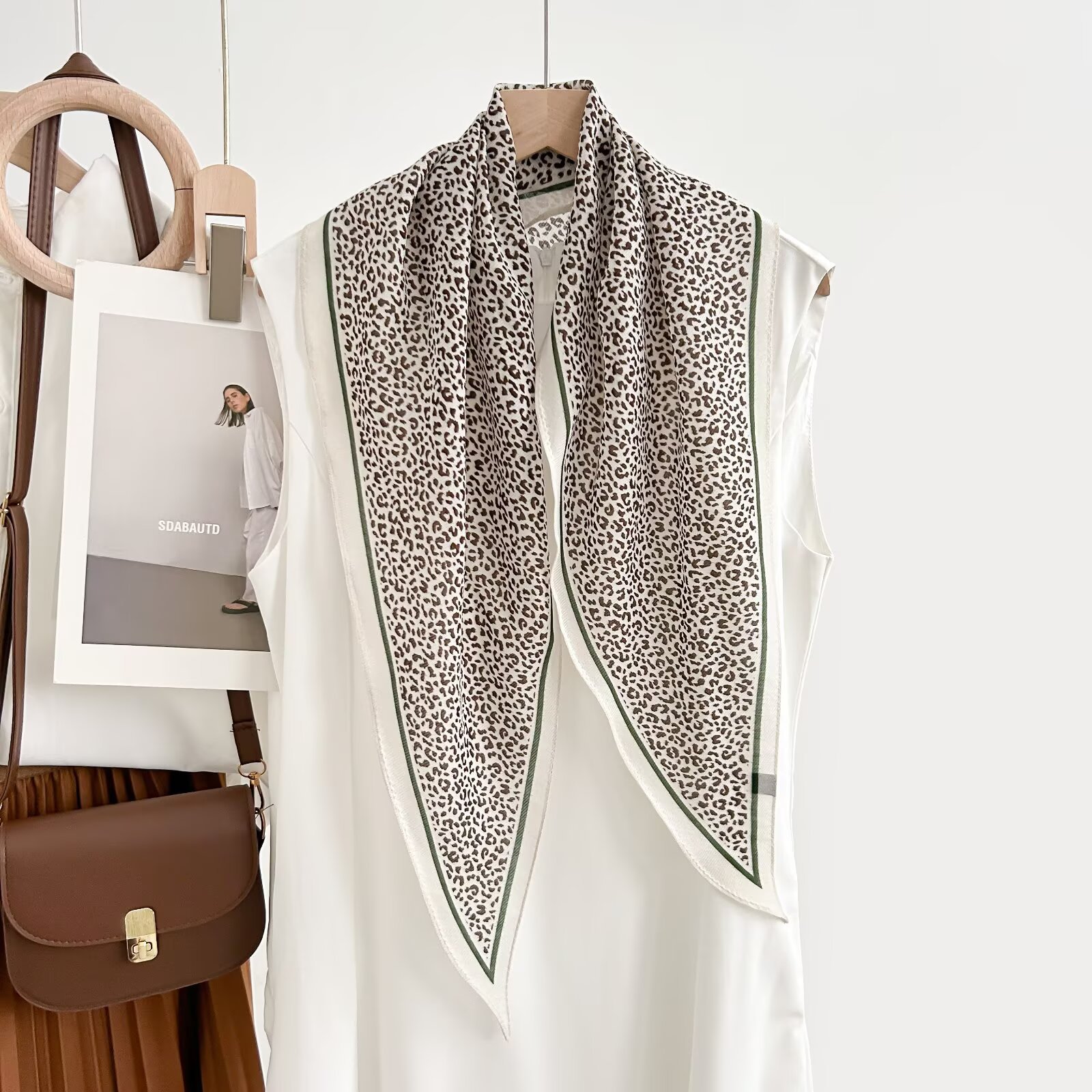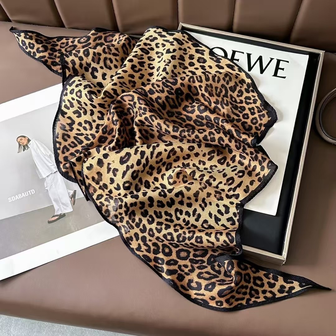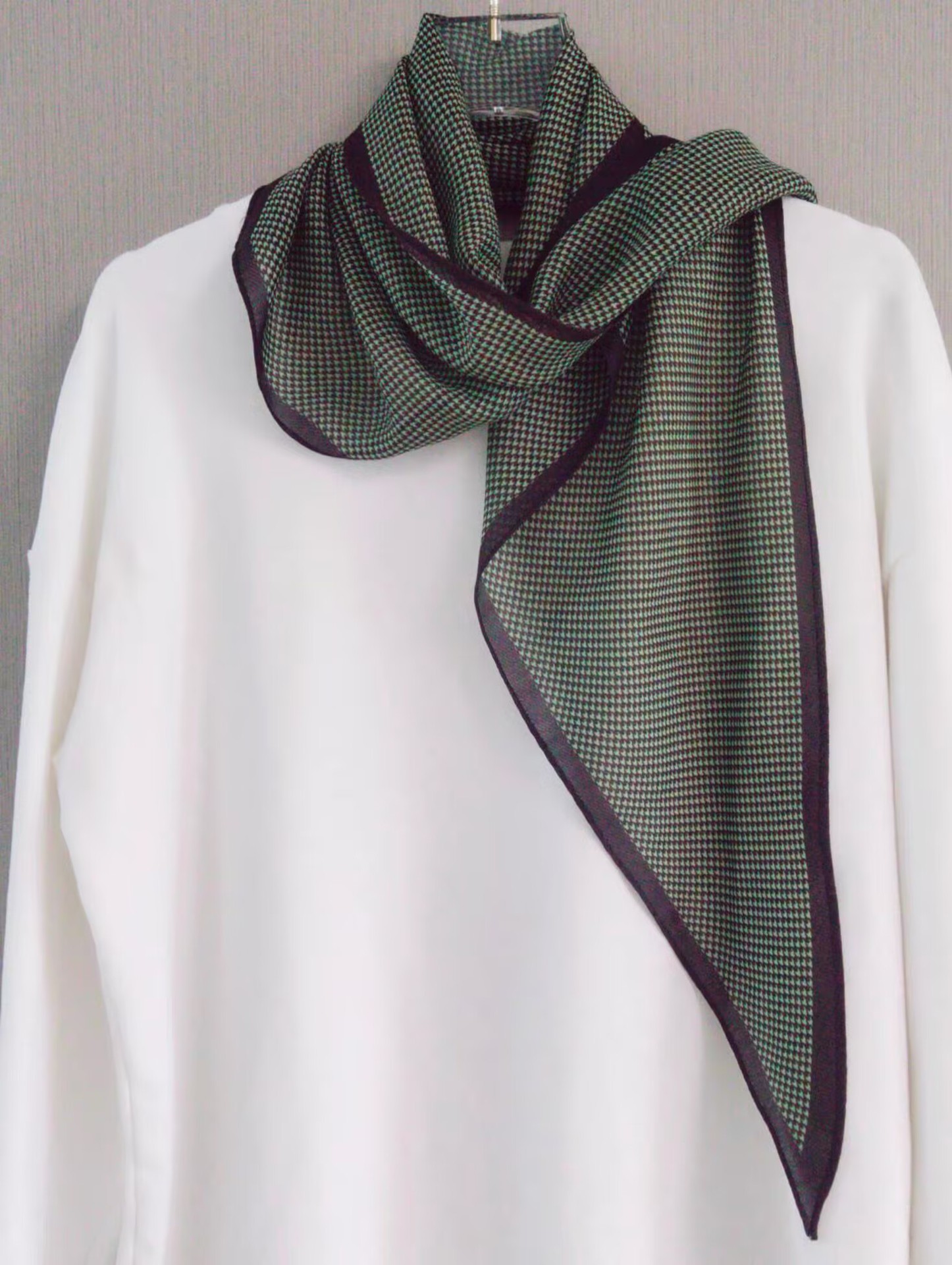 • 작은 표범 무늬 그린 엣지 실크 울 마름모 스카프