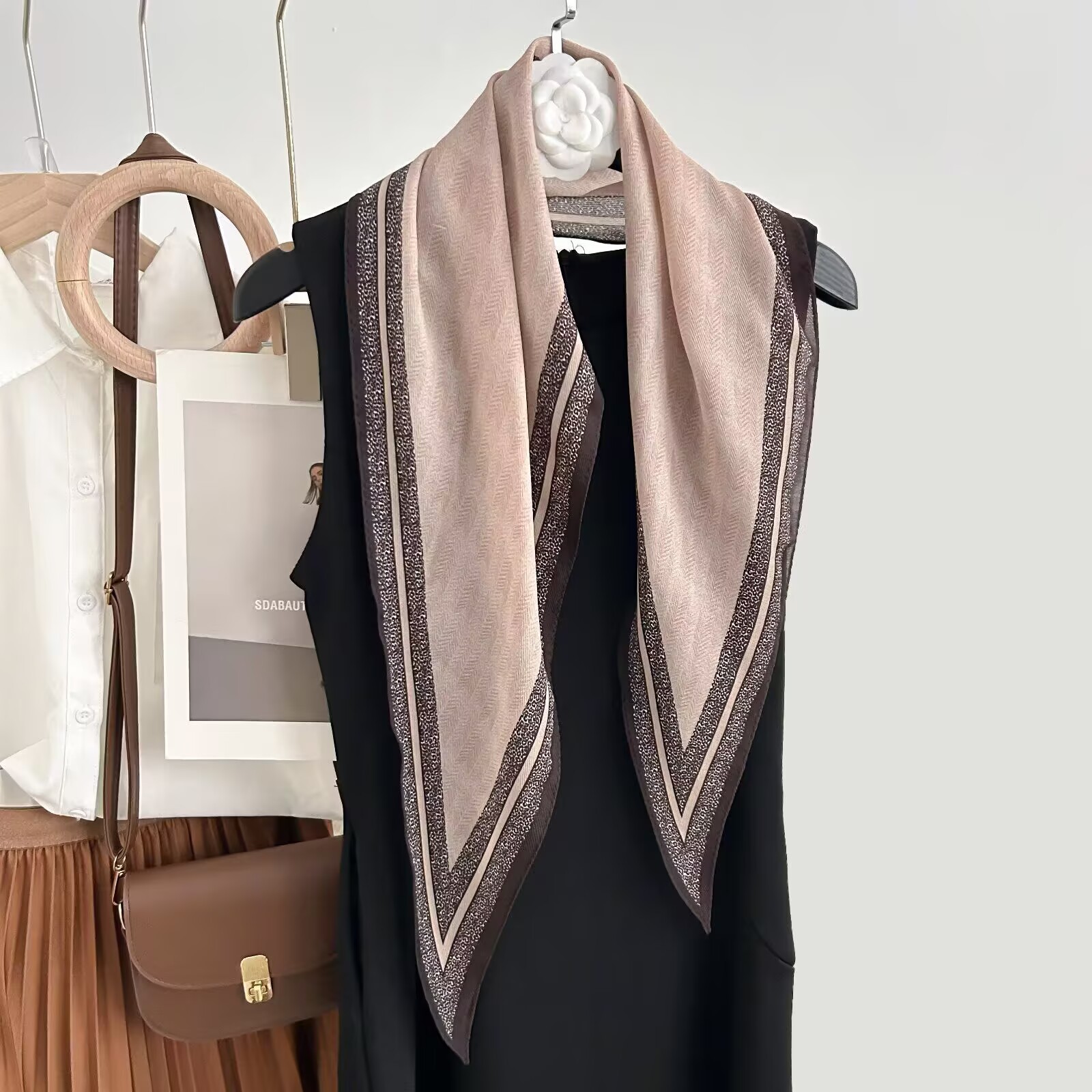 • 누드 핑크 테두리 실크 울 마름모 스카프