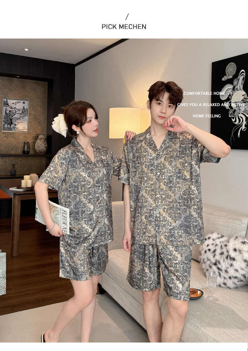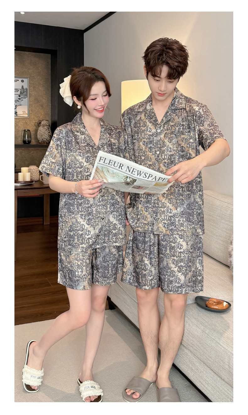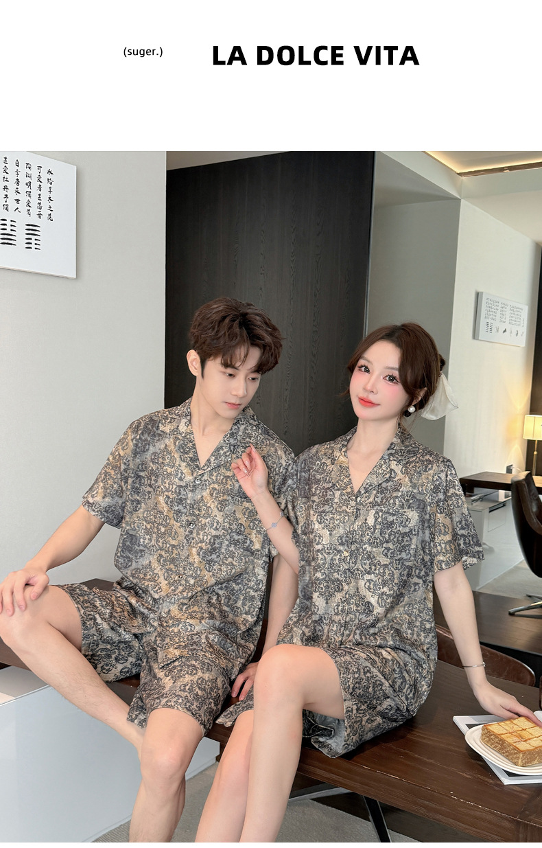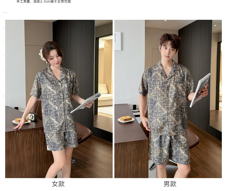 여성을위한 얼음 실크 인쇄 커플 잠옷 여름 얇은 2025 새로운 옷깃 반팔 남성 라이트 럭셔리 홈웨어 세트스토어 가기