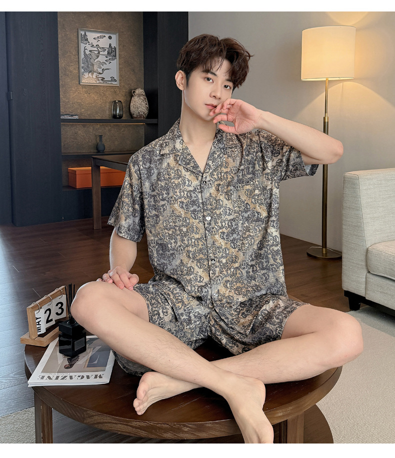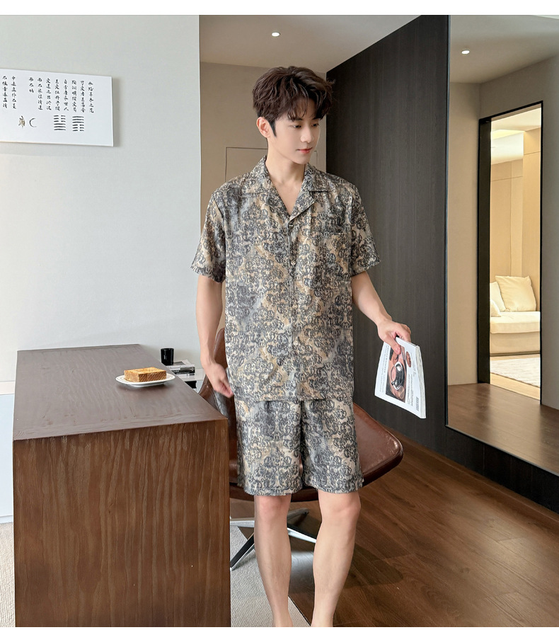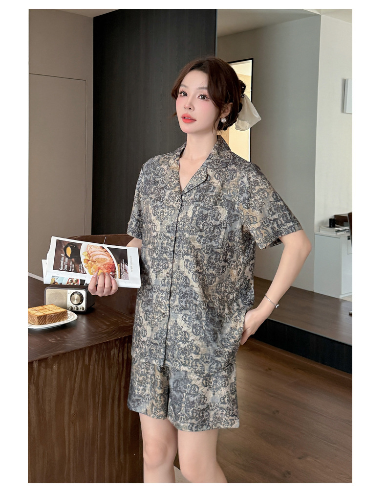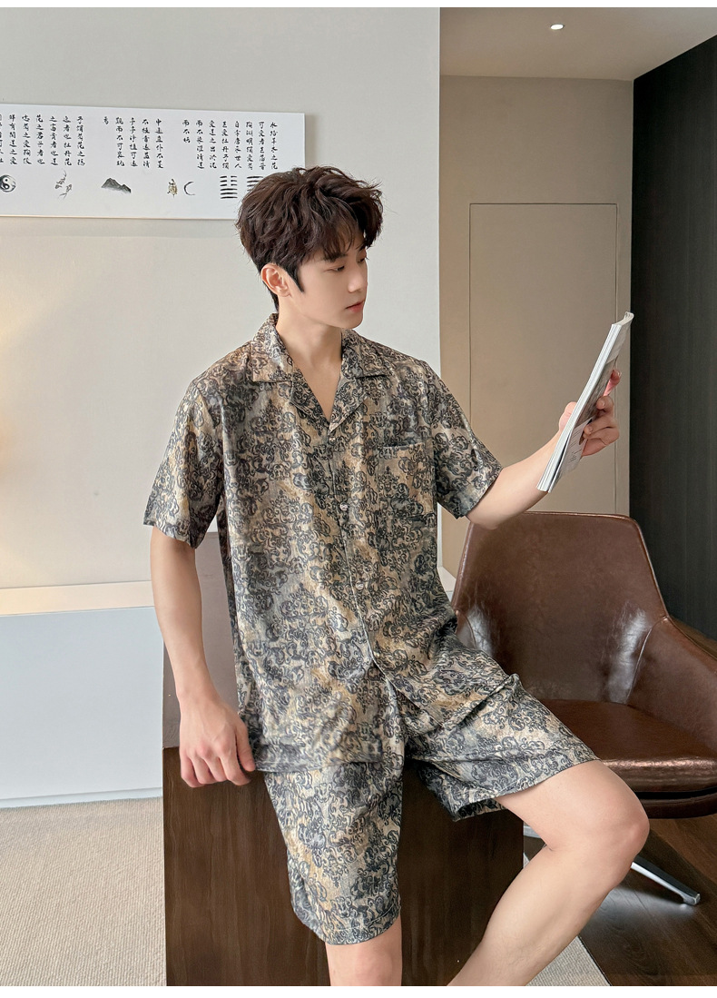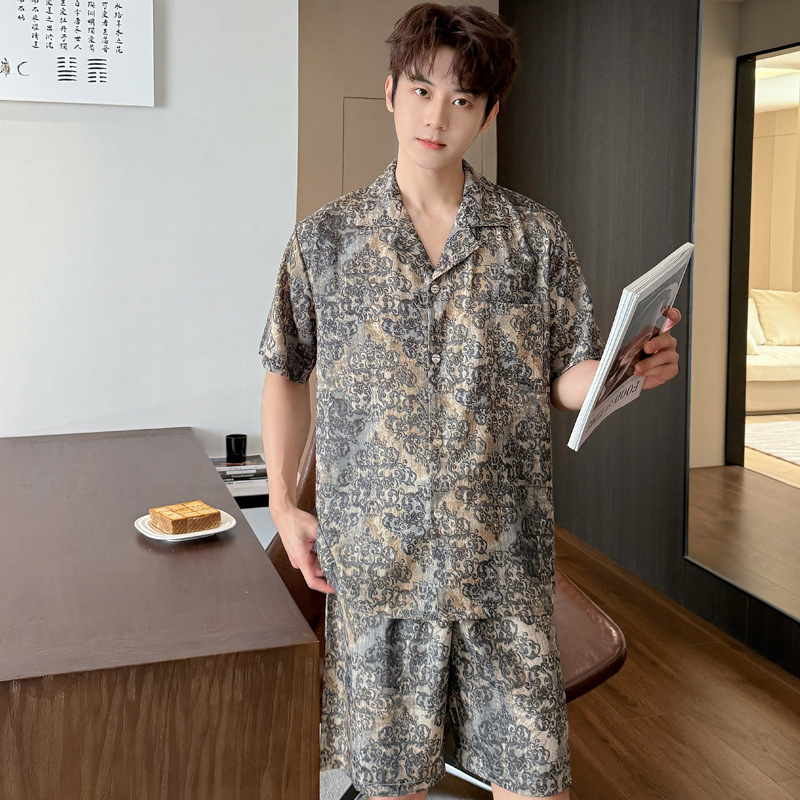여성을위한 얼음 실크 인쇄 커플 잠옷 여름 얇은 2025 새로운 옷깃 반팔 남성 라이트 럭셔리 홈웨어 세트스토어 가기