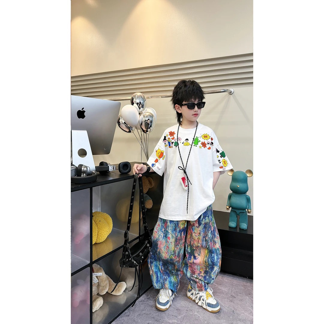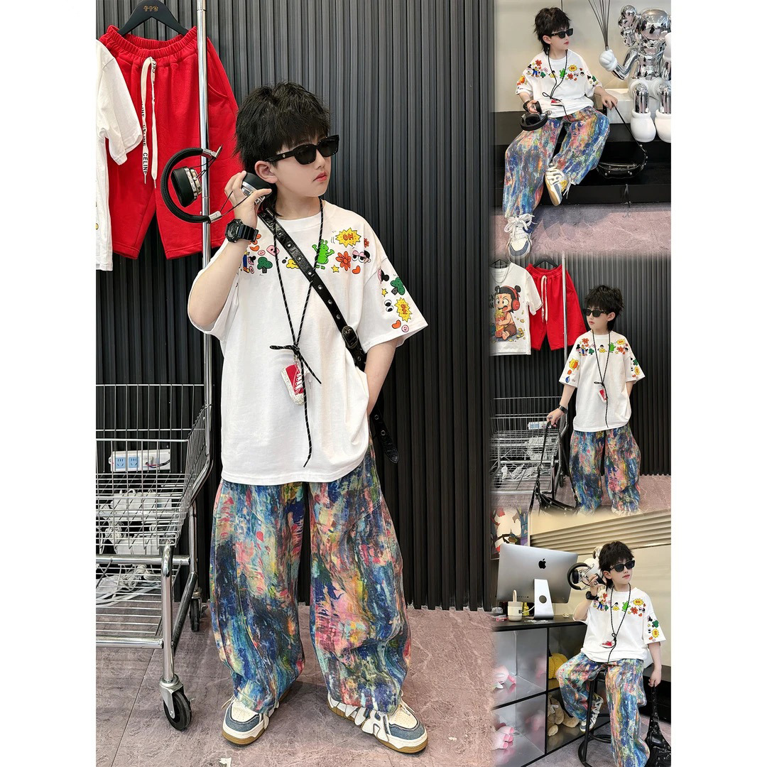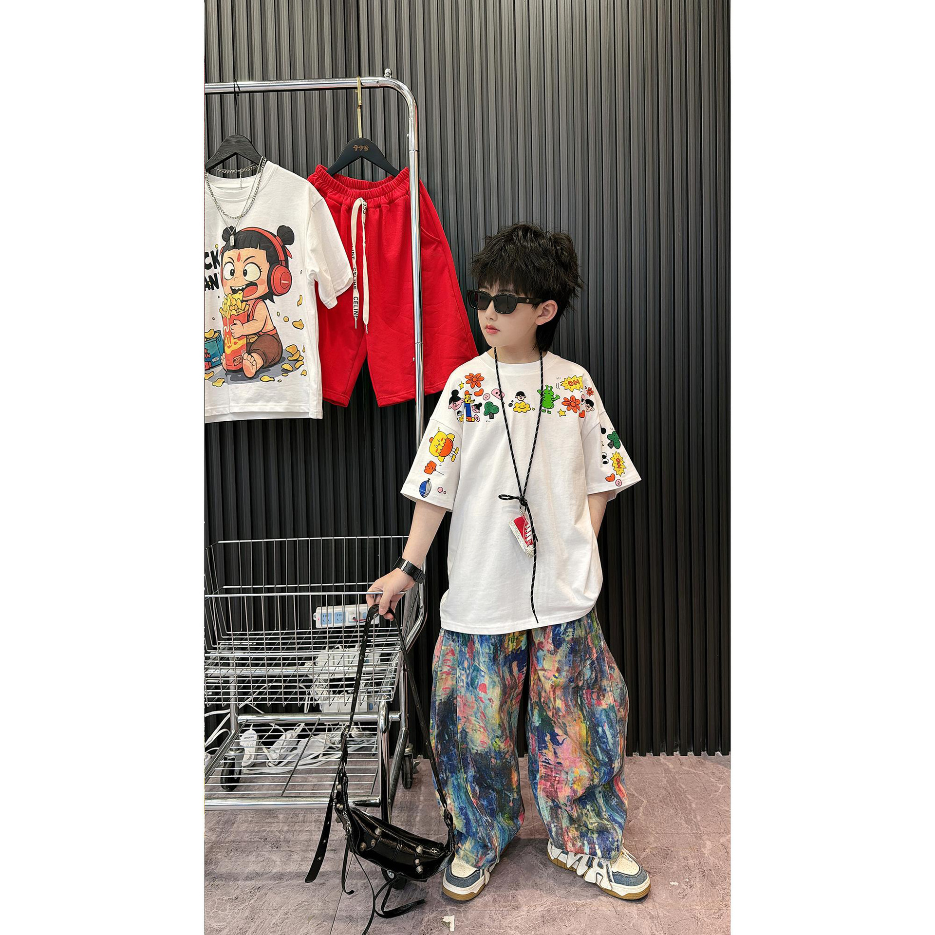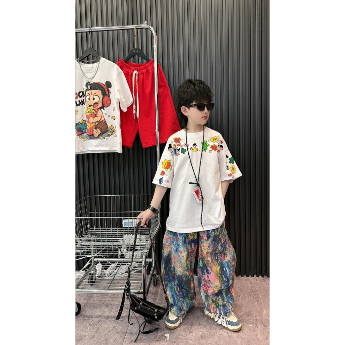 소년 여름 멋진 스트리트 코튼 탑 2025 한국어 버전 중대형 아동 캐주얼 루즈 반팔 티셔츠 트렌디하고 쿨스토어 가기