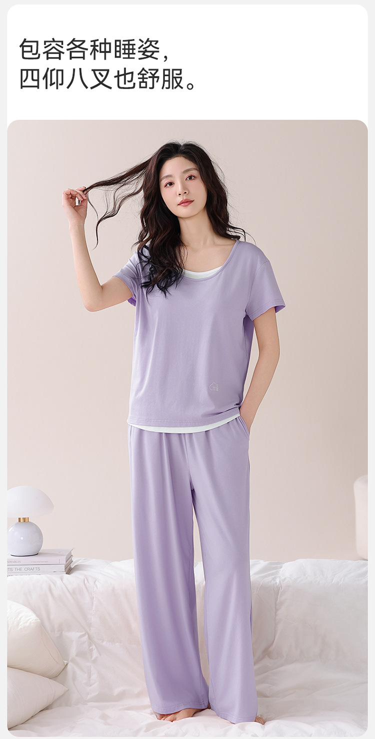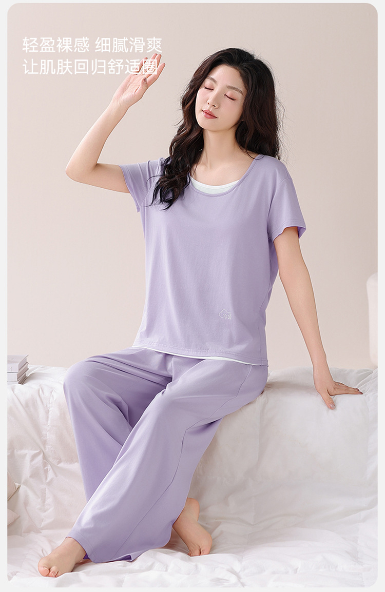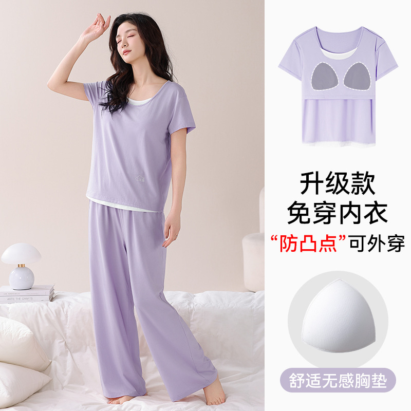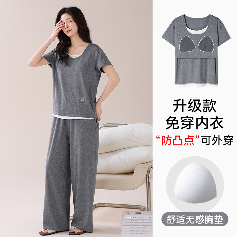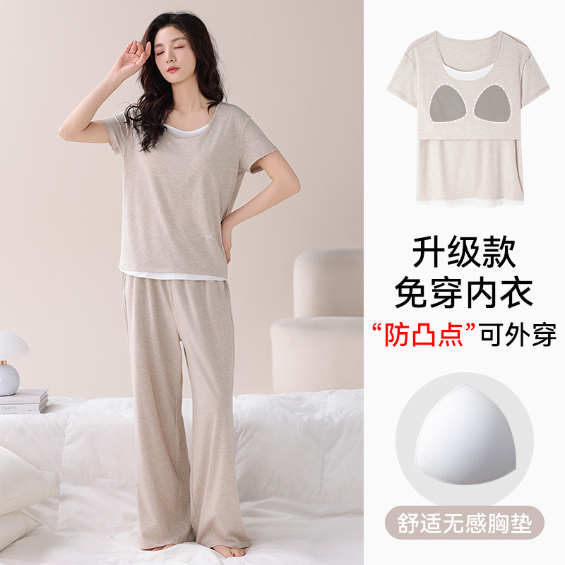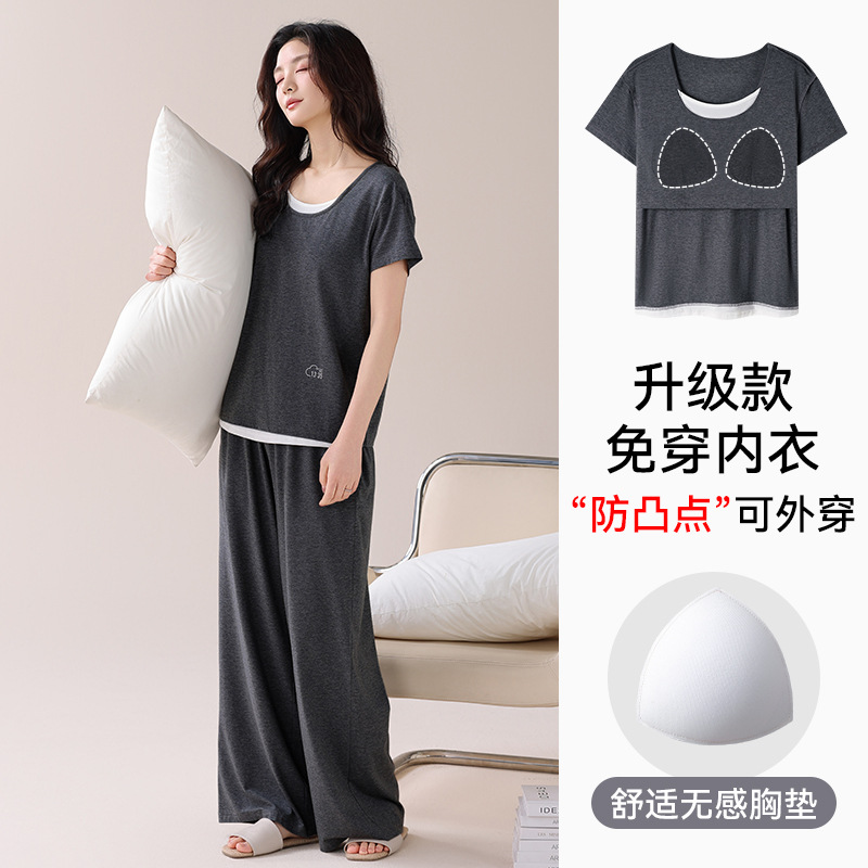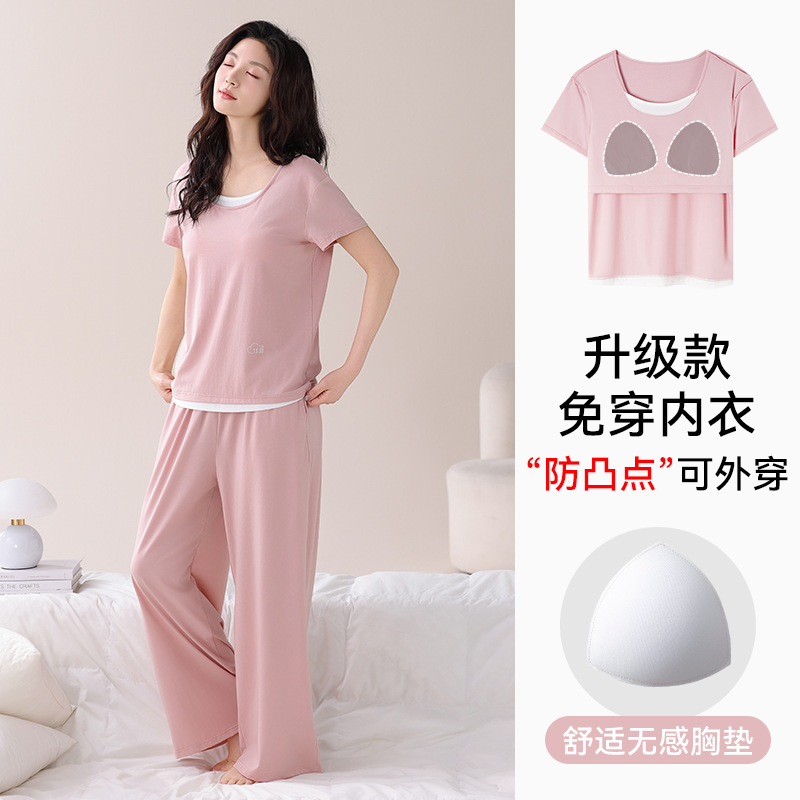 여성용 가슴 패드가 있는 여름 모달 얇은 홈웨어 캐주얼 페이크 투피스 슈트, 반팔 바지 외부 착용 가능스토어 가기