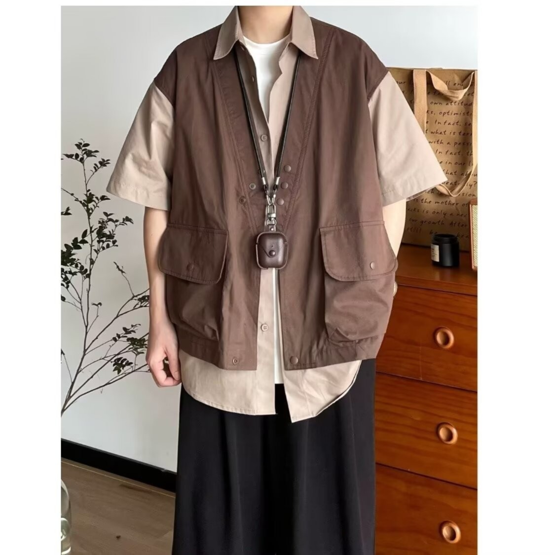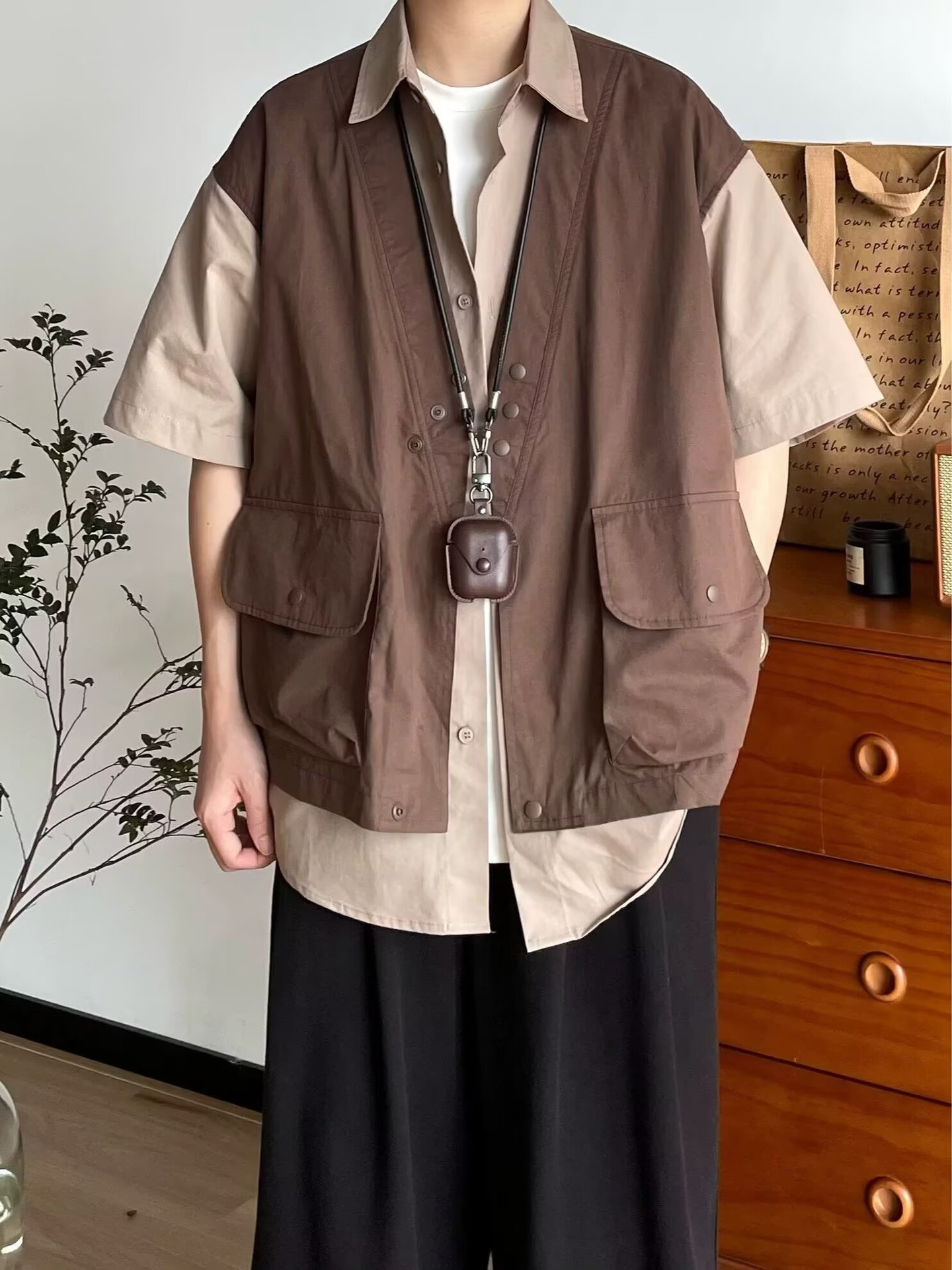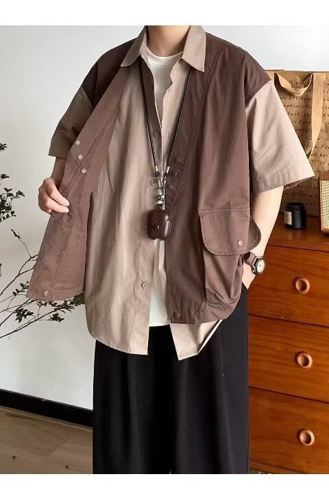 일본 복고풍 기능성 가짜 투피스 루즈 조끼 반팔 셔츠 남성과 여성 여름 유행 반팔 셔츠 재킷