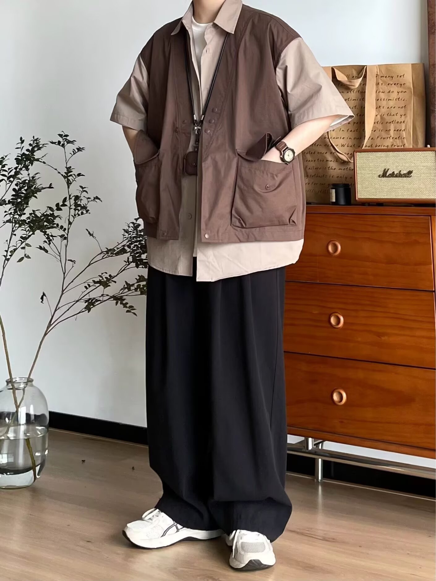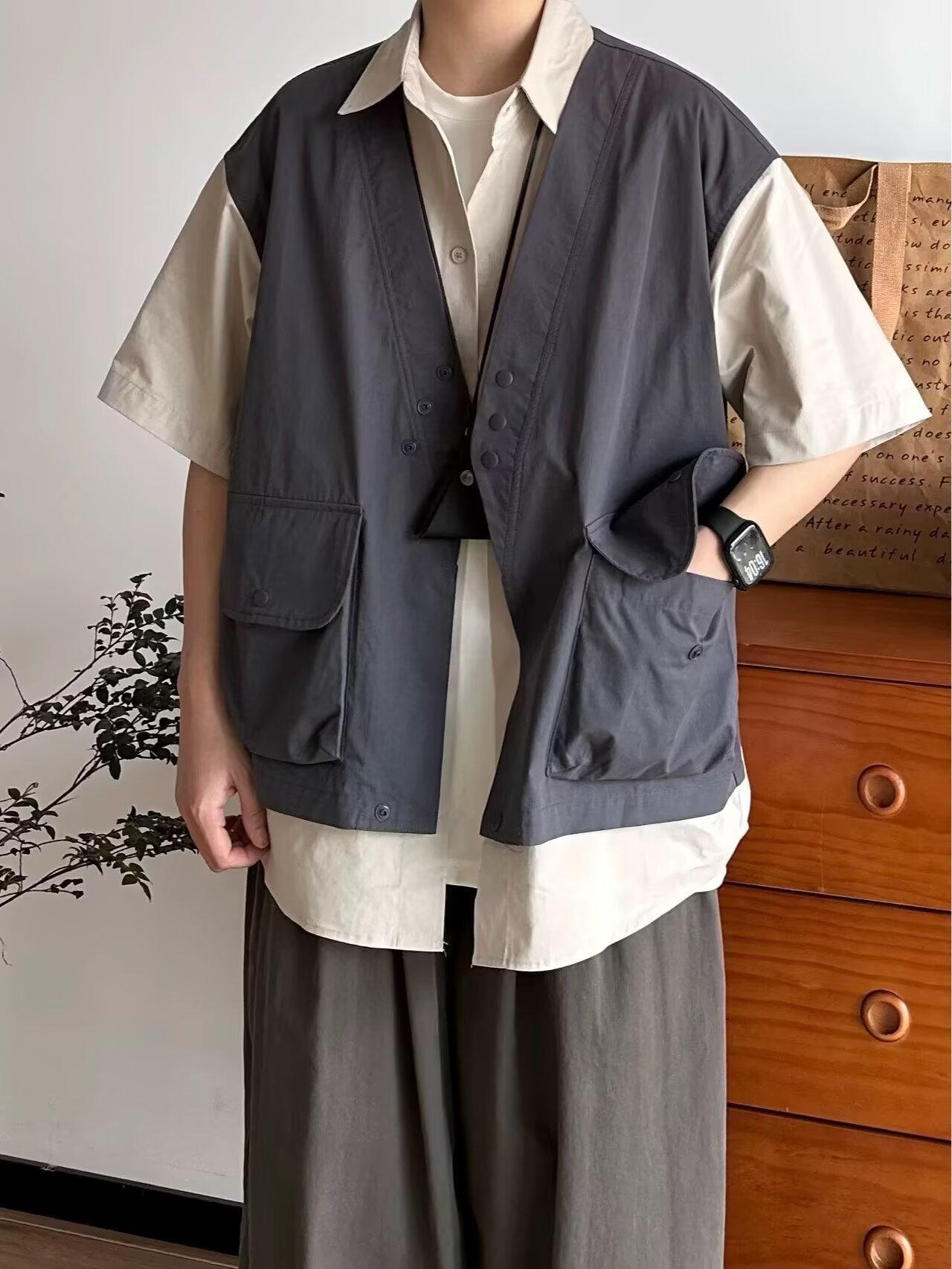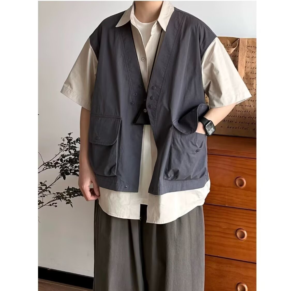 일본 복고풍 기능성 가짜 투피스 루즈 조끼 반팔 셔츠 남성과 여성 여름 유행 반팔 셔츠 재킷스토어 가기