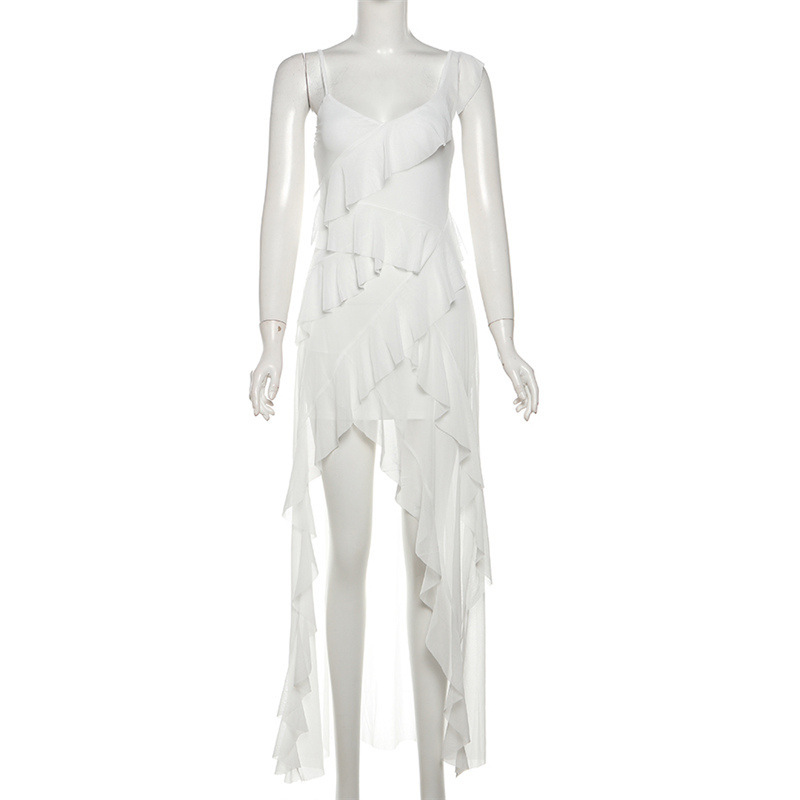 국경 간 유럽과 미국 스타일 2025 새로운 여름 여성 의류 섹시한 빅 백리스 슬리밍 러플 불규칙 드레스스토어 가기