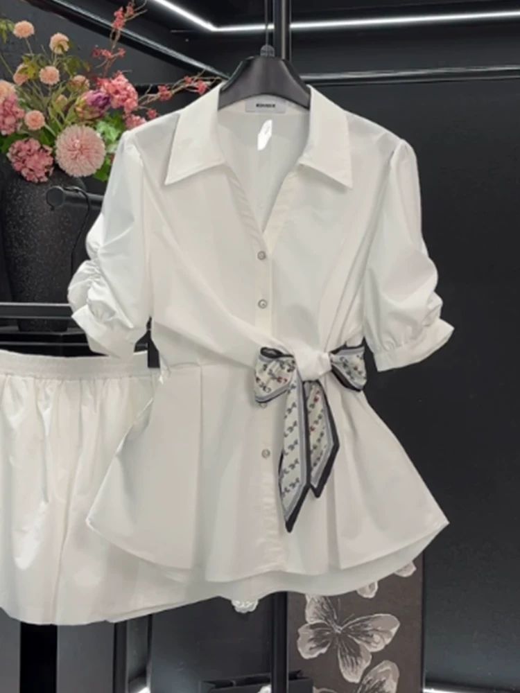 하이 엔드 화이트 여성 쉬폰 셔츠 여성 여름 2025 새로운 반팔 탑 셔츠 허리 셔츠