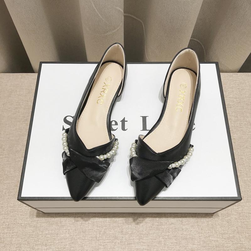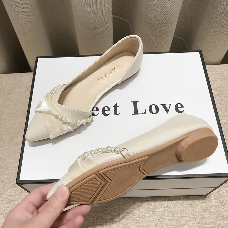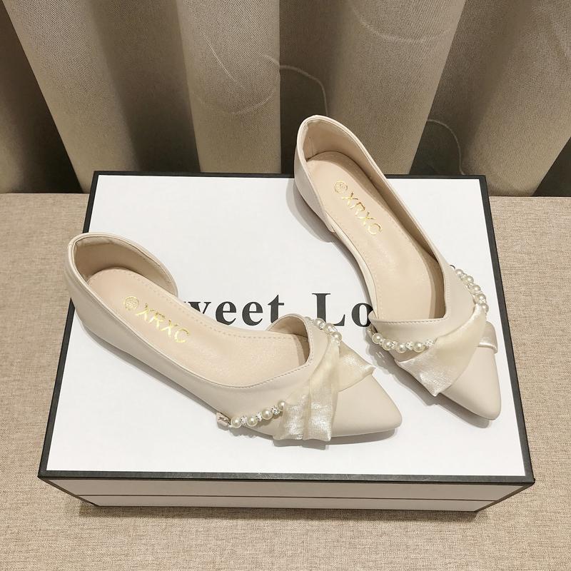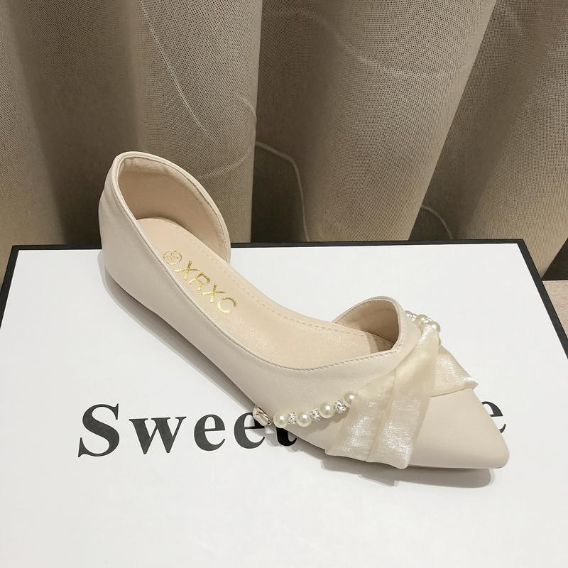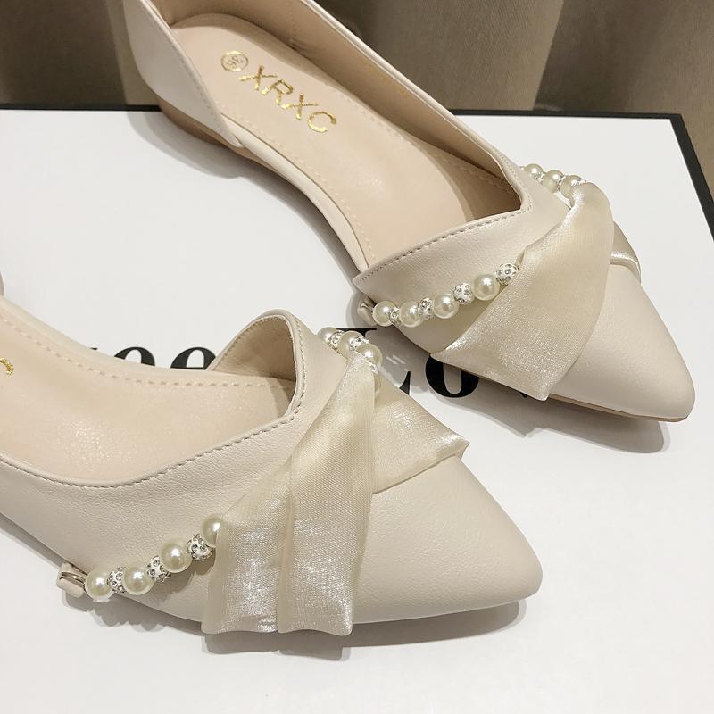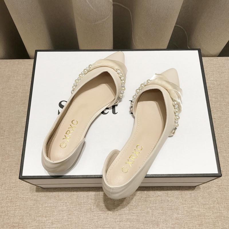 샤넬 스타일의 우아한 포인티드 토 여성용 슈즈, 2025년 신상 진주 요정 스타일 여름 샌들, 앞코가 막힌 슬립온 슈즈스토어 가기