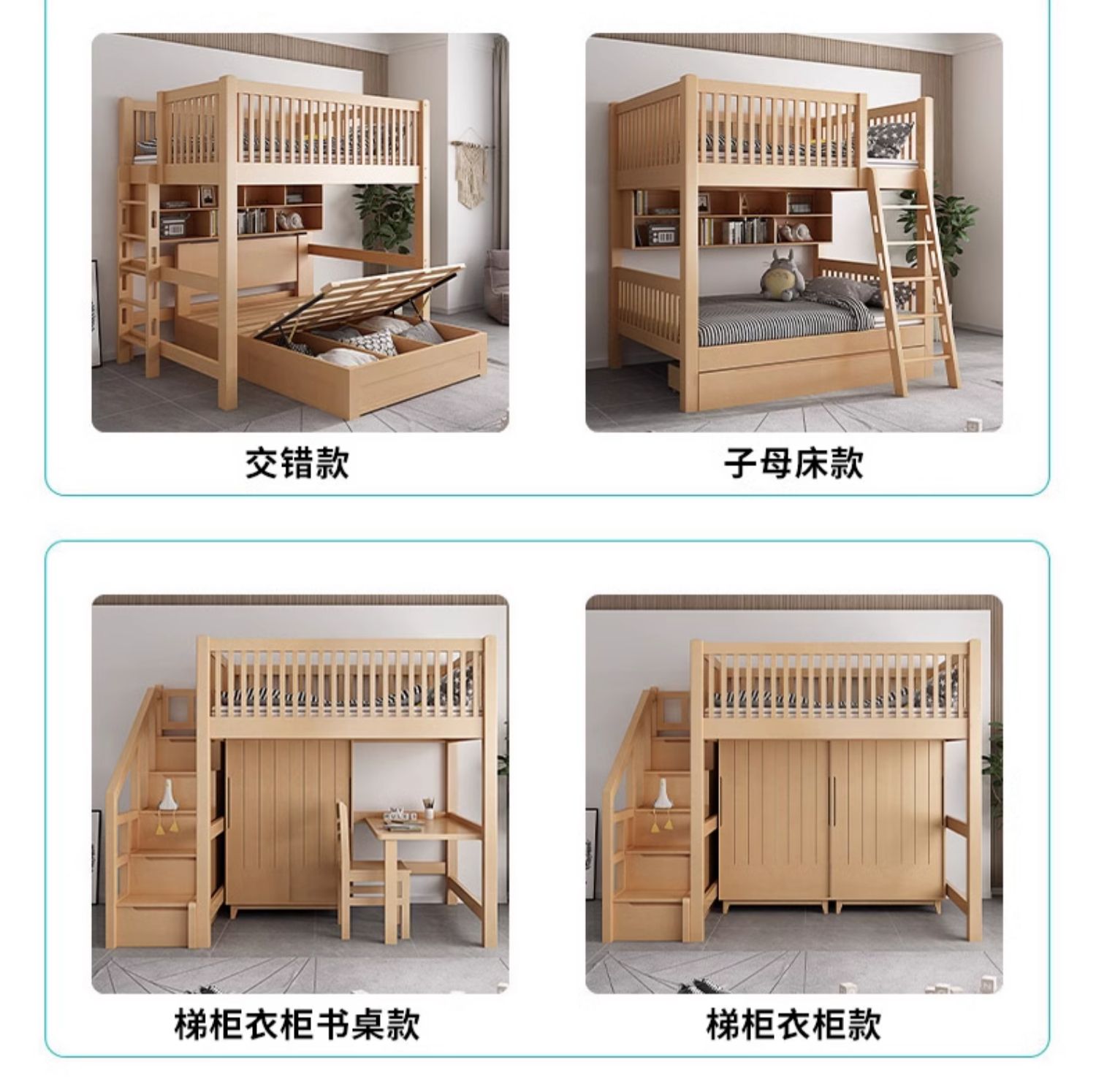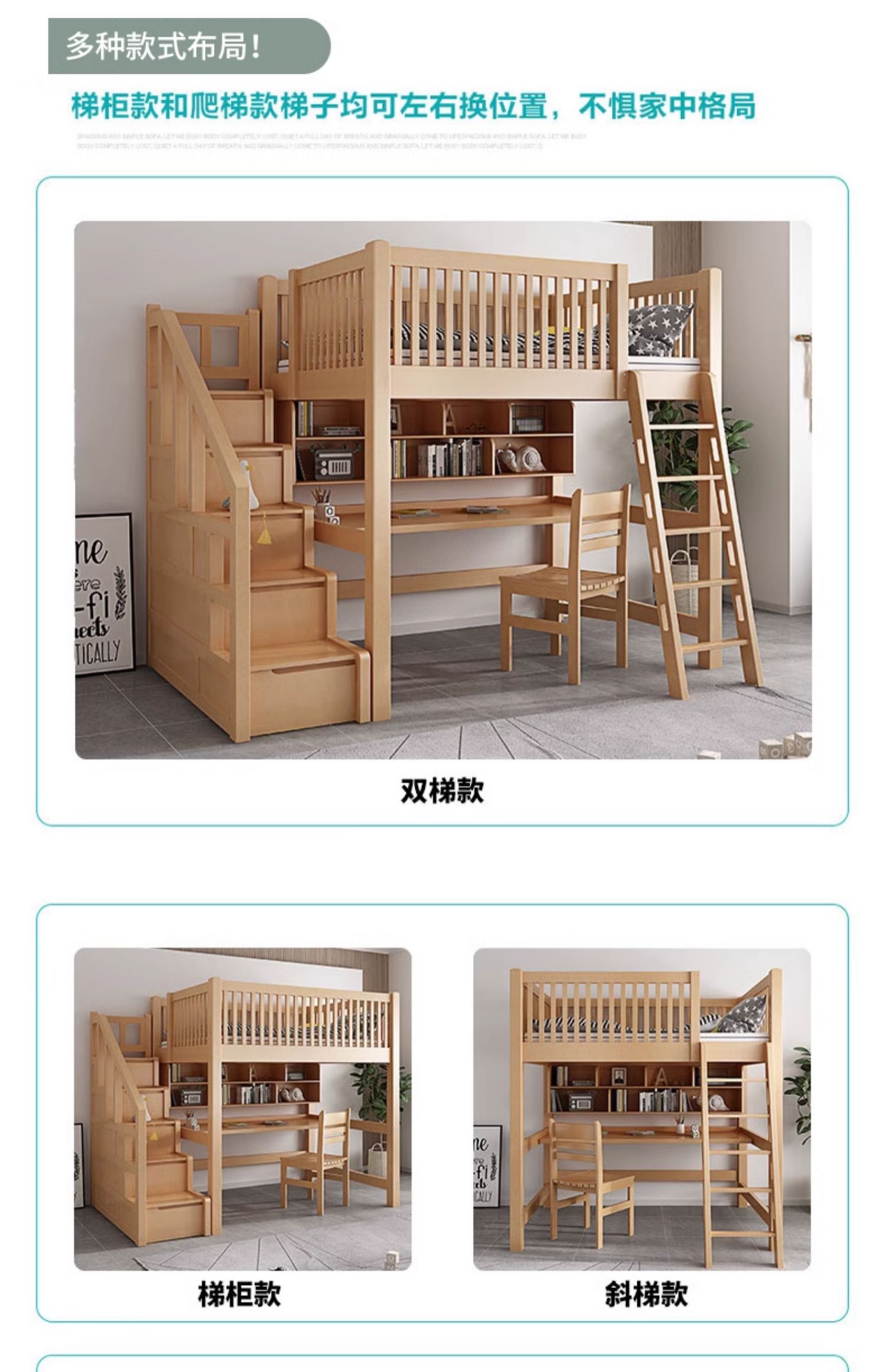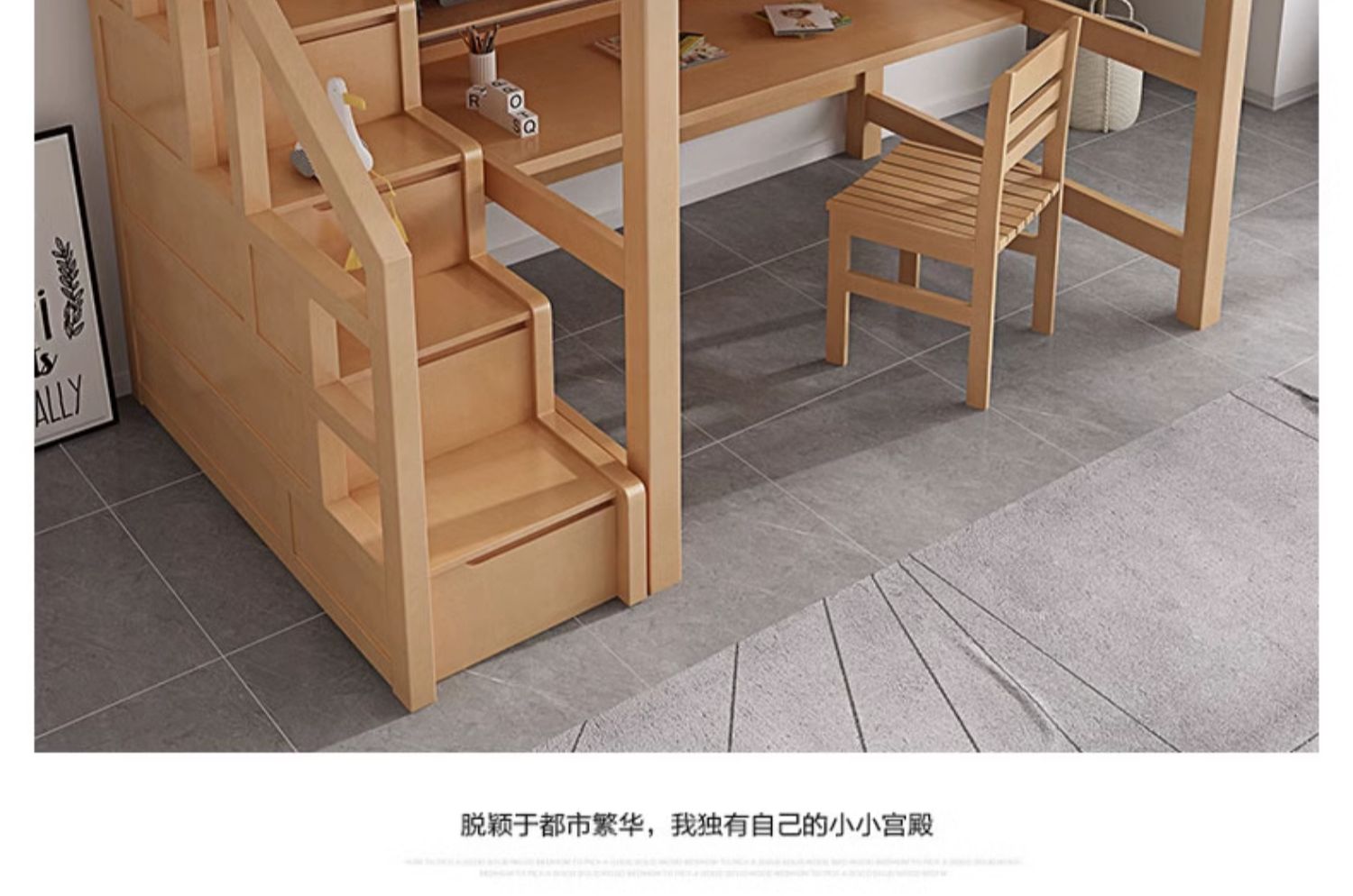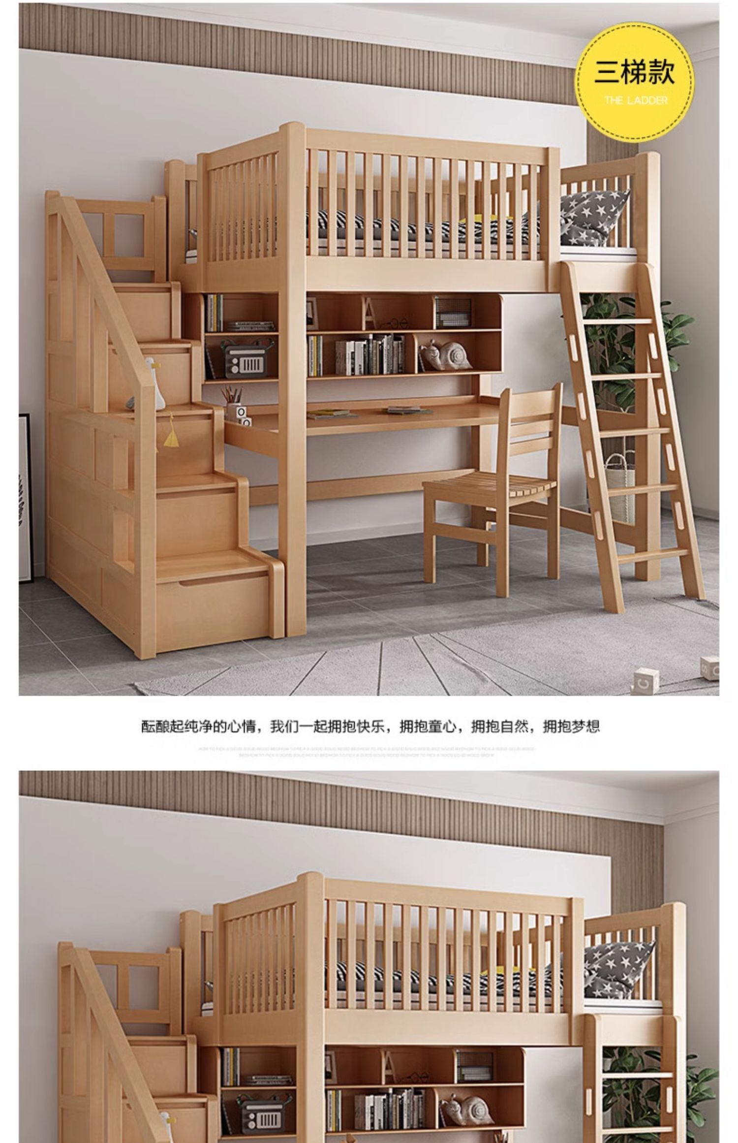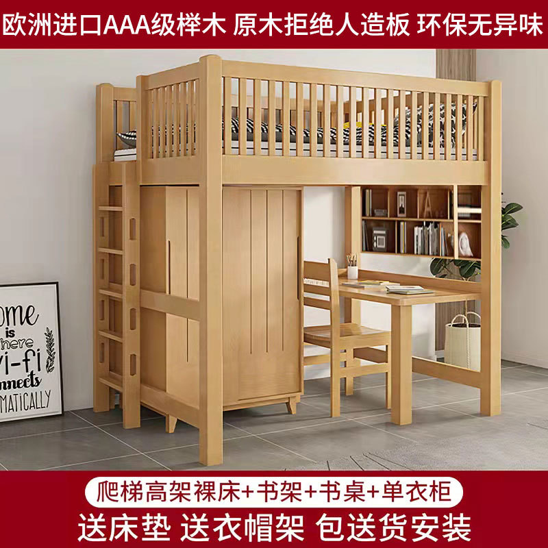 • 사다리형 침대 + 책장 + 책상 + 싱글 옷장 + 무접착 코코넛 야자 매트리스 * 1 (전체 원목 - AAA 등급 너도밤나무)
