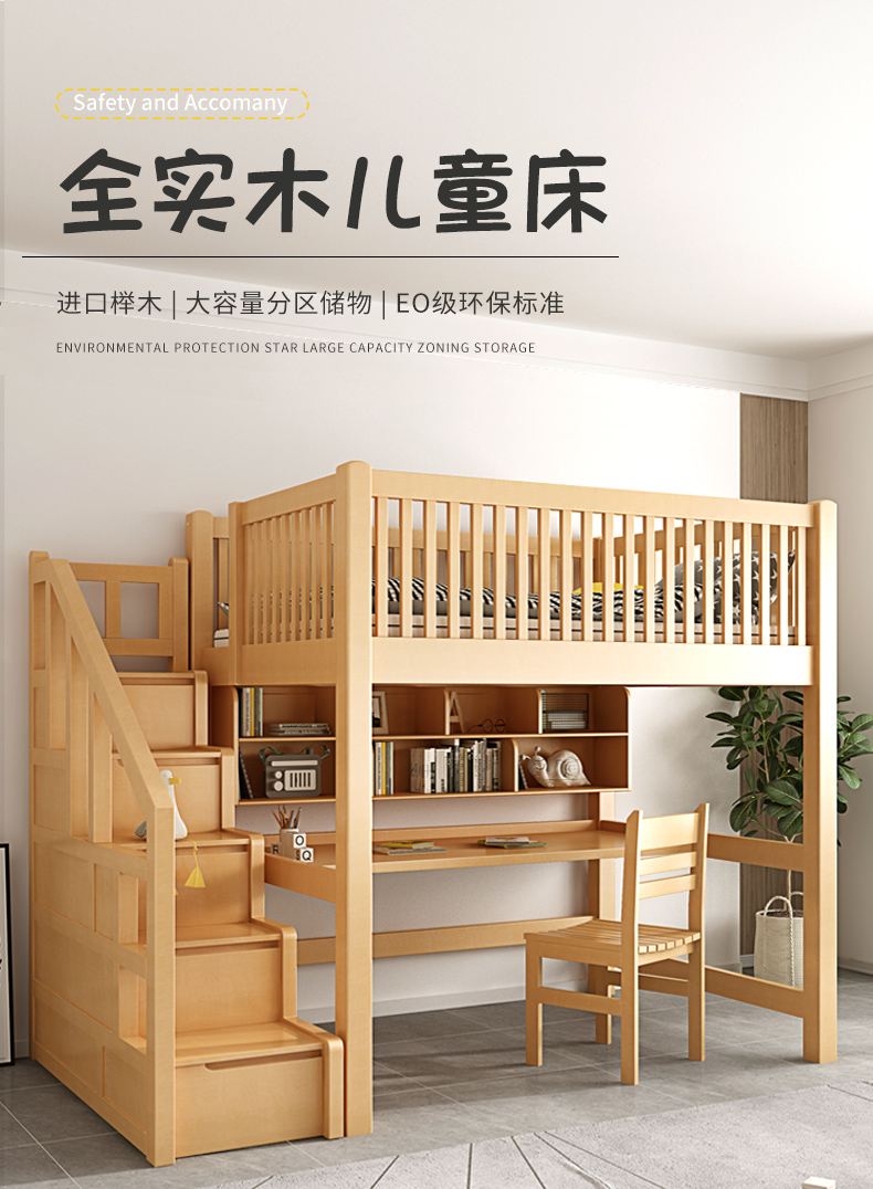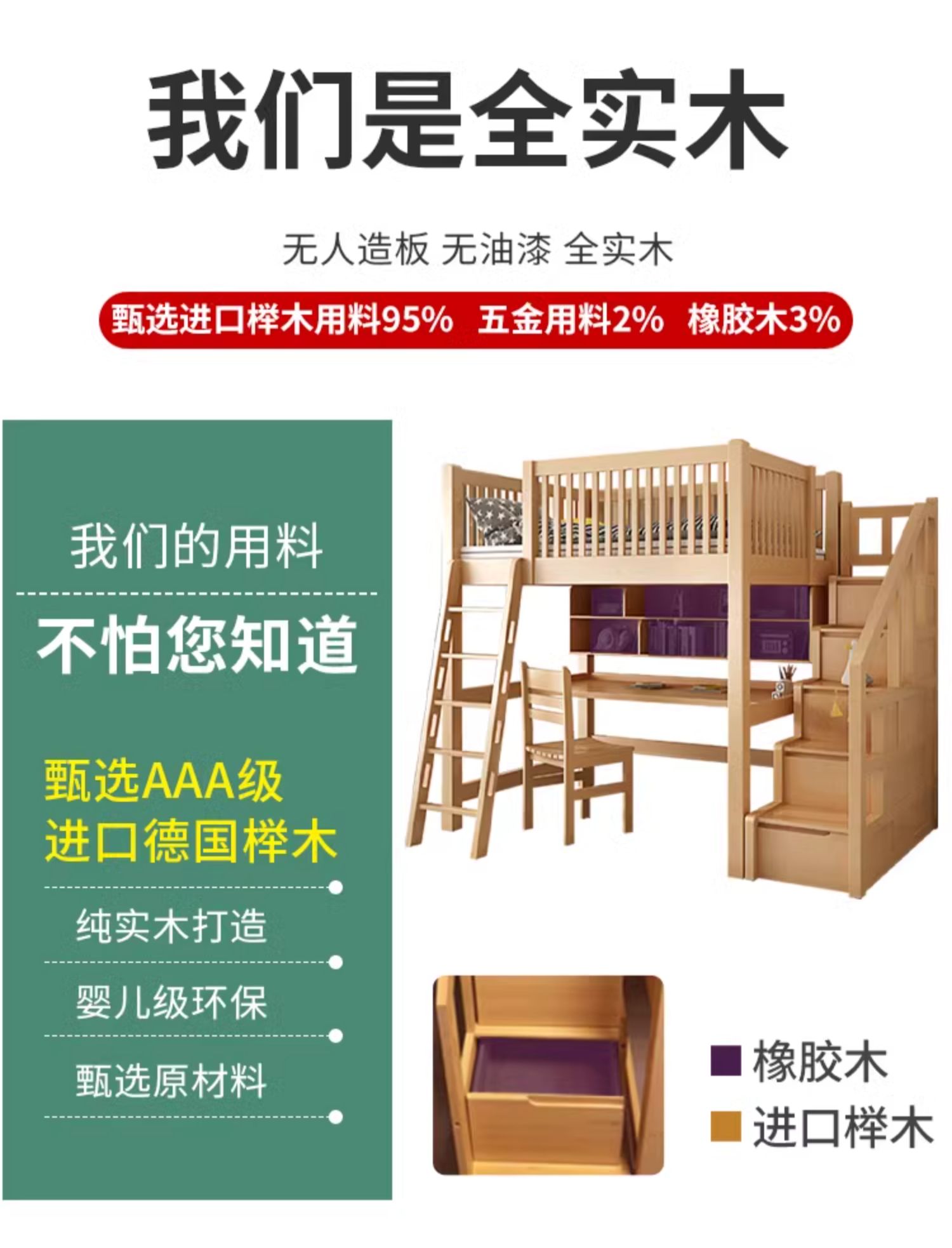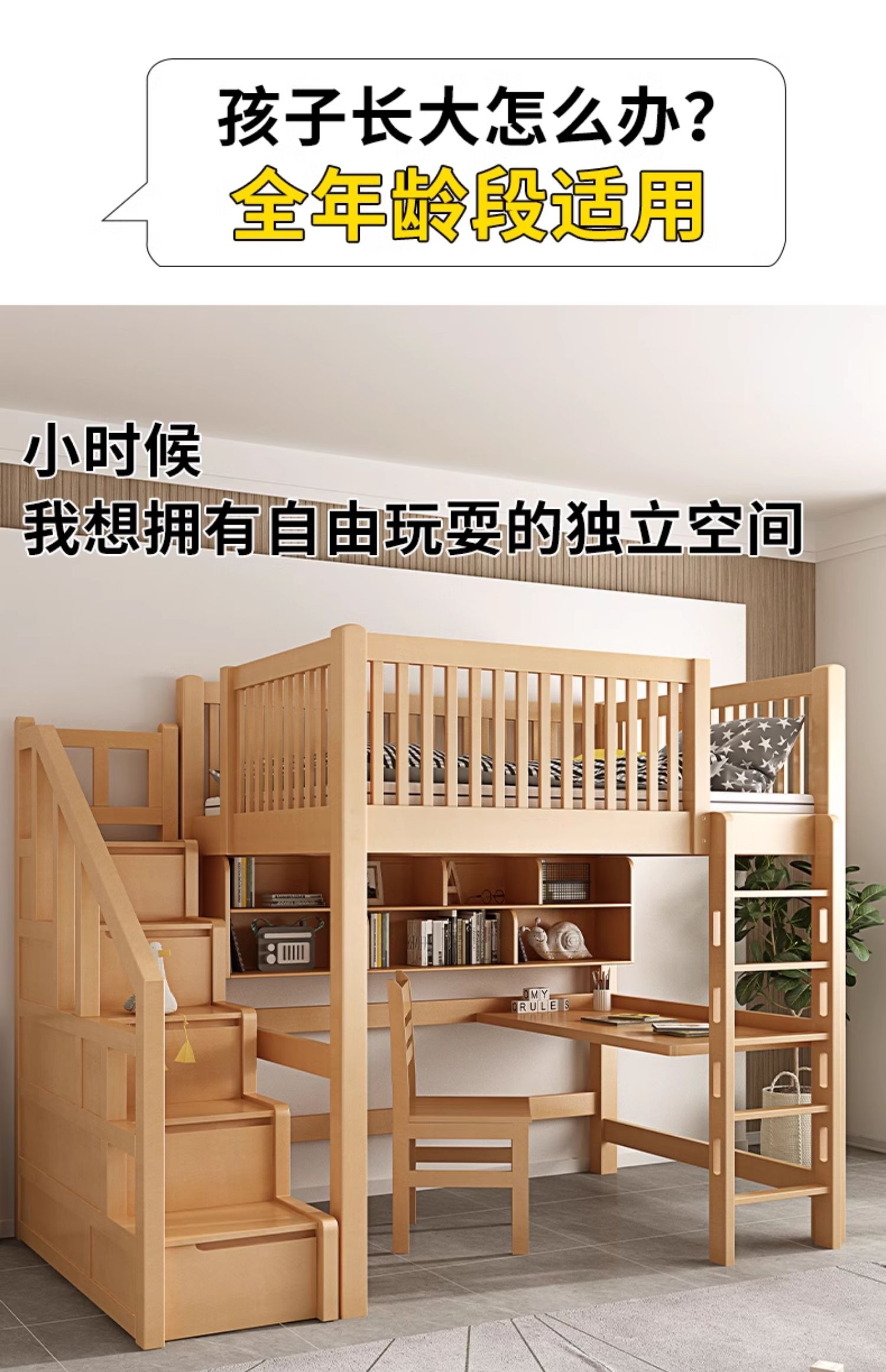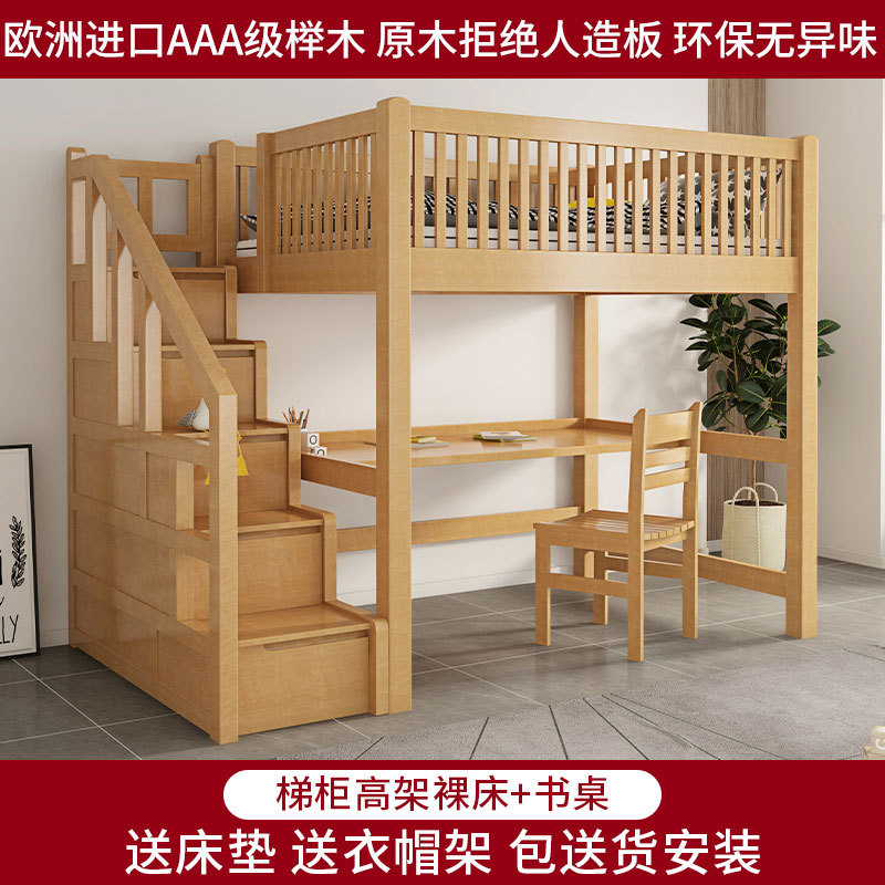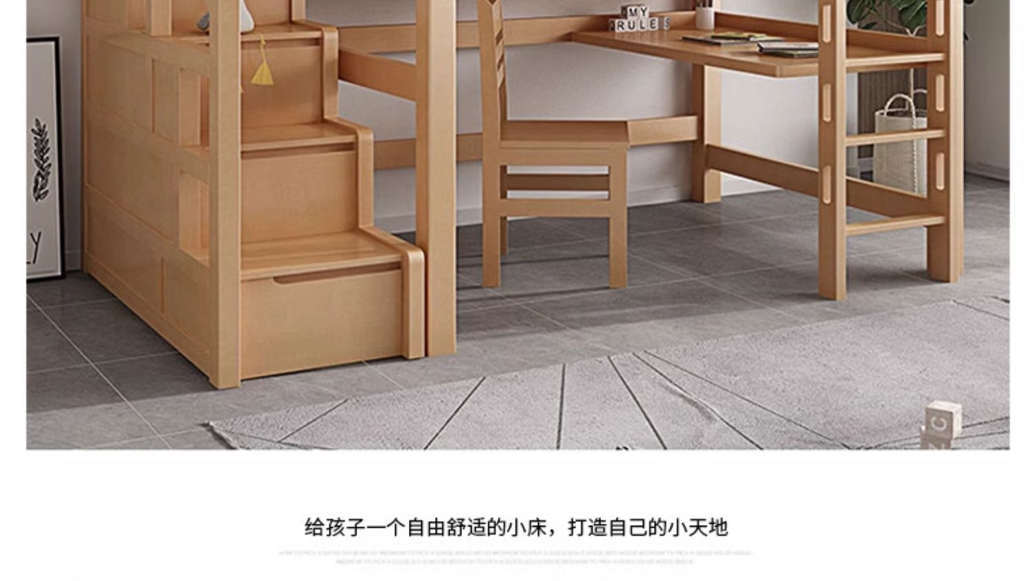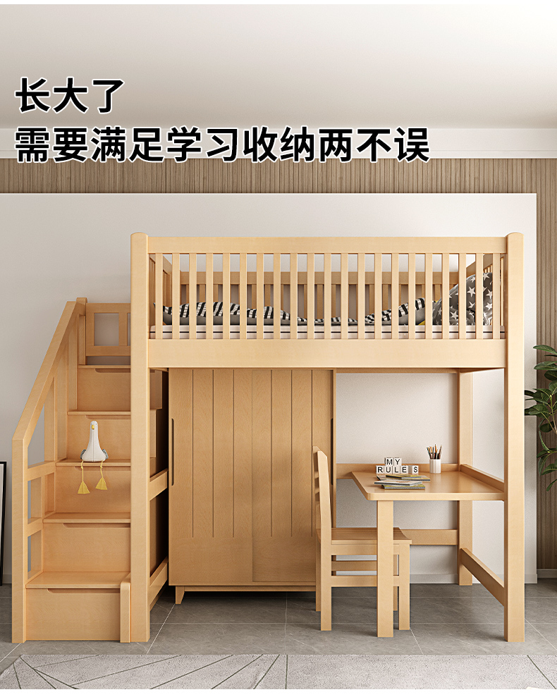 • 사다리형 침대 + 책장 + 책상 + 싱글 옷장 + 무접착 코코넛 야자 매트리스 * 1 (전체 원목 - AAA 등급 너도밤나무)