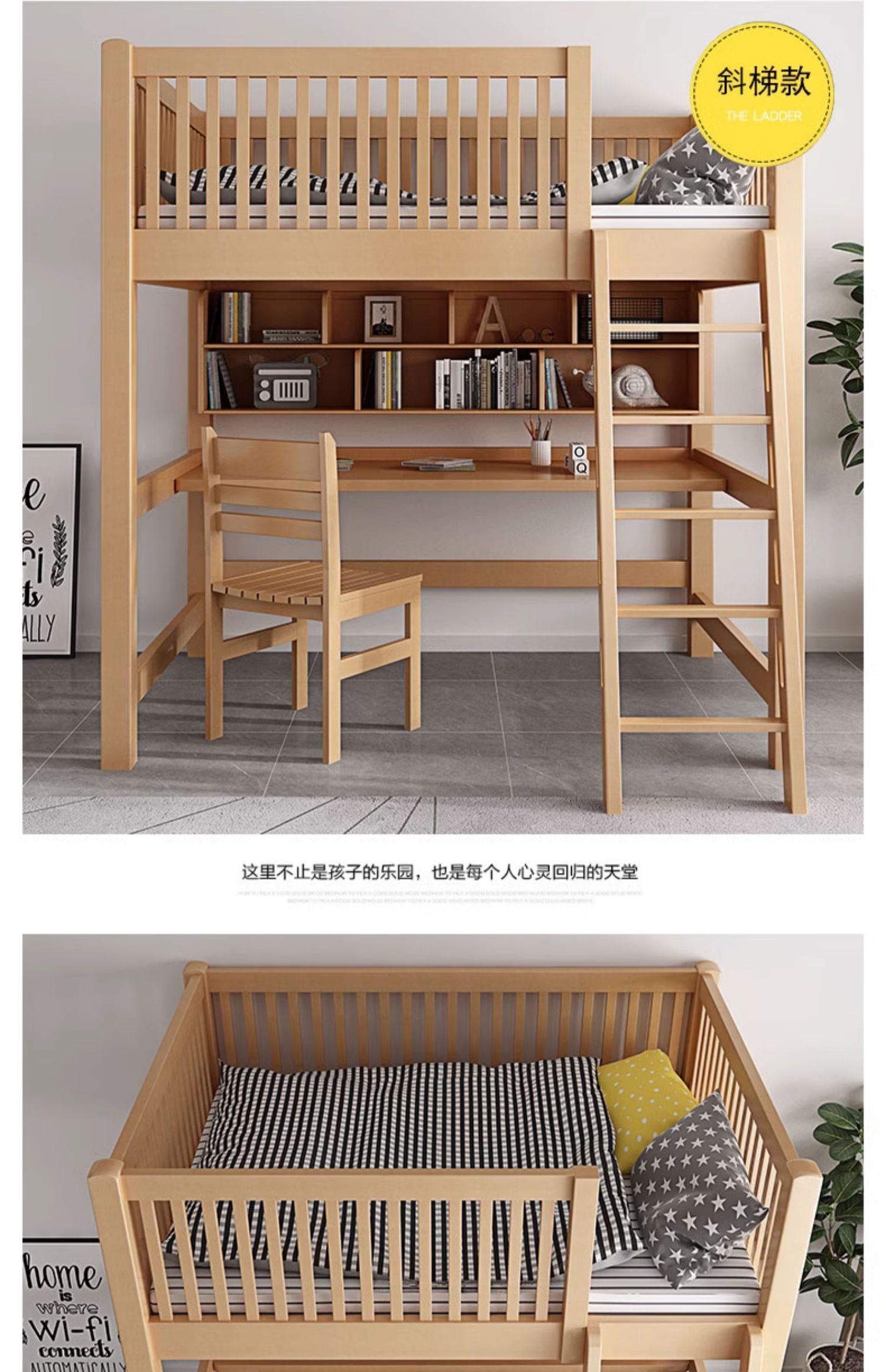 • 사다리형 침대 + 책장 + 책상 + 무접착 코코넛 야자 매트리스 * 1 (전체 원목 - AAA 등급 너도밤나무)