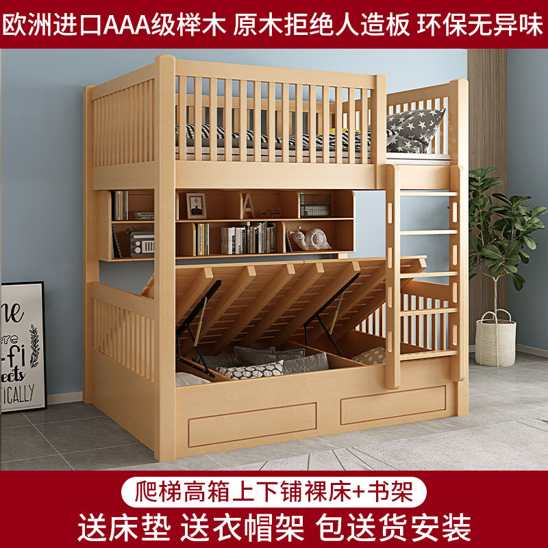 • 사다리 캐비닛, 높은 상자 수납 이층 침대 + 책장 + 무료 무접착 코코넛 야자 매트리스*2(모두 단단한 목재 - AAA 등급 너도밤나무로 제작)