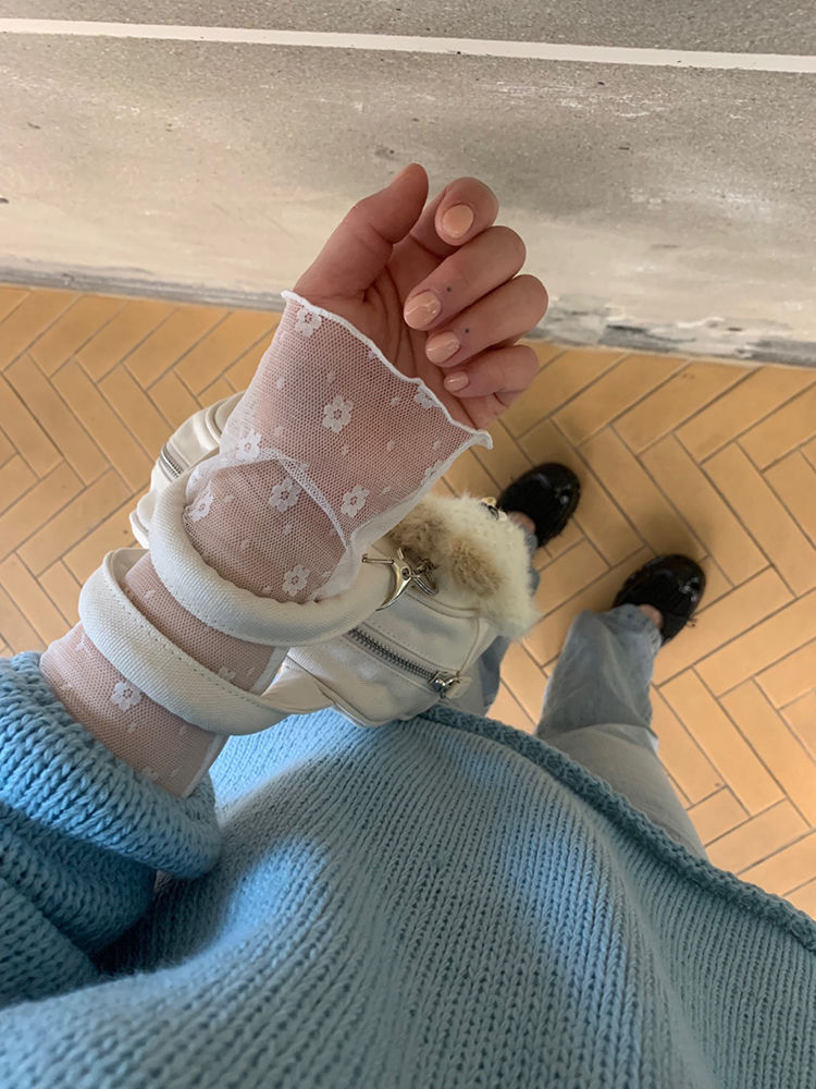 핫걸 레이어드 작은 꽃 자외선 차단 메쉬 레이스 하프 터틀넥 여름 여성 긴팔 티셔츠 베이스 레이어 탑스토어 가기