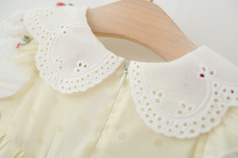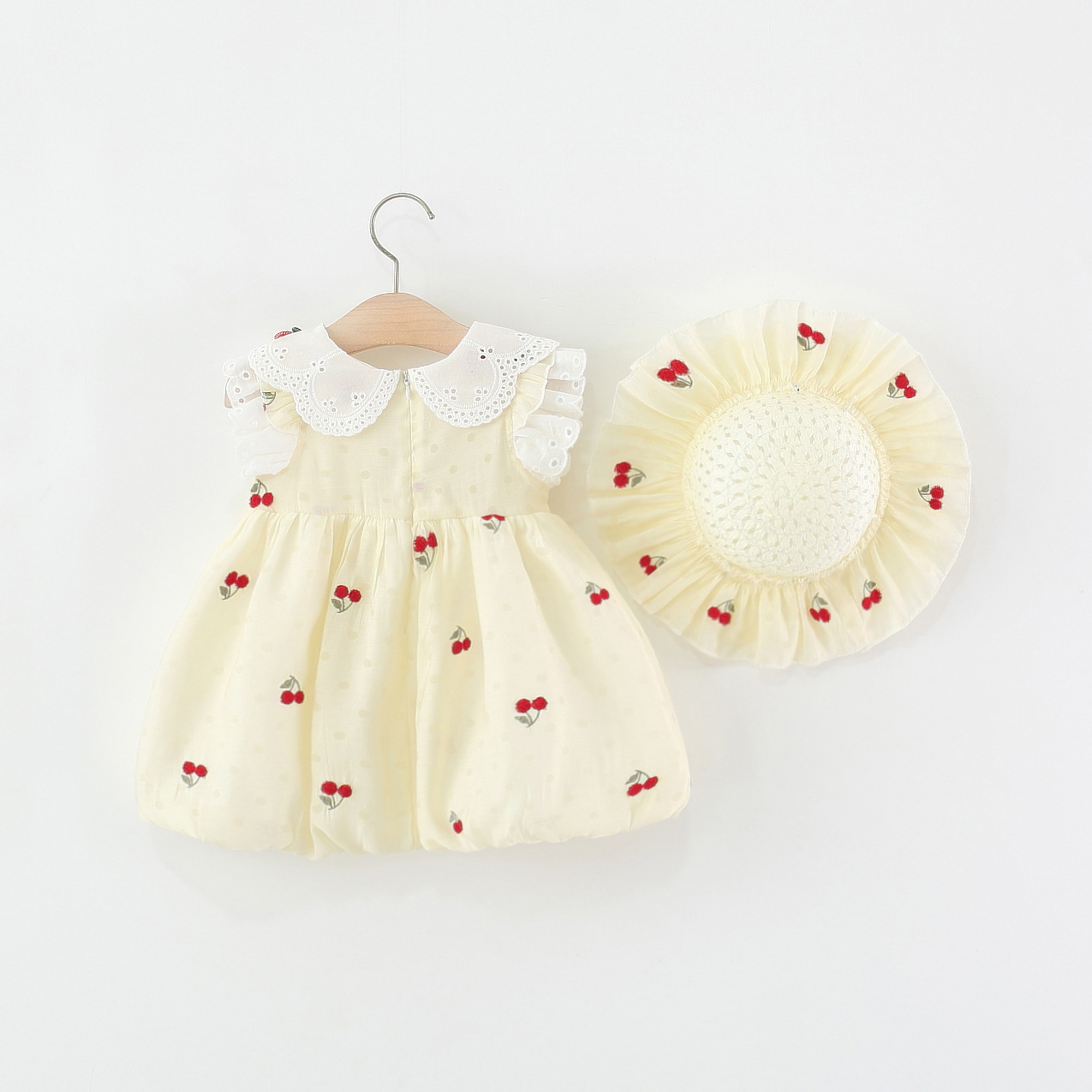 2025 여름 새로운 레이스 체리 칼라 원피스 소녀 한국 레이스 플라잉 슬리브 스커트 밀짚 모자