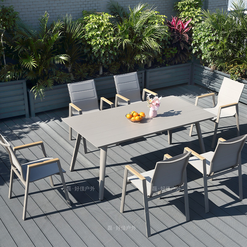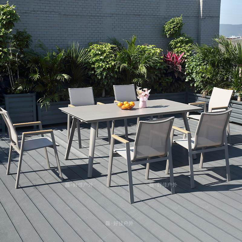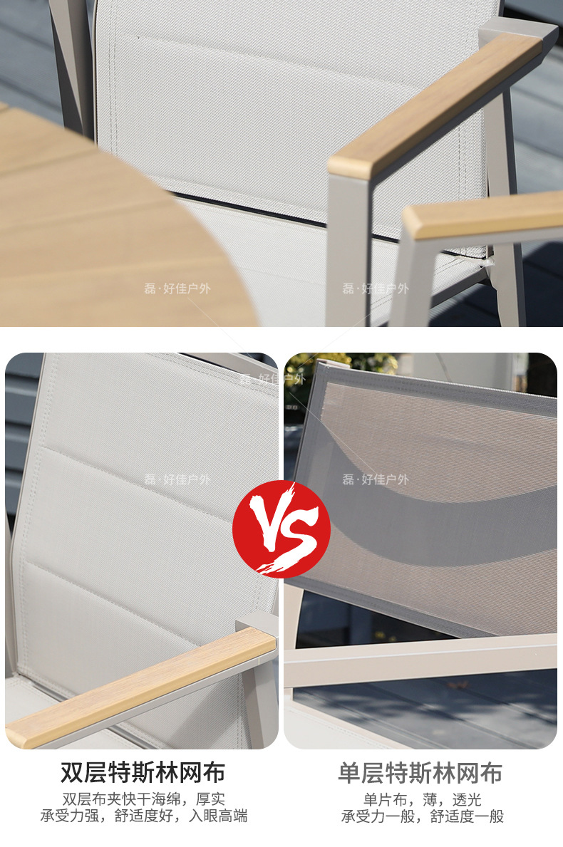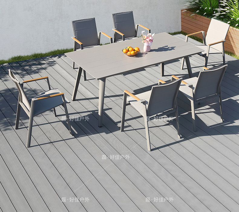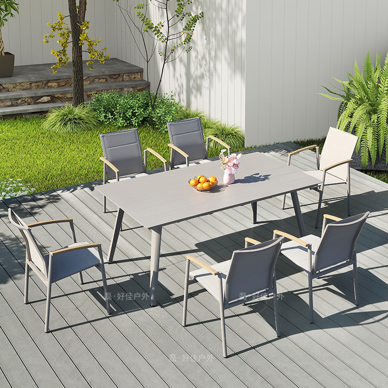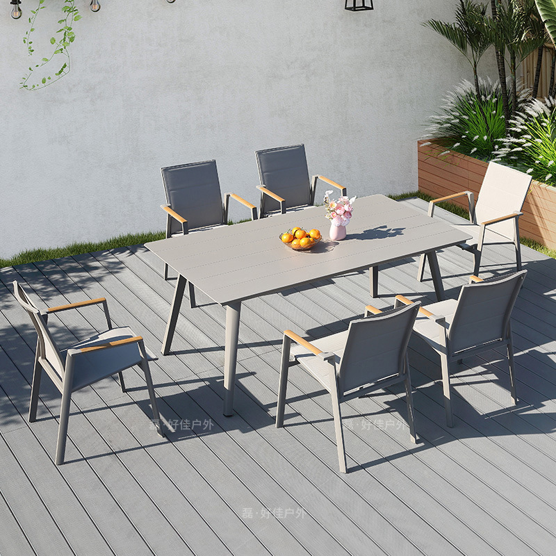 • 6개의 플라스틱 나무 팔걸이 이중 천 의자(원형 튜브) + 150*90cm 알루미늄 판 긴 테이블
