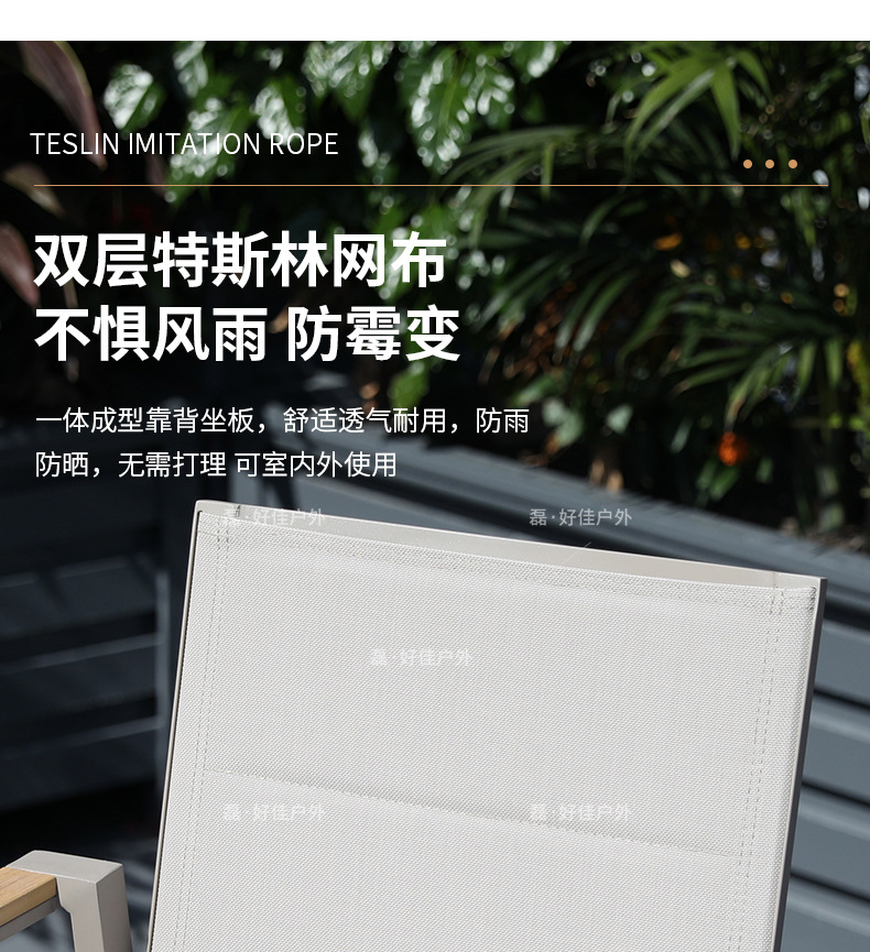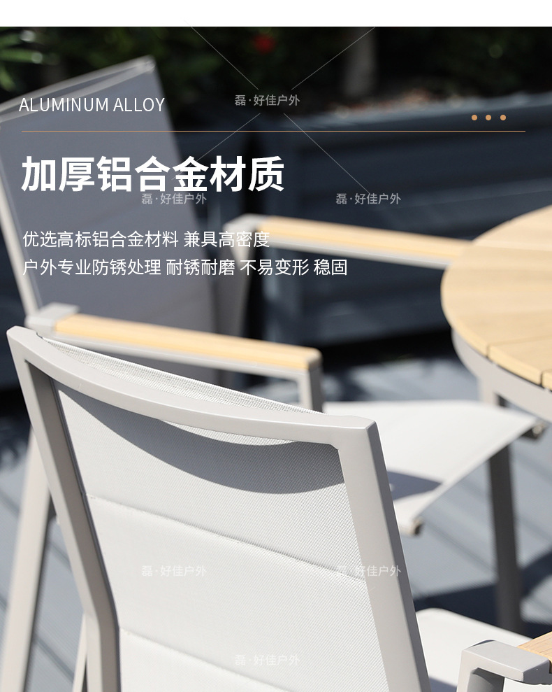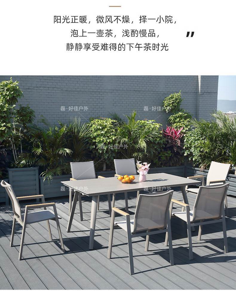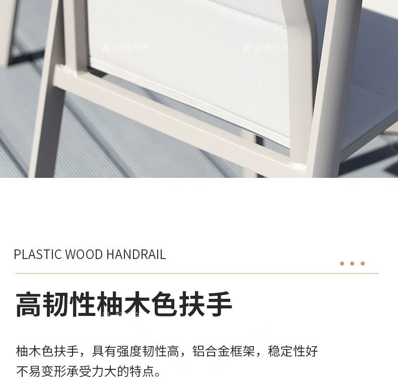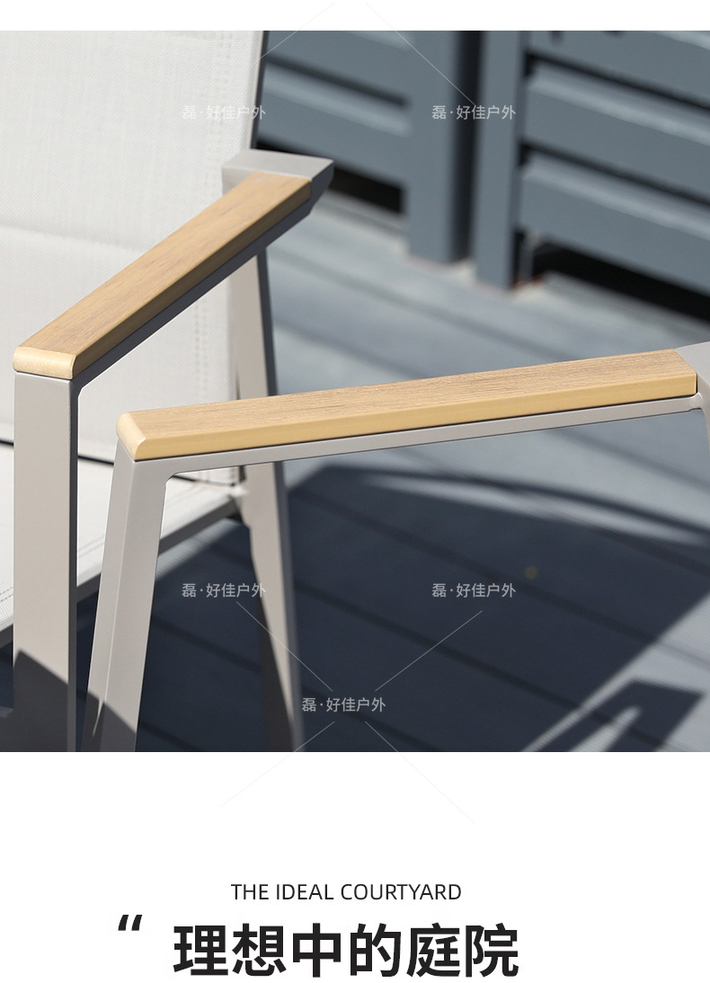 • 6개의 플라스틱 나무 팔걸이 이중 천 의자(원형 튜브) + 150*90cm 알루미늄 판 긴 테이블
