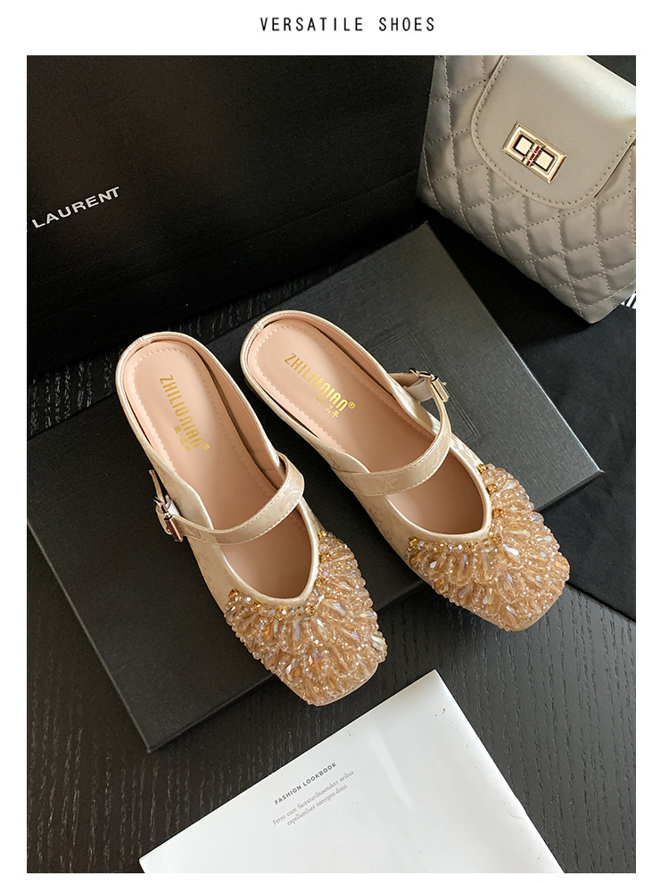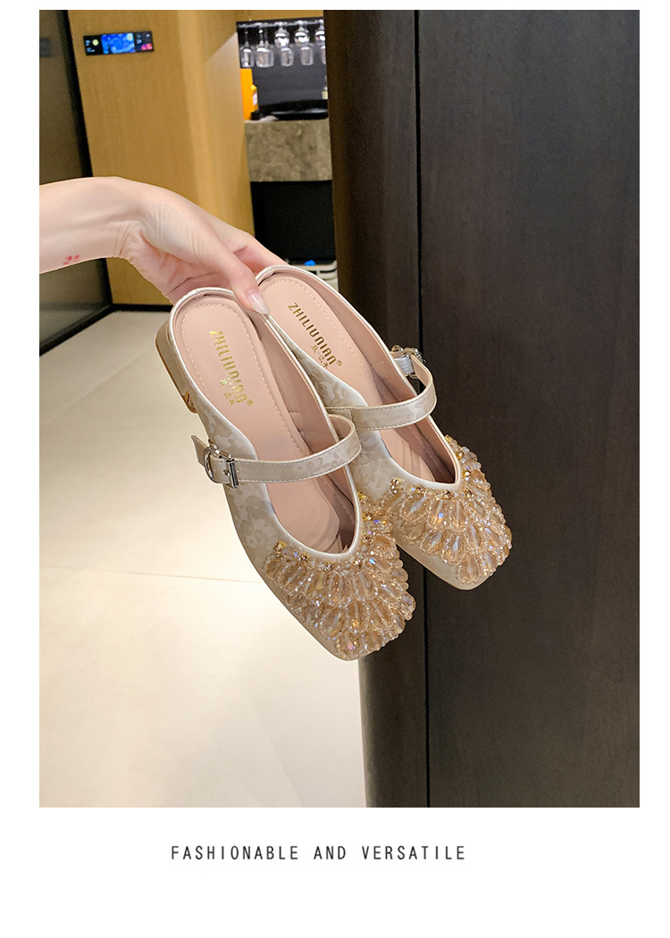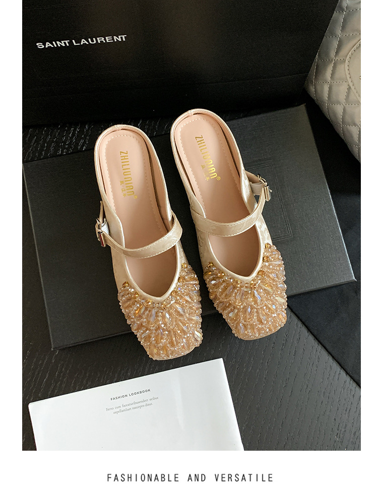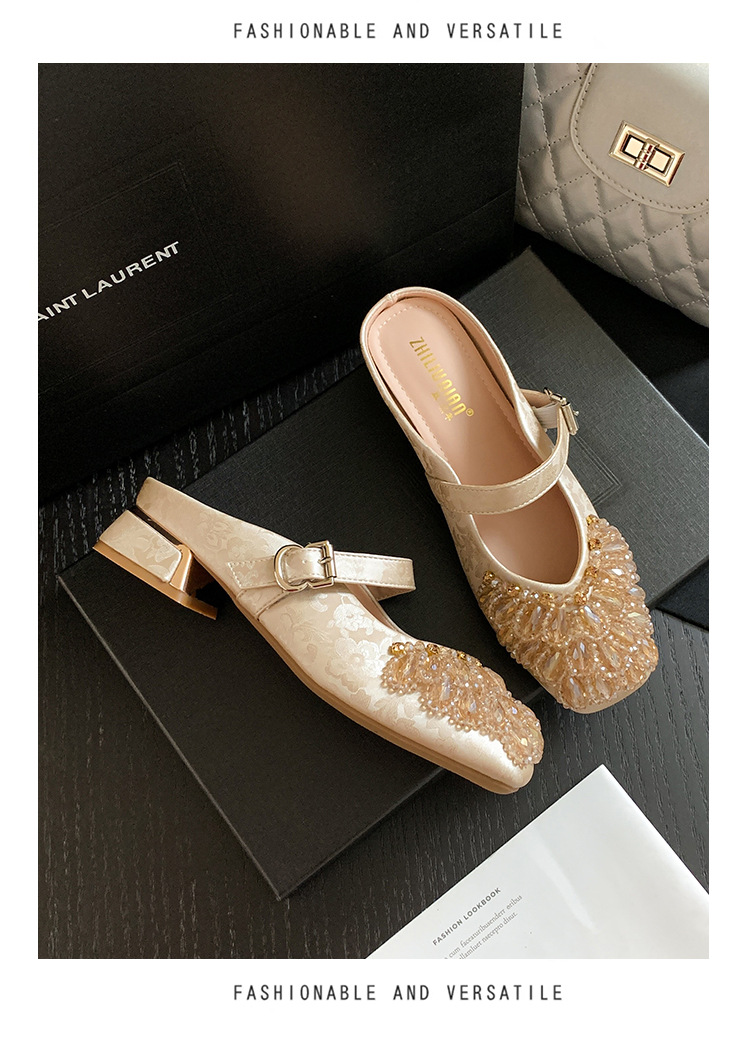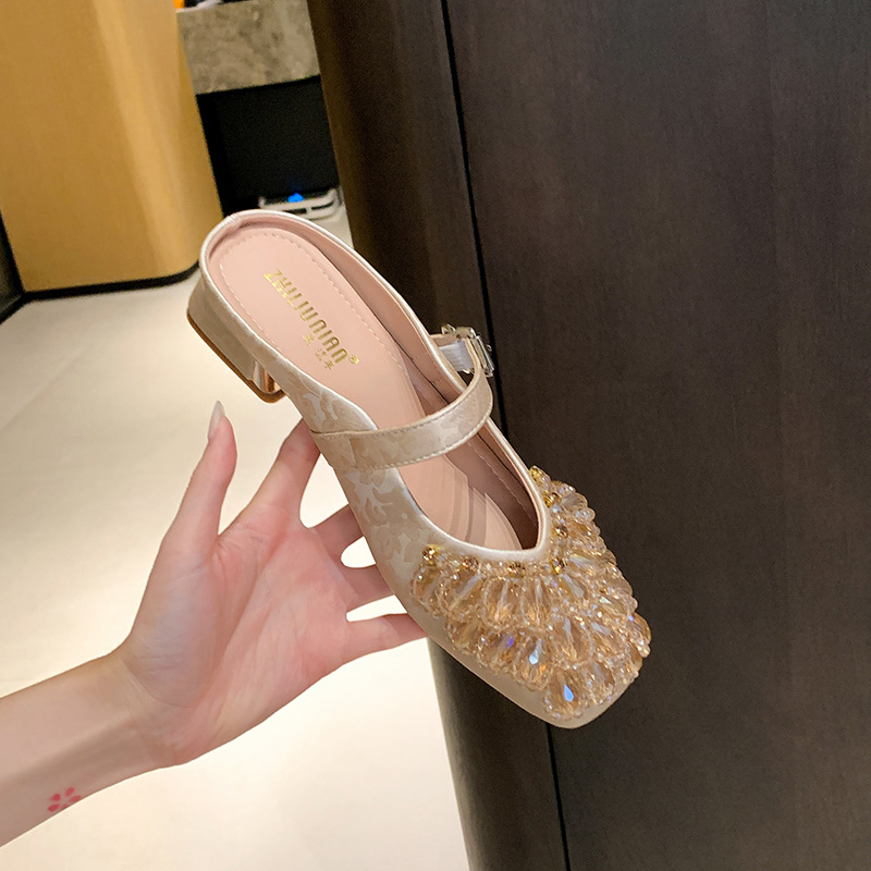 777-P2 중국 스타일 2025 여름 신작 스퀘어 토 싱글 슈즈 두꺼운 굽 중간 굽 비즈 여성 신발 바오터우 하프 슬리퍼 다용도스토어 가기