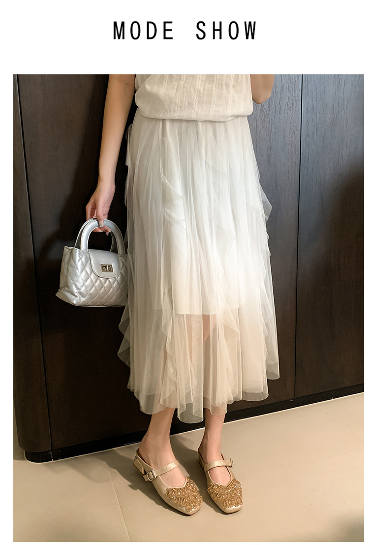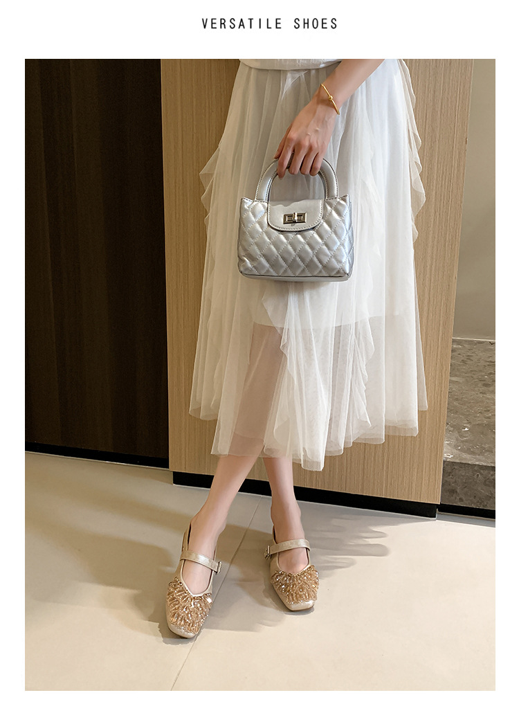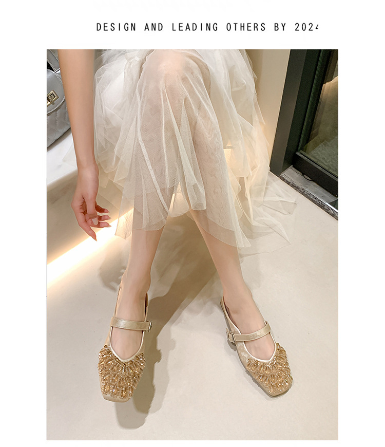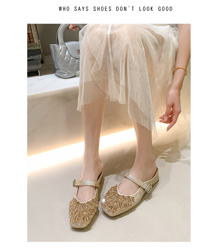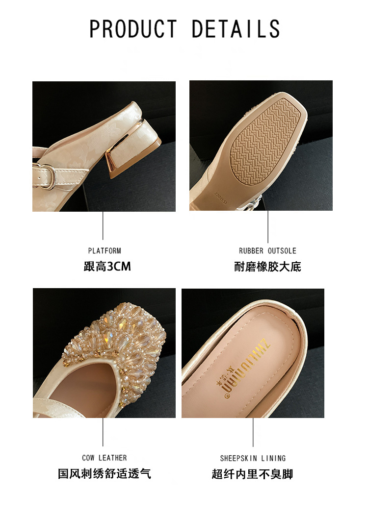 777-P2 중국 스타일 2025 여름 신작 스퀘어 토 싱글 슈즈 두꺼운 굽 중간 굽 비즈 여성 신발 바오터우 하프 슬리퍼 다용도스토어 가기