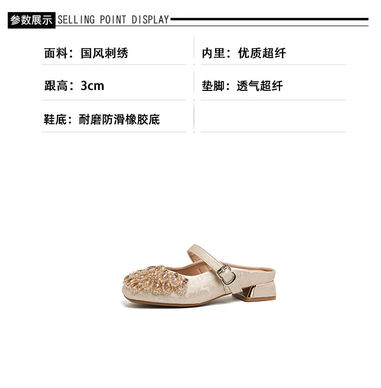 777-P2 중국 스타일 2025 여름 신작 스퀘어 토 싱글 슈즈 두꺼운 굽 중간 굽 비즈 여성 신발 바오터우 하프 슬리퍼 다용도