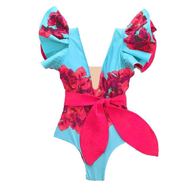 블루 핑크 꽃무늬 V 넥 원피스 수영복 러플 숄더 슬리브 보우 타이 수영복 여성 유럽 및 미국 국경 간 대외 무역