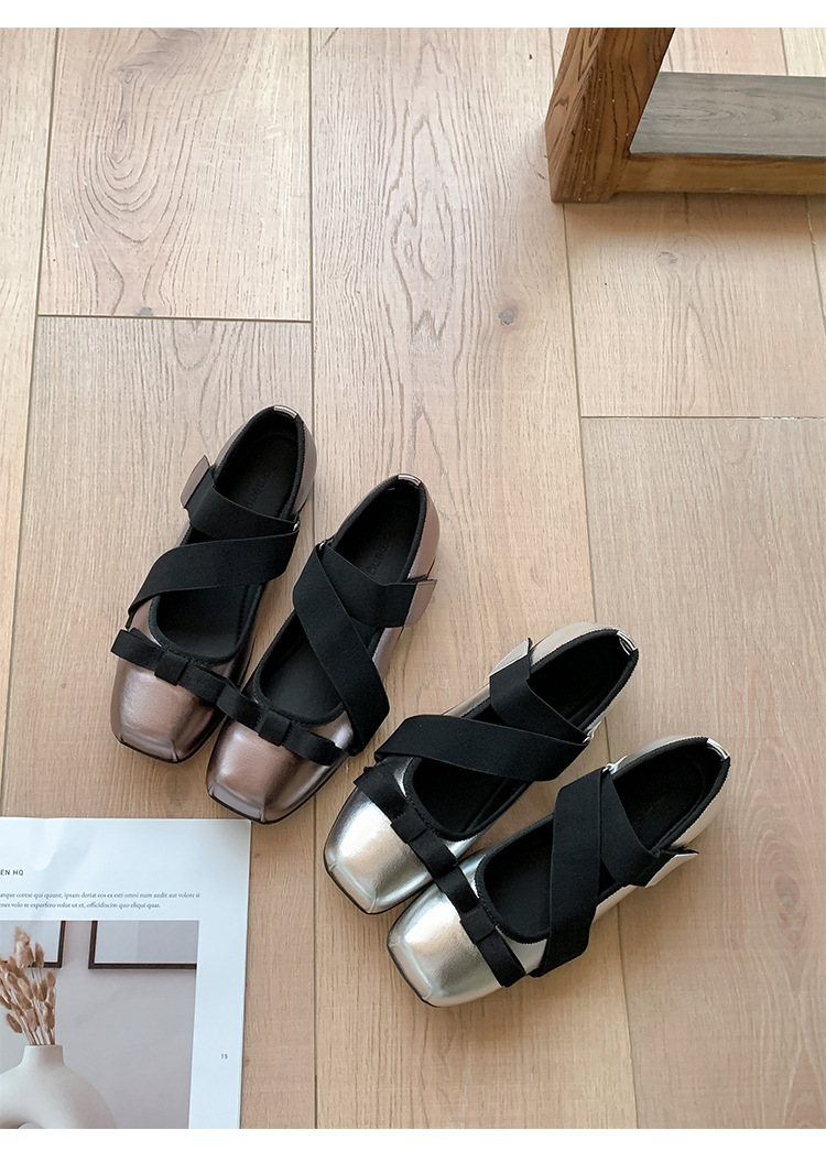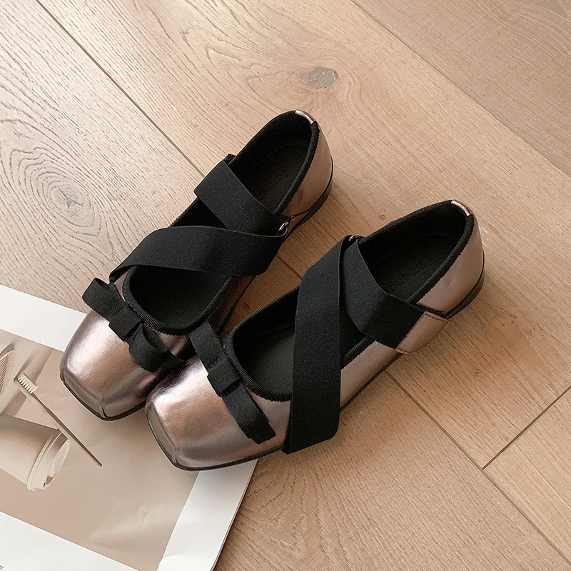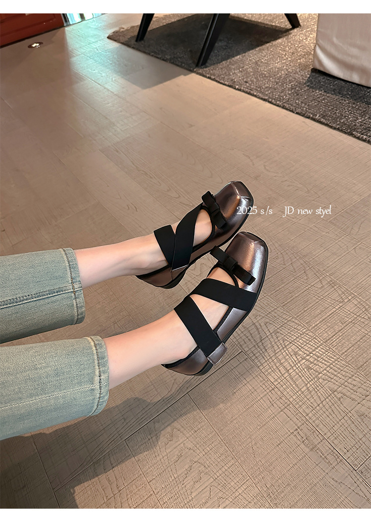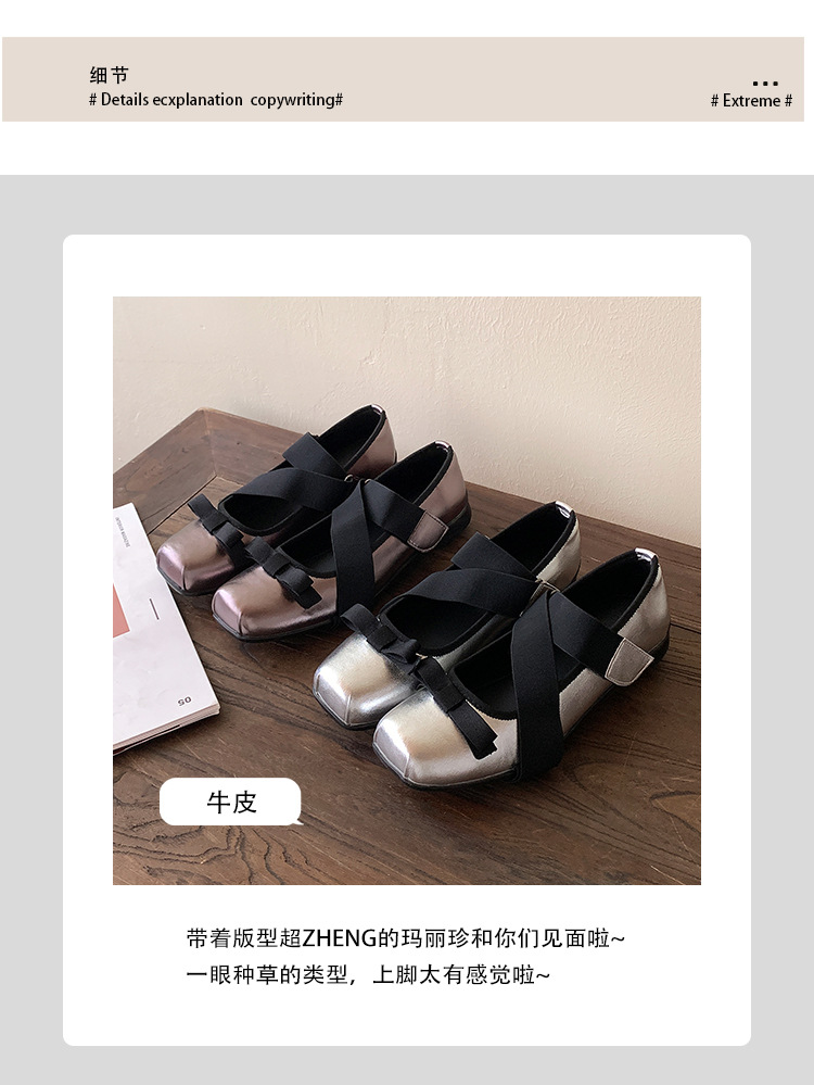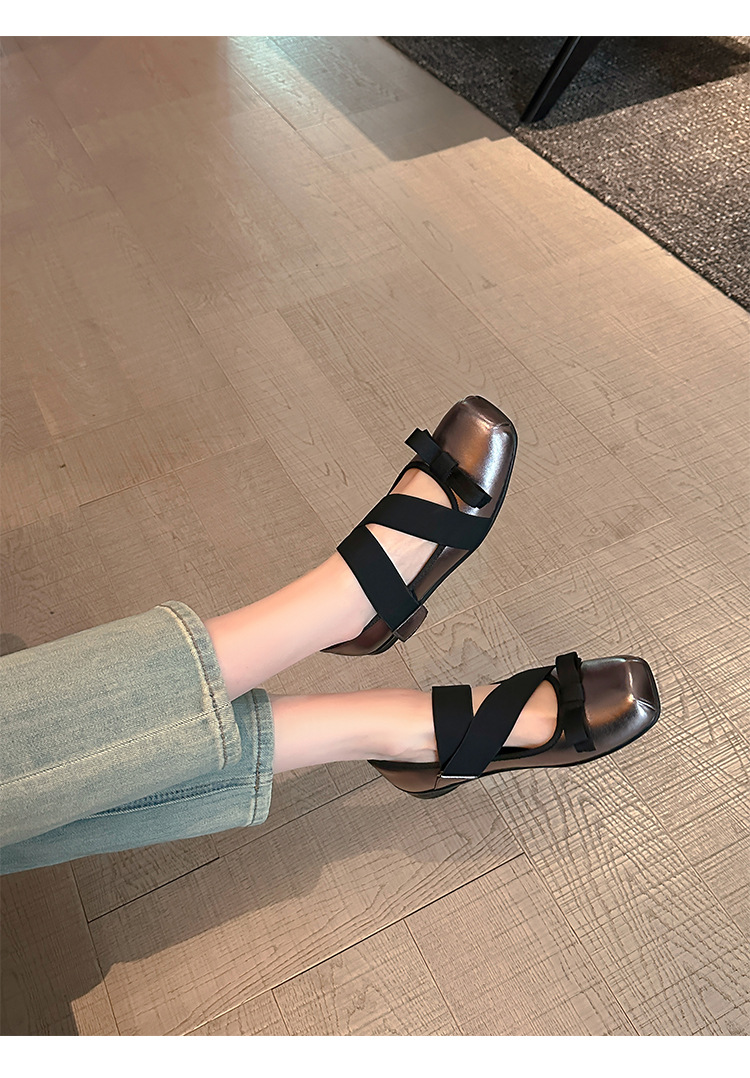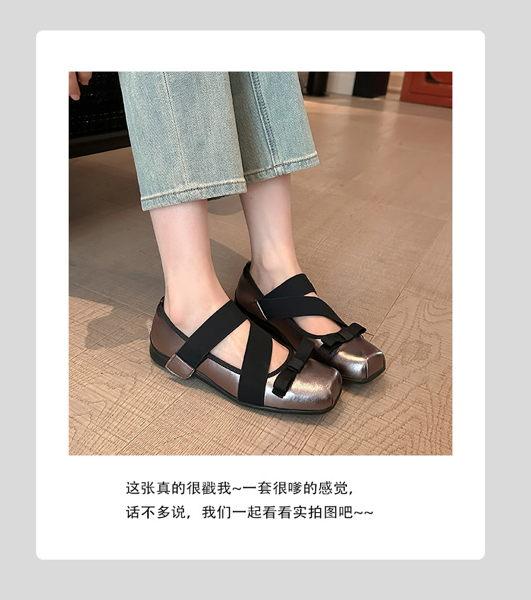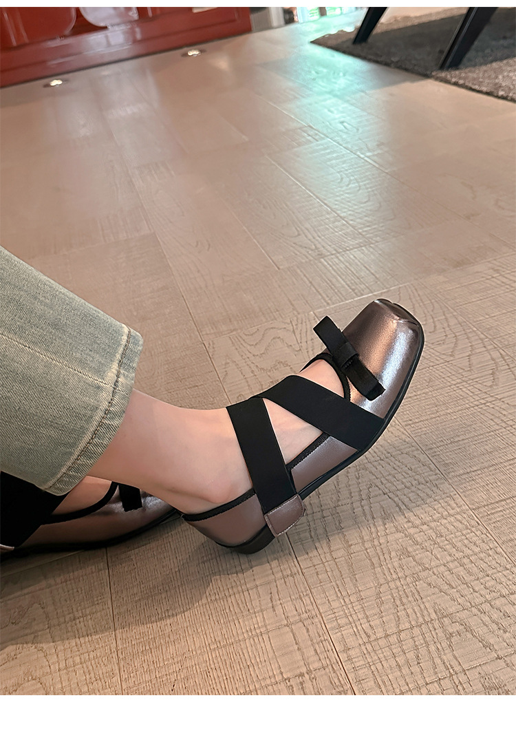 여성을위한 정품 가죽 발레 신발 2025 봄과 여름 복고풍 크로스 스트랩 영국 스타일 스퀘어 토 보우 메리 제인 신발스토어 가기