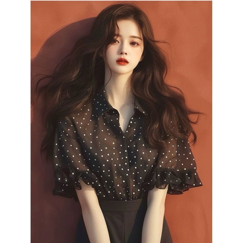 여성을위한 블랙 폴카 도트 러플 쉬폰 반팔 셔츠 여름 2025 새로운 스타일 프랑스 스타일 하이 엔드 기질 탑