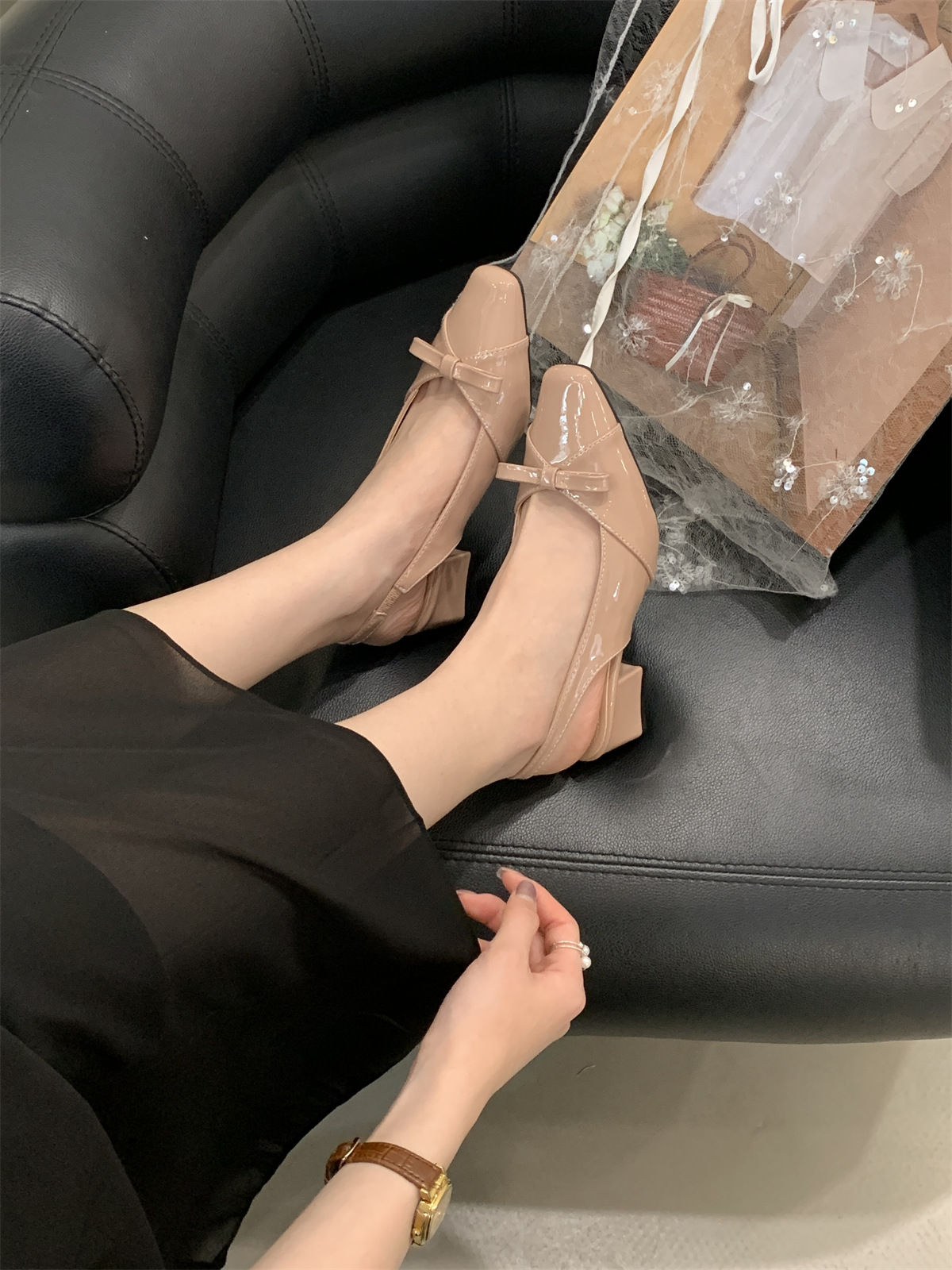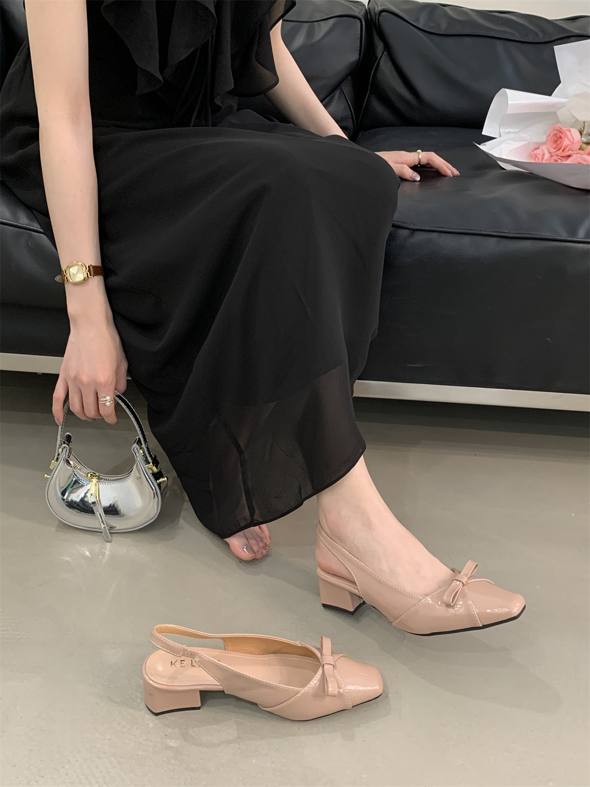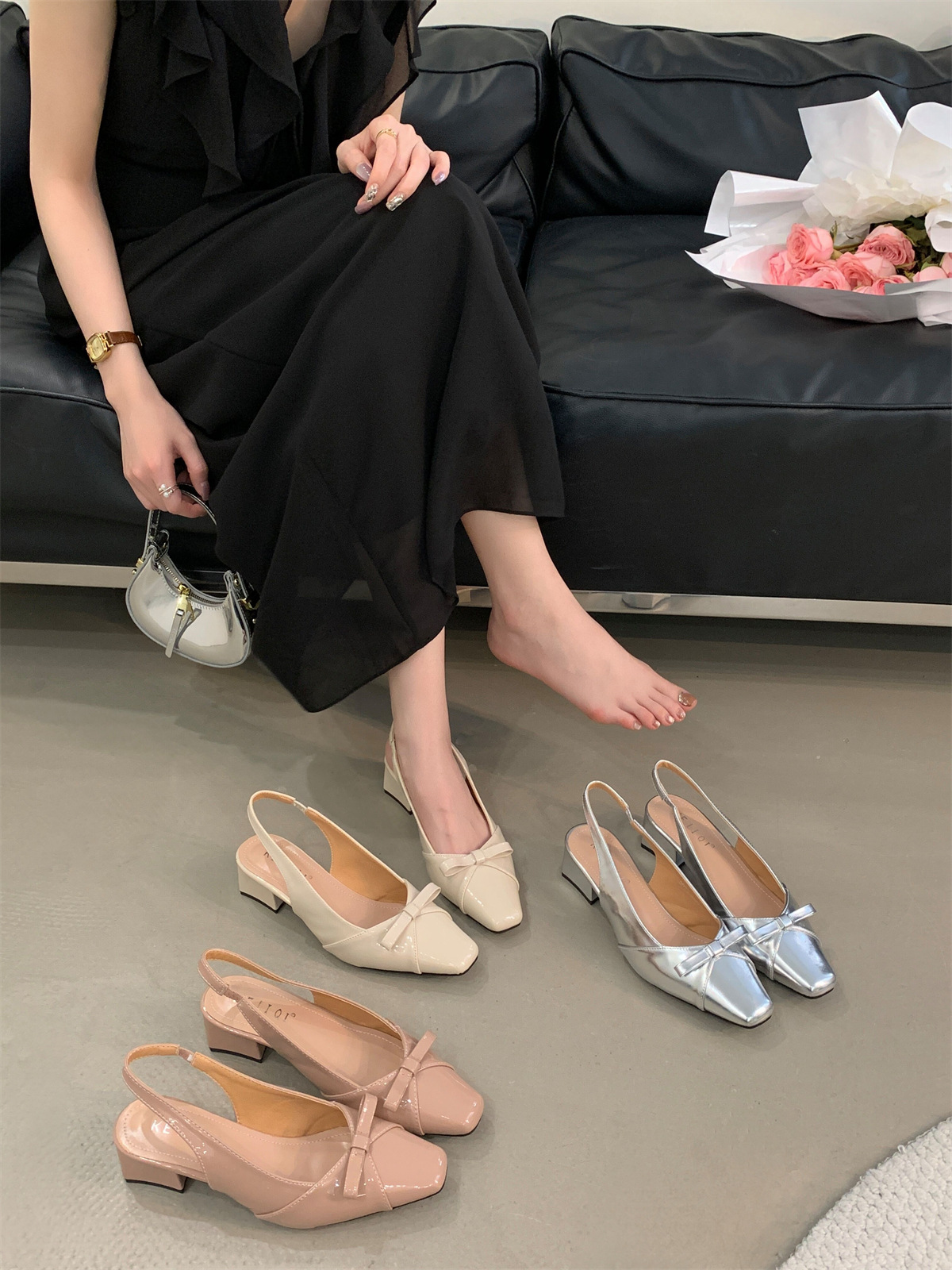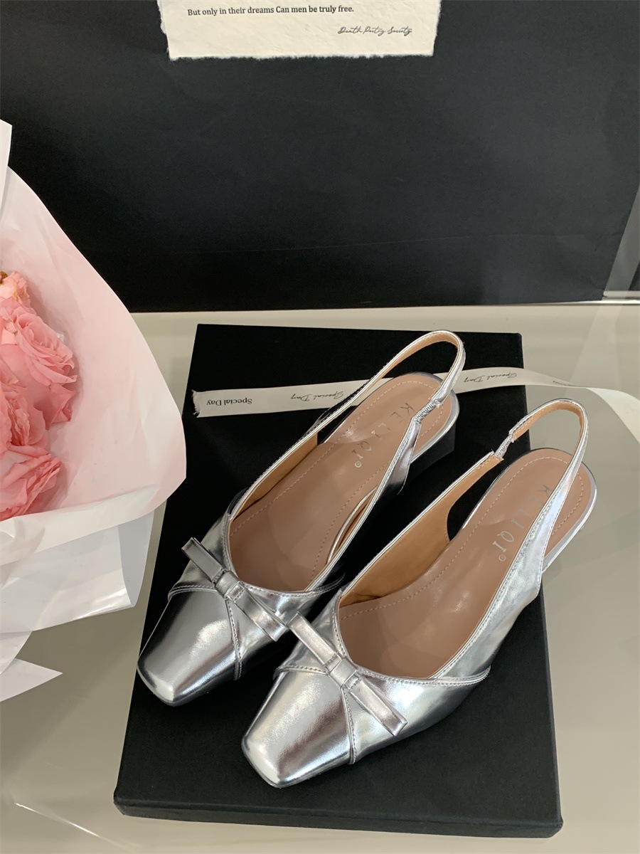 두꺼운 미드힐 프렌치 스퀘어 토 보우 샌들 여름 신상 슬립온 슈즈 스커트 요정 신발스토어 가기