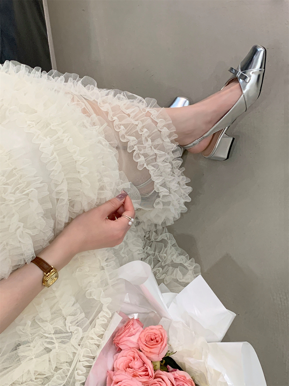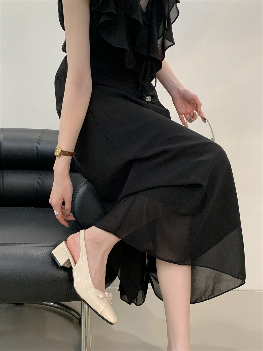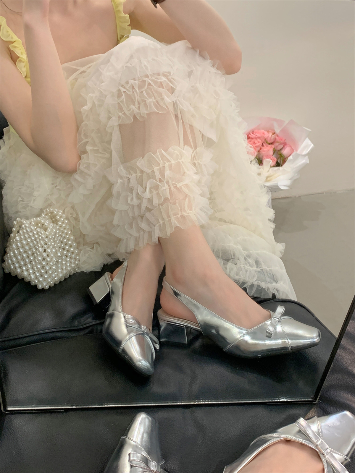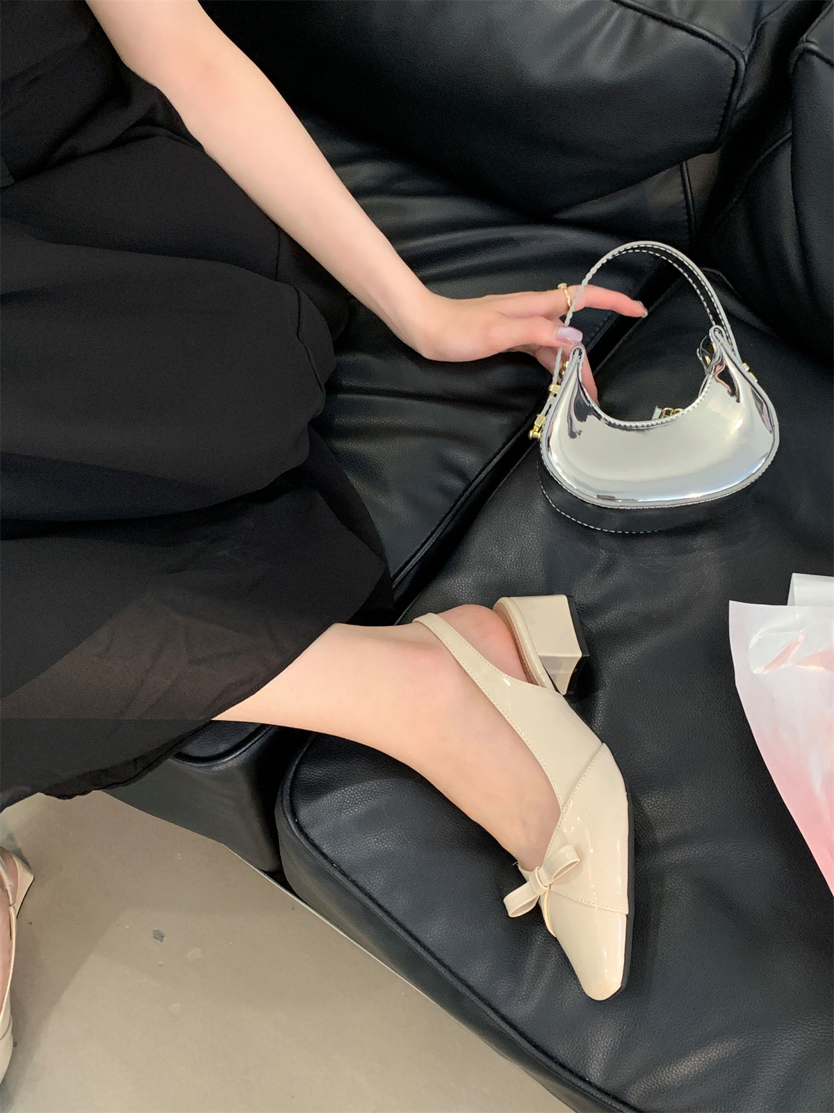 두꺼운 미드힐 프렌치 스퀘어 토 보우 샌들 여름 신상 슬립온 슈즈 스커트 요정 신발스토어 가기