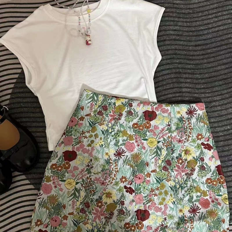 여성용 2025 여름 신작 슬림 라운드 넥 탑 하이 웨이스트 슬림 자카드 스커트 투피스 세트 트렌디