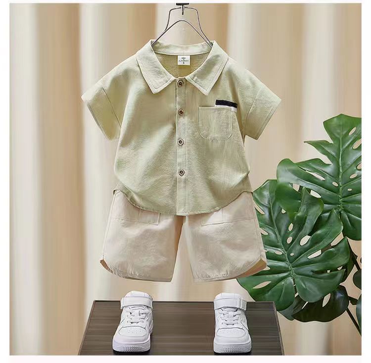 소년 여름 정장 면 및 린넨 2025 새로운 스타일 아동 패션 셔츠 반팔 투피스 세트 잘 생기고 트렌디함