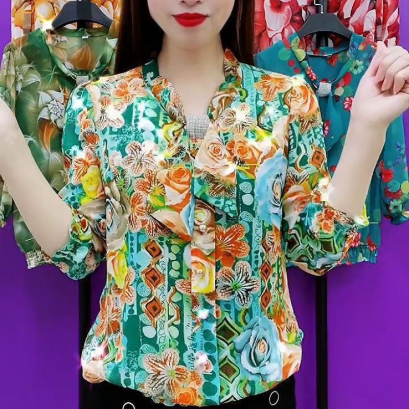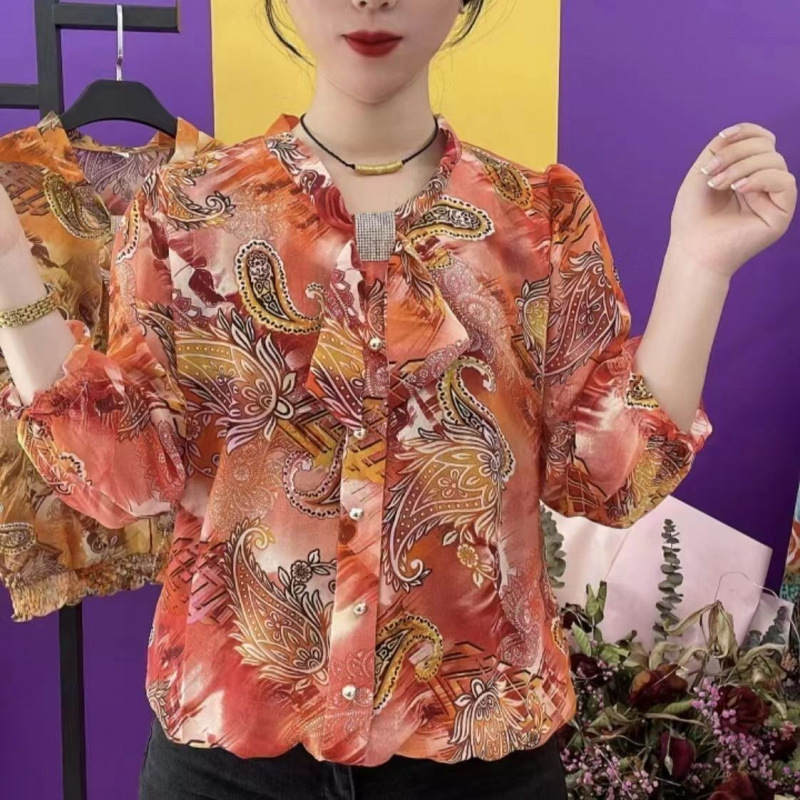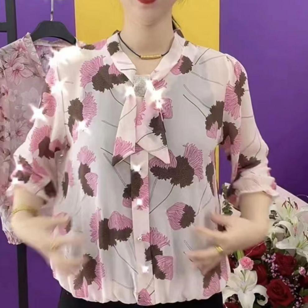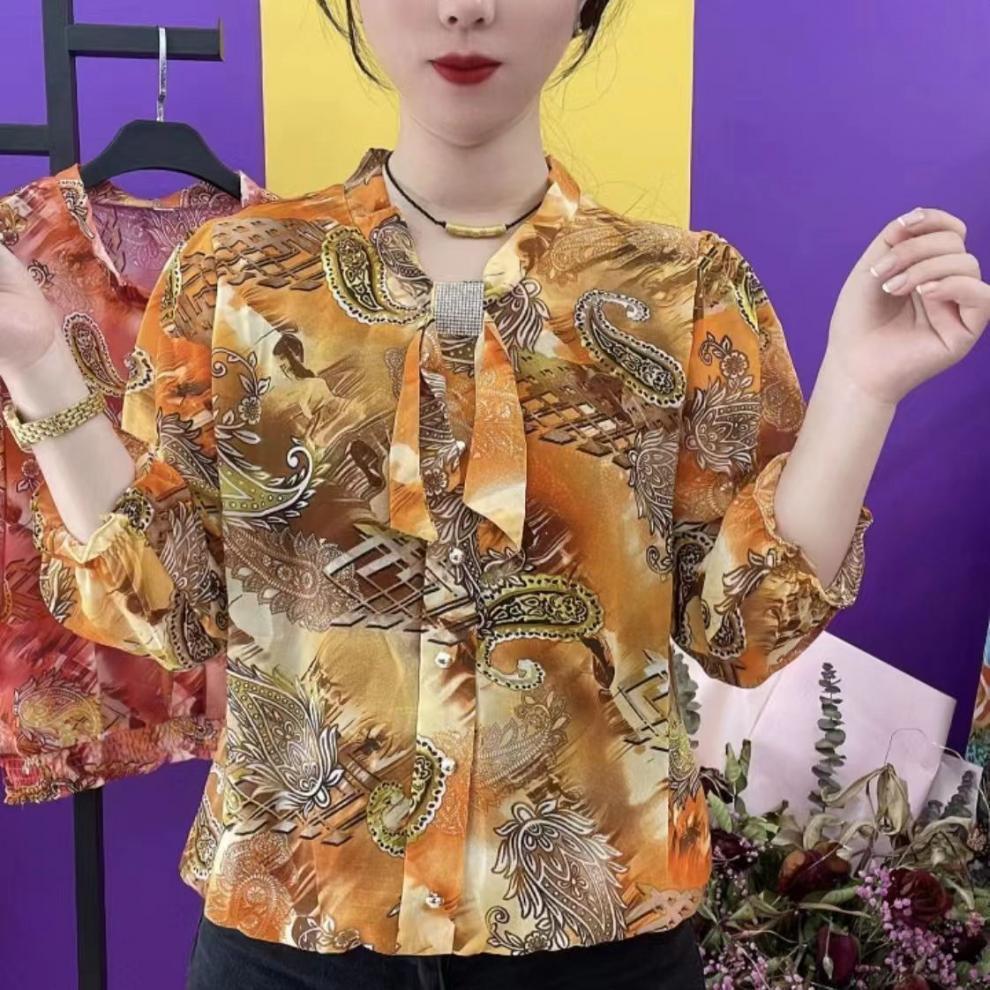 중년 엄마들을 위한 고급 프린트 셔츠, 새로운 여름 스타일, 루즈하고 활용도가 높은 패셔너블한 라펠, 나이를 줄여주는 쉬폰 셔츠스토어 가기