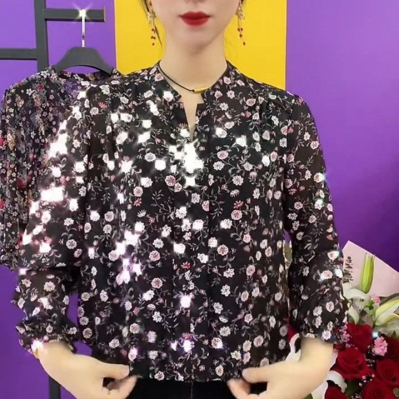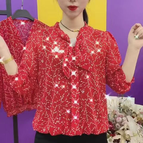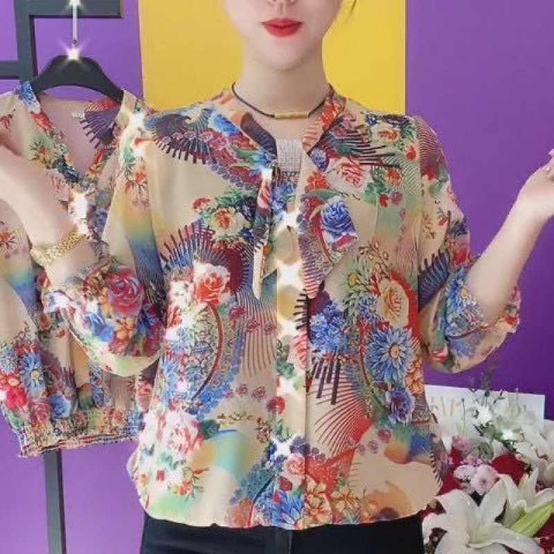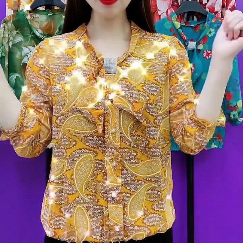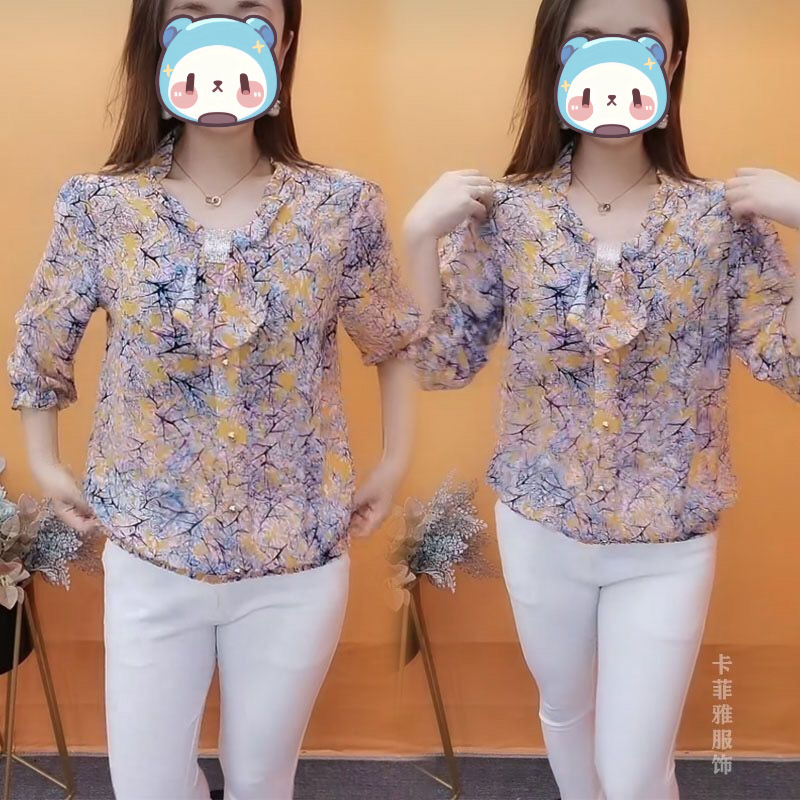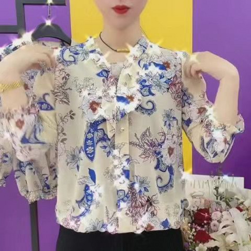 중년 엄마들을 위한 고급 프린트 셔츠, 새로운 여름 스타일, 루즈하고 활용도가 높은 패셔너블한 라펠, 나이를 줄여주는 쉬폰 셔츠스토어 가기