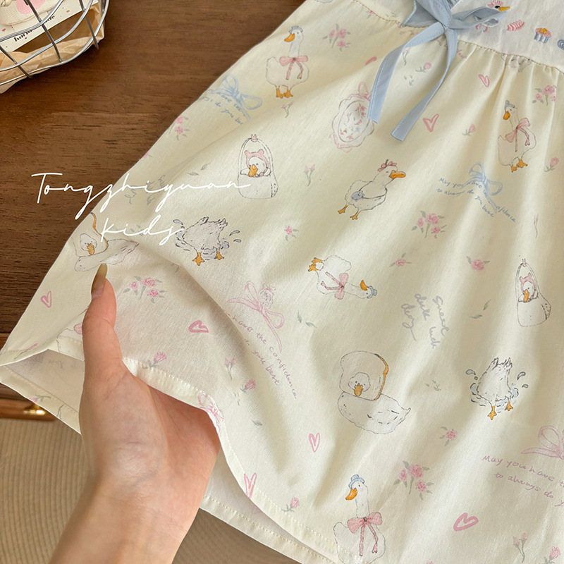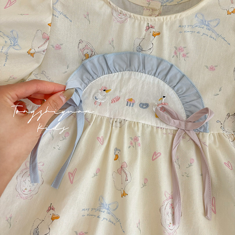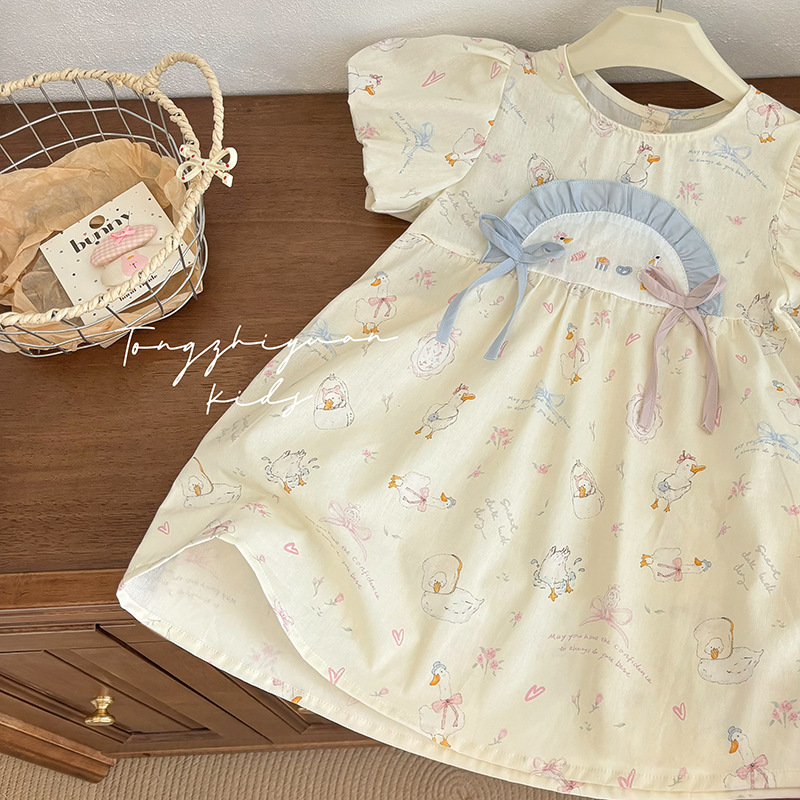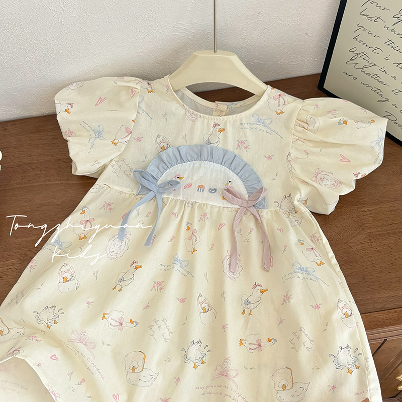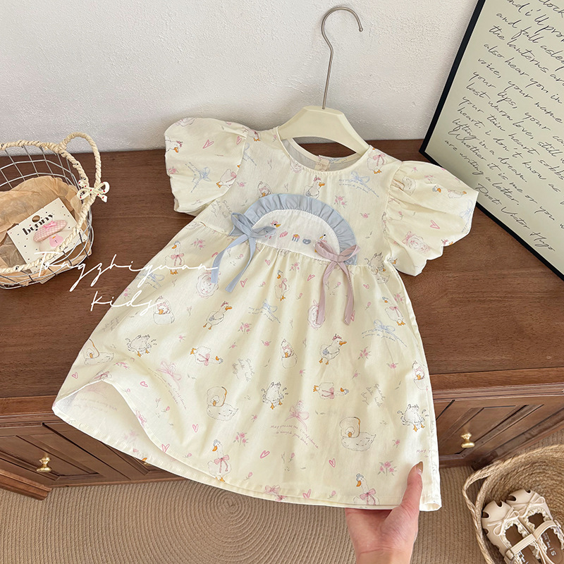 여자 여름 새로운 만화 오리 퍼프 슬리브 드레스 아기 소녀 캐주얼 패션 외국 스타일 품질 아동 의류 유행