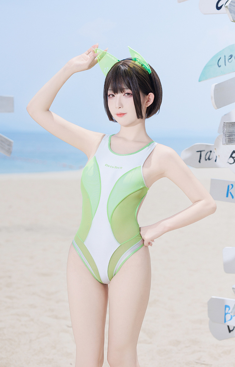그린 섀도우 경기용 수영복 원피스 메쉬 투명 스플라이싱 하이 슬릿 수영 2차원 코스 섹시하고 귀여운 온천