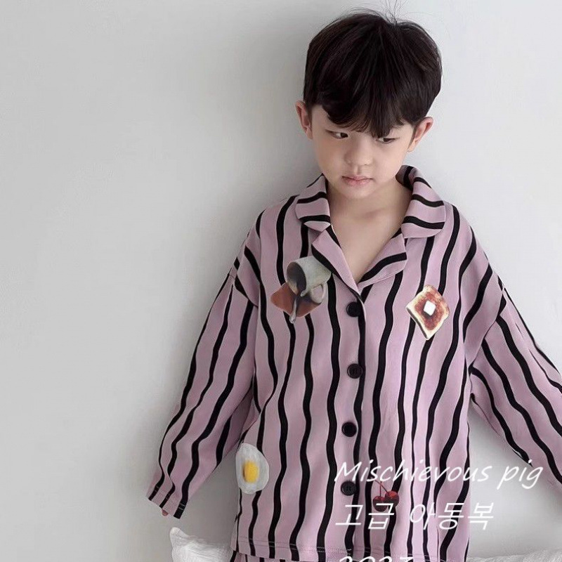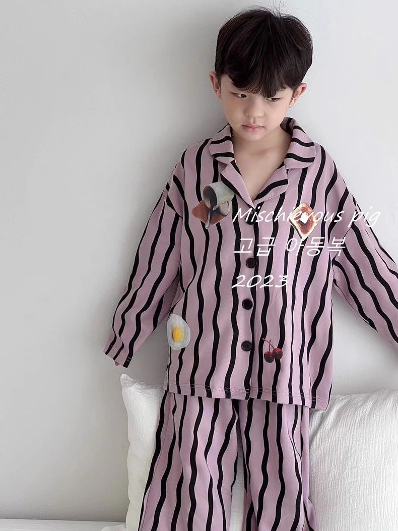한국 스타일 아동 의류 소녀 홈 의류 세트 2025 가을 소년 잠옷 줄무늬 어린이 긴팔 바지 투피스 세트스토어 가기