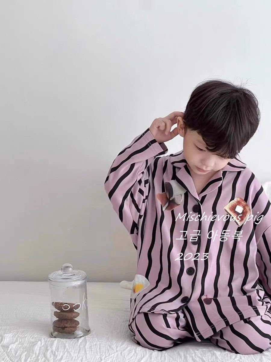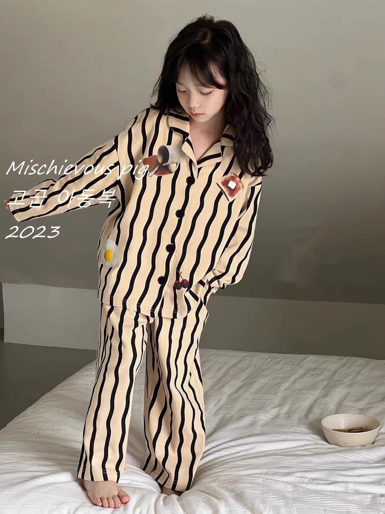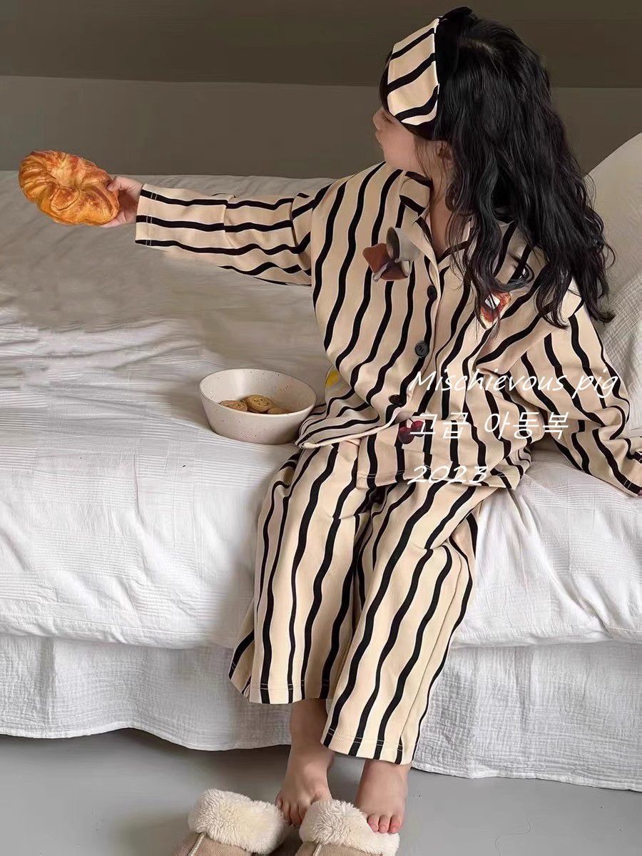 한국 스타일 아동 의류 소녀 홈 의류 세트 2025 가을 소년 잠옷 줄무늬 어린이 긴팔 바지 투피스 세트
