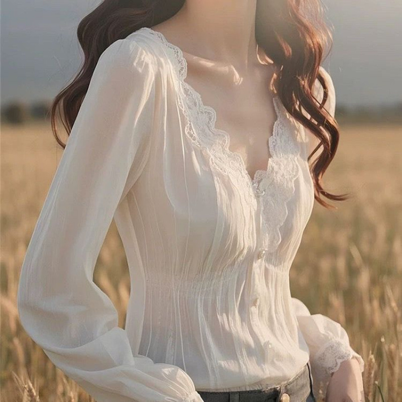 프랑스 스타일, 아름답고 독특하고 패셔너블하며 틈새시장, 가벼운 럭셔리, 연령 감소, 고급 화이트 레이스 셔츠 탑스토어 가기