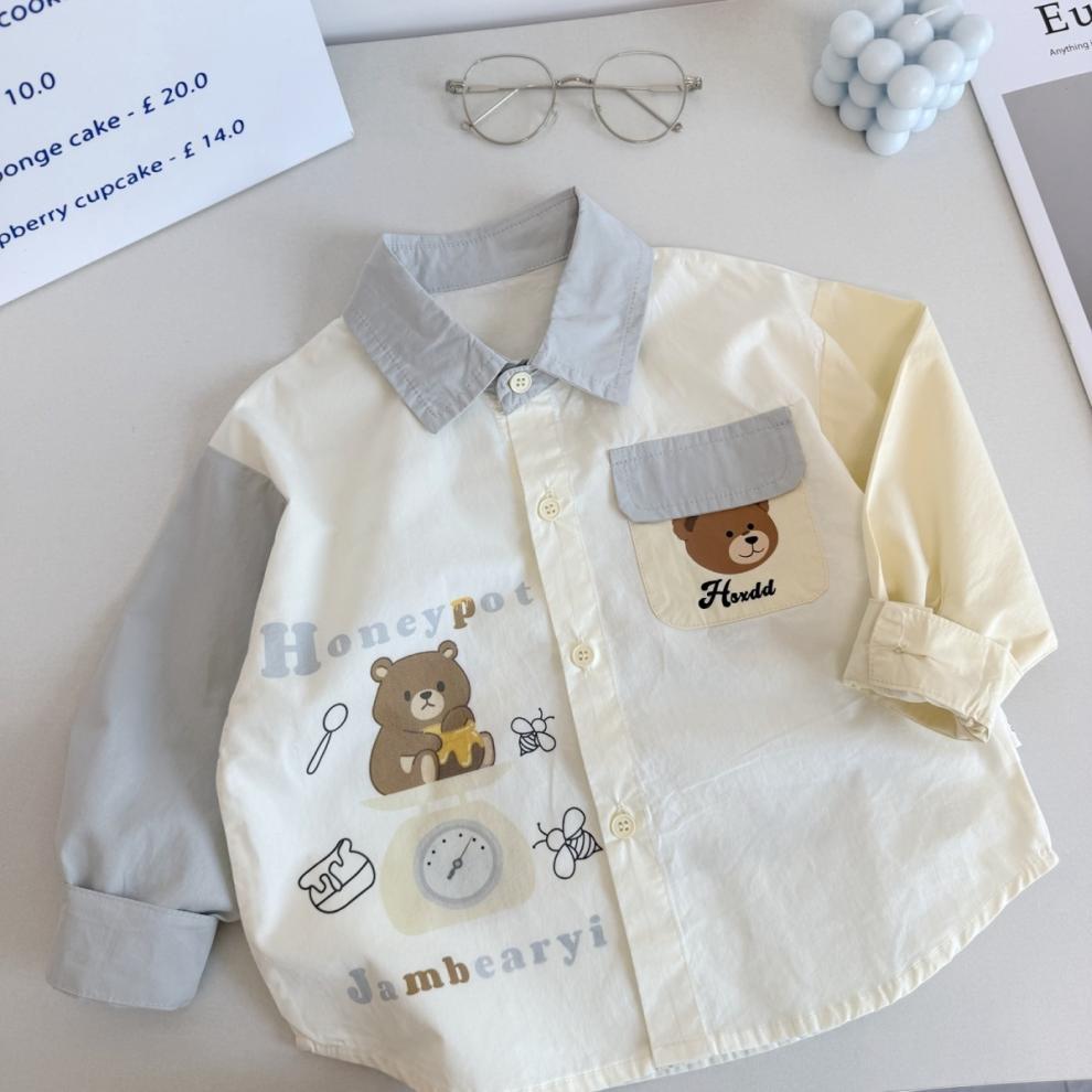 아동용 서양식 셔츠 ~ 봄 신작 귀여운 컬러 블록 탑 소년 아기 만화 한국식 캐주얼 셔츠 유행